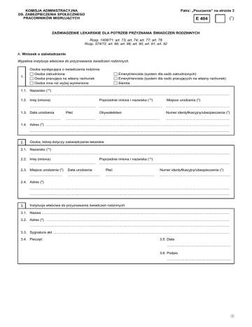 Patrz: „Pouczenie” na stronie 3 KOMISJA ADMINISTRACYJNA DS. ZABEZPIECZENIA SPOŁECZNEGO PRACOWNIKÓW MIGRUJĄCYCH E 404 (1) ZAŚWIADZENIE LEKARSKIE DLA POTRZEB PRZYZNANIA ŚWIADCZEŃ RODZINNYCH Rozp. 1408/71: art. 73; art. 74; art. 77; art. 78 Rozp. 574/72: art. 86; art. 88; art. 90; art. 91; art. 92 A. Wniosek o zaświadczenie Wypełnia instytucja właściwa do przyznawania świadczeń rodzinnych. 1. Osoba występująca o świadczenia rodzinne n Osoba zatrudniona n Osoba pracująca na własny rachunek n Osoba inna niż wyżej wymienione n Emeryt/rencista (system dla osób zatrudnionych) n Emeryt/rencista (system dla osób pracujących na własny rachunek) n Sierota 1.1. Nazwisko (1a) .................................................................................................................................................................................................................................... Poprzednie imiona i nazwiska (1a) Miejsce urodzenia (2) ........................................................................ ......................................................................... Płeć Obywatelstwo Numer identyfikacyjny/ubezpieczenia (3) .................................. ..................................................................... ......................................................................... 1.2. Imię (imiona) ........................................................................... 1.3. Data urodzenia ................................... 4 1.4. Adres ( ) .................................................................................................................................................................................................................. .................................................................................................................................................................................................................................... 2. Osoba, której dotyczy zaświadczenie lekarskie 2.1. Nazwisko (1a) .................................................................................................................................................................................................................................... Poprzednie imiona i nazwiska (1a) 2.2. Imię (imiona) ........................................................................... 2.3. Miejsce urodzenia (2) ..................................... ..................................................................................................................................................... Data urodzenia Płeć Numer identyfikacyjny/ubezpieczenia (3) ..................................... ........................................................ ................................................................................. 2.4. Adres (4) .................................................................................................................................................................................................................................... .................................................................................................................................................................................................................................... 3. Instytucja właściwa do przyznawania świadczeń rodzinnych 3.1. Nazwa ...................................................................................................................................................................................................................... 3.2. Adres (4) .................................................................................................................................................................................................................. .................................................................................................................................................................................................................................... 3.3. Sygnatura akt ......................................................................................................................................................................................................... 3.4. Pieczęć 3.5. Data ......................................................................... 3.6. Podpis ......................................................................... 1 E 404 B. Zaświadczenie Wypełnia lekarz wyznaczony przez instytucję łącznikową (5) (6) w państwie zamieszkania osoby badanej i przesyła do instytucji wymienionej w punkcie 3. 4. 4.1. a) Zdolności fizyczne lub umysłowe badanej osoby n zmniejszyły się n nie zmniejszyły się Jeśli tak, proszę podać wielkość ubytku: .................................... % b) Osoba badana n jest w stanie zarabiać na swoje utrzymanie n nie jest w stanie zarabiać na swoje utrzymanie z powodu ograniczenia zdolności fizycznych lub umysłowych, a kontynuuje naukę na szkoleniu zawodowym c) Osoba badana Jeśli tak, proszę wskazać czy: n jest n nie jest gospodynią domową n jest n nie jest w stanie dbać o dom d) Uwagi: ............................................................................................................................................................................................................................... ............................................................................................................................................................................................................................... ............................................................................................................................................................................................................................... e) Opis stanu osoby badanej: .........................................................................................