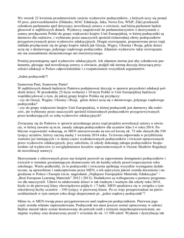 We wtorek 22 kwietnia przedstawiciele sześciu wydawców podręczników, z których uczy się ponad 95 proc. pierwszoklasistów (Didasko, MAC Edukacja, Juka, Nowa Era, WSiP, Żak) przekazali członkom parlamentu apel dotyczący nowelizacji ustawy o oświacie, nad którą parlament będzie głosował w najbliższych dniach. Wydawcy zaapelowali do parlamentarzystów o skorzystanie z szansy przyłączenia Polski do grupy większości krajów Unii Europejskiej, w której podręczniki są darmowe dla rodziców, i wybierane przez nauczycieli spośród różnorodnej oferty podręczników przygotowywanych przez wydawców edukacyjnych. Drugie rozwiązanie, proponowane przez rząd, zakłada przyłączenie się do grupy krajów takich jak Grecja, Węgry, Ukraina i Rosja, gdzie dzieci uczą się z darmowego, jedynego rządowego podręcznika. Zdaniem wydawców takie rozwiązanie nie ma uzasadnienia ekonomicznego ani merytorycznego. Poniżej prezentujemy apel wydawców edukacyjnych. Ich zdaniem istotne jest aby członkowie parlamentu, głosując nad nowelizacją ustawy o oświacie, podjęli tak istotną decyzję dotyczącą przyszłości edukacji w Polsce odpowiedzialnie i z rozpatrzeniem wszystkich argumentów. „Jeden podręcznik?! Szanowna Pani, Szanowny Panie! W najbliższych dniach będziecie Państwo podejmować decyzję w sprawie przyszłości edukacji polskich dzieci. W przededniu 25-lecia wolności i 10-lecia Polski w Unii Europejskiej będziecie współdecydować o tym, do jakiej grupy krajów Polska się przyłączy: - czy do Grecji, Węgier, Ukrainy i Rosji, gdzie dzieci uczą się z darmowego, jedynego rządowego podręcznika? - czy do grupy większości krajów Unii Europejskiej, w której podręcznik jest darmowy dla rodziców, ale wybierany przez nauczycieli spośród różnorodnych podręczników przygotowywanych przez konkurujących ze sobą wydawców edukacyjnych? Zwracamy się do Państwa w sprawie przesłanego przez rząd projektu nowelizacji ustawy o oświacie, w której zawarte są m.in. zasady zakupu podręczników dla uczniów klas I w roku 2014. Publiczne wypowiedzi wskazują, że MEN zarezerwowało na ten cel kwotę ok. 73 mln złotych dla 550 tysięcy uczniów, którzy zaczną naukę 1 września 2014 roku. Ta kwota odpowiada w przybliżeniu wartości już istniejących i w dużej części wydrukowanych podręczników i ćwiczeń opracowanych przez wydawców edukacyjnych, przy założeniu, iż szkoły dokonują zakupu podręczników bezpośrednio od wydawców (z uwzględnieniem kosztów zaprezentowanych w Ocenie Skutków Regulacji do nowelizacji ustawy). Skorzystanie z oferowanych przez nas książek pozwoli na zapewnienie dostępności podręczników i ćwiczeń w terminie gwarantującym dostarczenie ich do każdej szkoły przed rozpoczęciem roku szkolnego. Warto podkreślić, że te podręczniki i ćwiczenia spełniają wszystkie wymagania dydaktyczne, są sprawdzone i zaakceptowane przez MEN, a ich najwyższa jakość została doceniona i nagrodzona w Polsce i Europie (m.in. nagrodami „Najlepsze Europejskie Materiały Edukacyjne” / „Best European Learning Materials” 2012 i 2013). Dodatkowo są wzbogacone o pomoce programowe dla nauczycieli. Ułatwi to edukowanie dzieci w tak trudnym i ważnym dla szkoły roku 2014, kiedy to do pierwszej klasy obowiązkowo pójdą 6- i 7-latki. MEN spodziewa się w związku z tym rekordowej liczby uczniów – 550 tysięcy w pierwszej klasie. Po co więc przeprowadzać na pierwszoklasistach w tym samym roku drugi eksperyment pt. „jeden rządowy podręcznik”? Mimo to, w MEN trwają prace przygotowawcze nad rządowym podręcznikiem. Pierwsza jego część została właśnie zaprezentowana. Podręcznik ten musi jeszcze zostać opracowany w całości. Będzie musiał także zostać dostosowany do potrzeb osób z różnymi niepełnosprawnościami, następnie wydany oraz dostarczony przed 1 września do ok. 13 500 szkół. Wydanie i dystrybucja tak ważnego podręcznika dla ponad pół miliona uczniów w tak ekspresowym tempie budzi niepokój o jakość edukacji. W jakim celu MEN podejmuje to ryzyko? Oficjalnie chodziło o obniżenie cen. Rozumiemy to i uważamy, że możliwe jest zapewnienie istniejących już podręczników w ramach środków zabezpieczonych w budżecie. Po co więc MEN chce stać się konkurentem wydawnictw edukacyjnych? Dlaczego dzieci w szkołach publicznych mają uczyć się tylko z jednego, rządowego podręcznika? Takie rozwiązanie zwiększy rozwarstwienie społeczne i ryzyko ideologizacji edukacji! Jednocześnie, wydawcy dysponują już gotowymi podręcznikami, adekwatnymi do różnych stylów nauczania i wychowania, sprawdzonymi w praktyce i dopuszczonymi do użytku szkolnego przez MEN. Wierzymy, że wciąż nie jest za późno na takie zmiany, aby popierana przez nas idea darmowego podręcznika nie oznaczała obniżenia jakości edukacji, podwójnego eksperymentu na dzieciach i likwidacji tysięcy miejsc pracy w wydawnictwach edukacyjnych oraz w lokalnych księgarniach. Wierzymy również, że nasze podręczniki nie zostaną bezsensownie zniszczone, lecz będą mogły służyć polskim dzieciom. Przekazujemy dzisiaj próbkę jednego z takich podręczników. Apelujemy o uwzględnienie najważniejszych postulatów zgłoszonych do MEN przez wydawców i wiele innych środowisk w czasie tzw. konsultacji społecznych. Apelujemy o to, abyście skorzystali Państwo z szansy przyłączenia Polski do grupy większości krajów Unii Europejskiej, w której podręcznik jest darmowy dla rodziców, ale wybierany przez nauczycieli spośród różnorodnych podręczników przygotowywanych przez wydawców edukacyjnych. W Państwa ręce, Piotr Białobrzeski (Didasko), Seweryn Kubicki (MAC Edukacja, JUKA), Magdalena Duszyńska-Walczak (Nowa Era), Jerzy Garlicki (WSiP), Agnieszka Ostapowicz (Żak). Z naszych podręczników uczy się ponad 95 proc. pierwszoklasistów!”