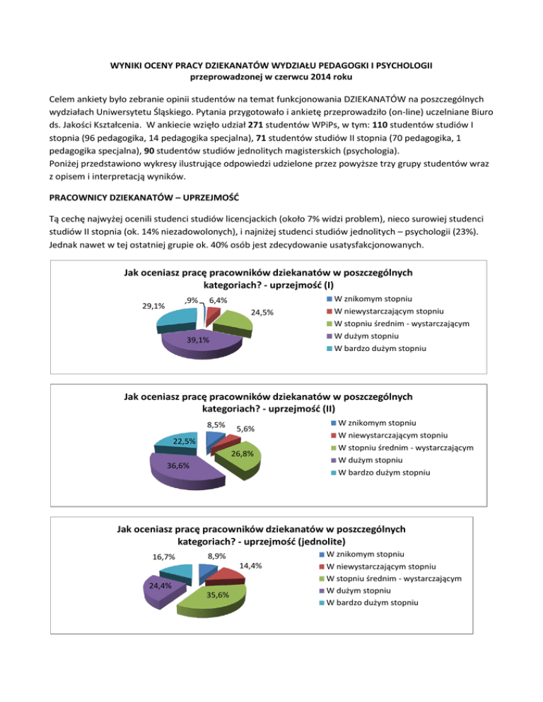 WYNIKI OCENY PRACY DZIEKANATÓW WYDZIAŁU PEDAGOGKI I PSYCHOLOGII przeprowadzonej w czerwcu 2014 roku Celem ankiety było zebranie opinii studentów na temat funkcjonowania DZIEKANATÓW na poszczególnych wydziałach Uniwersytetu Śląskiego. Pytania przygotowało i ankietę przeprowadziło (on-line) uczelniane Biuro ds. Jakości Kształcenia. W ankiecie wzięło udział 271 studentów WPiPs, w tym: 110 studentów studiów I stopnia (96 pedagogika, 14 pedagogika specjalna), 71 studentów studiów II stopnia (70 pedagogika, 1 pedagogika specjalna), 90 studentów studiów jednolitych magisterskich (psychologia). Poniżej przedstawiono wykresy ilustrujące odpowiedzi udzielone przez powyższe trzy grupy studentów wraz z opisem i interpretacją wyników. PRACOWNICY DZIEKANATÓW – UPRZEJMOŚĆ Tą cechę najwyżej ocenili studenci studiów licencjackich (około 7% widzi problem), nieco surowiej studenci studiów II stopnia (ok. 14% niezadowolonych), i najniżej studenci studiów jednolitych – psychologii (23%). Jednak nawet w tej ostatniej grupie ok. 40% osób jest zdecydowanie usatysfakcjonowanych. Jak oceniasz pracę pracowników dziekanatów w poszczególnych kategoriach? - uprzejmość (I) ,9% 29,1% 6,4% 24,5% 39,1% W znikomym stopniu W niewystarczającym stopniu W stopniu średnim - wystarczającym W dużym stopniu W bardzo dużym stopniu Jak oceniasz pracę pracowników dziekanatów w poszczególnych kategoriach? - uprzejmość (II) 8,5% 5,6% 22,5% 26,8% 36,6% W znikomym stopniu W niewystarczającym stopniu W stopniu średnim - wystarczającym W dużym stopniu W bardzo dużym stopniu Jak oceniasz pracę pracowników dziekanatów w poszczególnych kategoriach? - uprzejmość (jednolite) 16,7% 8,9% 14,4% 24,4% 35,6% W znikomym stopniu W niewystarczającym stopniu W stopniu średnim - wystarczającym W dużym stopniu W bardzo dużym stopniu PRACOWNICY DZIEKANATÓW – ŻYCZLIWOŚĆ Oceny życzliwości dokonywane przez studentów pedagogiki (I i II stopnia) są bardzo zbliżone do ocen uprzejmości. Nieco inaczej jest w przypadku ocen studentów psychologii – ok. 30% spostrzega brak życzliwości w działaniach pracownika. Jak oceniasz pracę pracowników dziekanatów w poszczególnych kategoriach? - życzliwość (I) ,9% 7,3% 28,2% W znikomym stopniu 26,4% 36,4% W niewystarczającym stopniu W stopniu średnim - wystarczającym W dużym stopniu W bardzo dużym stopniu Jak oceniasz pracę pracowników dziekanatów w poszczególnych kategoriach? - życzliwość (II) 7,0% 7,0% W znikomym stopniu W niewystarczającym stopniu 23,9% 26,8% 35,2% W stopniu średnim - wystarczającym W dużym stopniu W bardzo dużym stopniu Jak oceniasz pracę pracowników dziekanatów w poszczególnych kategoriach? - życzliwość (jednolite) 13,3% W znikomym stopniu 6,7% 24,4% 22,2% W niewystarczającym stopniu W stopniu średnim - wystarczającym 33,3% W dużym stopniu W bardzo dużym stopniu PRACOWNICY DZIEKANATÓW – KOMUNIKATYWNOŚĆ Ponownie najwyżej ocenili pracownika licencjaci (ok. 6% niezadowolonych), natomiast studenci studiów II stopnia (pedagogika) i jednolitych (psychologia) – wykazywali nieco większe niezadowolenie (odpowiednio: ok.18 i 17%). Osób bardzo zadowolonych najwięcej było wśród licencjatów, a najmniej wśród studentów studiów jednolitych. Jak oceniasz pracę pracowników dziekanatów w poszczególnych kategoriach? - komunikatywność (I) ,9% 25,5% 5,5% W znikomym stopniu W niewystarczającym stopniu 25,5% W stopniu średnim - wystarczającym 41,8% W dużym stopniu W bardzo dużym stopniu Jak oceniasz pracę pracowników dziekanatów w poszczególnych kategoriach? - komunikatywność (II) 8,5% 26,8% W znikomym stopniu 9,9% W niewystarczającym stopniu W stopniu średnim - wystarczającym 32,4% 22,5% W dużym stopniu W bardzo dużym stopniu Jak oceniasz pracę pracowników dziekanatów w poszczególnych kategoriach? komunikatywność (jednolite) 6,7% 10,0% 18,9% 27,8% 36,7% W znikomym stopniu W niewystarczającym stopniu W stopniu średnim - wystarczającym W dużym stopniu W bardzo dużym stopniu PRACOWNICY DZIEKANATÓW – KOMPETENCJA Podobnie jak poprzednio, najwyższe są oceny licencjatów. Jak oceniasz pracę pracowników dziekanatów w poszczególnych kategoriach? - kompetencja (I) 0 5,5% 26,4% 20,0% 46,4% W niewystarczającym stopniu W stopniu średnim - wystarczającym W dużym stopniu W bardzo dużym stopniu Jak oceniasz pracę pracowników dziekanatów w poszczególnych kategoriach? - kompetencja (II) 2,8% 8,5% 33,8% 28,2% 25,4% W znikomym stopniu W niewystarczającym stopniu W stopniu średnim - wystarczającym W dużym stopniu W bardzo dużym stopniu Jak oceniasz pracę pracowników dziekanatów w poszczególnych kategoriach? - kompetencja (jednolite) 18,9% 35,6% 3,3% 10,0% 32,2% W znikomym stopniu W niewystarczającym stopniu W stopniu średnim - wystarczającym W dużym stopniu W bardzo dużym stopniu PRACOWNICY DZIEKANATÓW – RZETELNOŚĆ Ponownie najwyżej oceniają tę cechę licencjaci (ok. 8% niezadowolonych), nieco lepiej studenci II stopnia (ok. 13% niezadowolonych) oraz studenci studiów jednolitych (ok. 18% niezadowolonych). Jak oceniasz pracę pracowników dziekanatów w poszczególnych kategoriach? - rzetelność (I) ,9% 7,3% 20,9% 27,3% 41,8% W znikomym stopniu W niewystarczającym stopniu W stopniu średnim - wystarczającym W dużym stopniu W bardzo dużym stopniu Jak oceniasz pracę pracowników dziekanatów w poszczególnych kategoriach? - rzetelność (II) 7,0% 5,6% 31,0% 22,5% 33,8% W znikomym stopniu W niewystarczającym stopniu W stopniu średnim - wystarczającym W dużym stopniu W bardzo dużym stopniu Jak oceniasz pracę pracowników dziekanatów w poszczególnych kategoriach? - rzetelność (jednolite) 17,8% 3,3% 14,4% W znikomym stopniu W niewystarczającym stopniu 34,4% 30,0% W stopniu średnim - wystarczającym W dużym stopniu W bardzo dużym stopniu PRACOWNICY DZIEKANATÓW – SPRAWNOŚĆ ORGANIZACYJNA Sprawność organizacyj