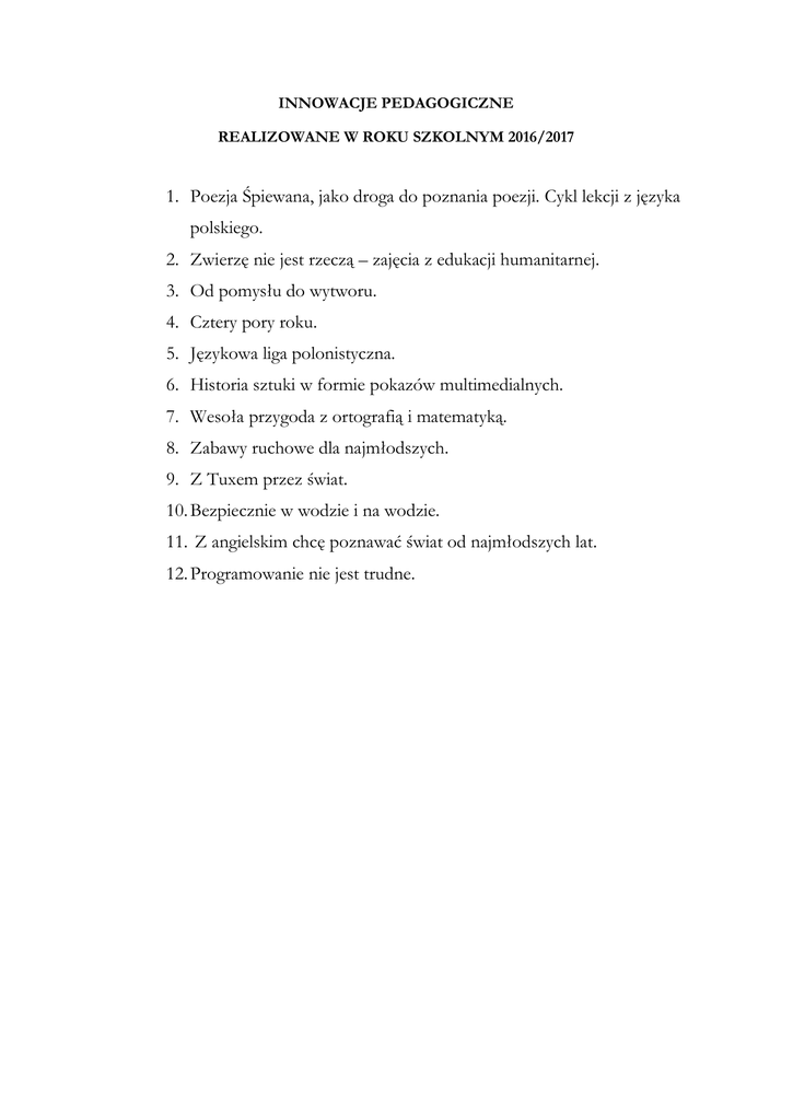 INNOWACJE PEDAGOGICZNE REALIZOWANE W ROKU SZKOLNYM 2016/2017 1. Poezja Śpiewana, jako droga do poznania poezji. Cykl lekcji z języka polskiego. 2. Zwierzę nie jest rzeczą – zajęcia z edukacji humanitarnej. 3. Od pomysłu do wytworu. 4. Cztery pory roku. 5. Językowa liga polonistyczna. 6. Historia sztuki w formie pokazów multimedialnych. 7. Wesoła przygoda z ortografią i matematyką. 8. Zabawy ruchowe dla najmłodszych. 9. Z Tuxem przez świat. 10. Bezpiecznie w wodzie i na wodzie. 11. Z angielskim chcę poznawać świat od najmłodszych lat. 12. Programowanie nie jest trudne.