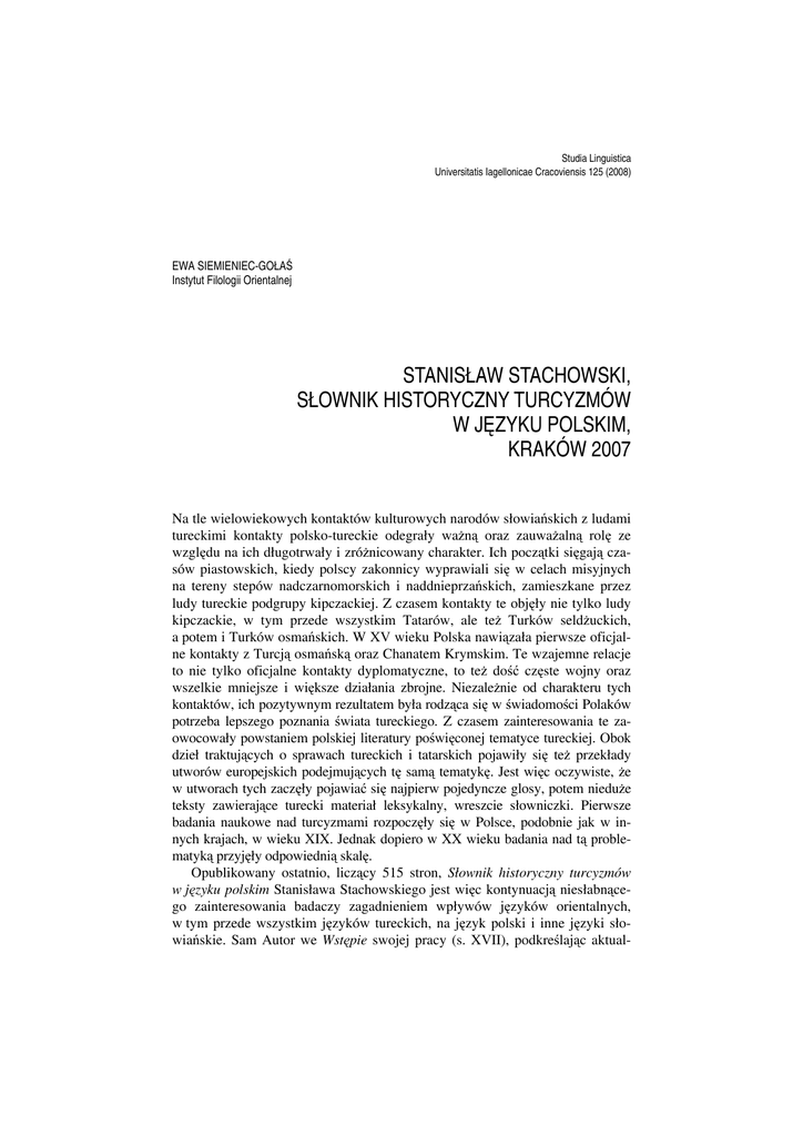 Studia Linguistica Universitatis Iagellonicae Cracoviensis 125 (2008) EWA SIEMIENIEC-GOŁAŚ Instytut Filologii Orientalnej STANISŁAW STACHOWSKI, SŁOWNIK HISTORYCZNY TURCYZMÓW W JĘZYKU POLSKIM, KRAKÓW 2007 Na tle wielowiekowych kontaktów kulturowych narodów słowiańskich z ludami tureckimi kontakty polsko-tureckie odegrały ważną oraz zauważalną rolę ze względu na ich długotrwały i zróżnicowany charakter. Ich początki sięgają czasów piastowskich, kiedy polscy zakonnicy wyprawiali się w celach misyjnych na tereny stepów nadczarnomorskich i naddnieprzańskich, zamieszkane przez ludy tureckie podgrupy kipczackiej. Z czasem kontakty te objęły nie tylko ludy kipczackie, w tym przede wszystkim Tatarów, ale też Turków seldżuckich, a potem i Turków osmańskich. W XV wieku Polska nawiązała pierwsze oficjalne kontakty z Turcją osmańską oraz Chanatem Krymskim. Te wzajemne relacje to nie tylko oficjalne kontakty dyplomatyczne, to też dość częste wojny oraz wszelkie mniejsze i większe działania zbrojne. Niezależnie od charakteru tych kontaktów, ich pozytywnym rezultatem była rodząca się w świadomości Polaków potrzeba lepszego poznania świata tureckiego. Z czasem zainteresowania te zaowocowały powstaniem polskiej literatury poświęconej tematyce tureckiej. Obok dzieł traktujących o sprawach tureckich i tatarskich pojawiły się też przekłady utworów europejskich podejmujących tę samą tematykę. Jest więc oczywiste, że w utworach tych zaczęły pojawiać się najpierw pojedyncze glosy, potem nieduże teksty zawierające turecki materiał leksykalny, wreszcie słowniczki. Pierwsze badania naukowe nad turcyzmami rozpoczęły się w Polsce, podobnie jak w innych krajach, w wieku XIX. Jednak dopiero w XX wieku badania nad tą problematyką przyjęły odpowiednią skalę. Opublikowany ostatnio, liczący 515 stron, Słownik historyczny turcyzmów w języku polskim Stanisława Stachowskiego jest więc kontynuacją niesłabnącego zainteresowania badaczy zagadnieniem wpływów języków orientalnych, w tym przede wszystkim języków tureckich, na język polski i inne języki słowiańskie. Sam Autor we Wstępie swojej pracy (s. XVII), podkreślając aktual- 202 EWA SIEMIENIEC-GOŁAŚ ność i ważność tych badań, przytacza fragment wypowiedzi twórcy polskiej orientalistyki – profesora Tadeusza Kowalskiego, który na I Międzynarodowym Kongresie Slawistów w Pradze w 1929 roku stwierdził: „Idzie tu [...] o jedną z ciekawszych kart historii kultury narodów słowiańskich i ich roli pośredniczącej między Wschodem a Zachodem”. Niemniej jednak pracę Stanisława Stachowskiego od innych, licznych publikacji poświęconych tej tematyce odróżnia jedna zasadnicza cecha. Autor podjął się zadania niezwykle ważnego i niewątpliwie pionierskiego, jakim jest opracowanie słownika historycznego turcyzmów obecnych w języku polskim. To pierwsza i jedyna, jak na razie, tak obszerna publikacja będąca zbiorem słownictwa pochodzenia orientalnego, które za pośrednictwem języków tureckich (tatarskiego i osmańsko-tureckiego) przenikało do języka polskiego. Stanisław Stachowski zgromadził w swojej pracy niezwykle bogaty materiał leksykalny – według mojego szacunku to ponad trzy tysiące wyrazów. Podstawę do opracowania omawianego dzieła stanowiły obszerne słowniki historyczne, dawne słowniki języka polskiego, liczne artykuły poświęcone turcyzmom oraz wiele tekstów zawierających turecki materiał leksykalny. W sumie, Stanisław Stachowski, dokonując ekscerpcji materiału leksykalnego, wykorzystał ponad 200 źródeł. Słownik rozpoczyna się Wstępem (s. V–XVIII), w którym Autor przedstawia następujące zagadnienia: historię turecko-słowiańskich kontaktów językowych, warstwy etymologiczne słowiańskich turcyzmów oraz historię badań turcyzmów polskich, w tym historię badań prowadzonych w XIX i XX wieku. Również w tej części słownika Autor określa cel pracy, przedstawia źródła oraz omawia budowę poszczególnych haseł słownikowych. Kolejna część – Rozwiązanie skrótów (s. XIX–XXXVI) – to jednocześnie prezentacja wykorzystanych w pracy źródeł. Następnie Autor przedstawia pozycje literaturowe tworzące rozdział nazwany Literatura przedmiotu (s. XXXVII–L). Z osobną paginacją według numeracji arabskiej, na stronach od 1 do 469 znajduje się część stanowiąca trzon pracy, czyli Słownik. Zebrane tu turcyzmy są jeszcze raz zestawione, tym razem w formie indeksu, w części pracy zatytułowanej Indeks chronologiczny turcyzmów (s. 471–514). Całość kończy Spis treści (s. 515). Najobszerniejszą, a zarazem główną część stanowi materiał zebrany w formie słownika. Na bez mała 500 stronach Autor zgromadził w uporządkowanej alfabetycznie formie bardzo bogaty zbiór polskich turcyzmów. Po każdym wyrazie hasłowym podane jest jego znaczenie. Następnie Autor przytacza dokumentację historyczną dla danego wyrazu wraz z datacją i symbolem źródła, zawierającego dany leksem. Jeśli od wyrazu hasłowego utworzone zostały derywaty, przytaczane są one również, razem z odpowiednim kontekstem. Derywaty, dla lepszego odróżnienia od głównych haseł, zapisano kursywą. W tym, jakże starannie opracowanym dziele, trudno dopatrzyć się jakichkolwiek pomyłek czy błędów. Niemniej, analizując zebrany w Słowniku materiał leksykalny, zwróciłam uwagę na kilka wyrazów, co do których proponowałabym inne znaczenie, czy też inny odczyt. Przy objaśnianiu hasła azechyche (s. 26) Autor, zamiast znaczenia, umieszcza jedynie znak zapytania. Co prawda, cytowany kontekst historyczny podpowiada niejako znaczenie („... to jest sułta- Recenzje 203 na krolowa”), Autor jednak nie korzysta z tego objaśnienia. Forma azechyche jest oczywiście mocno zdeformowaną postacią tureckiego słowa haseki, co oznacza ‘ulubiona żona sułtana, czyli ta, która powiła mu syn
