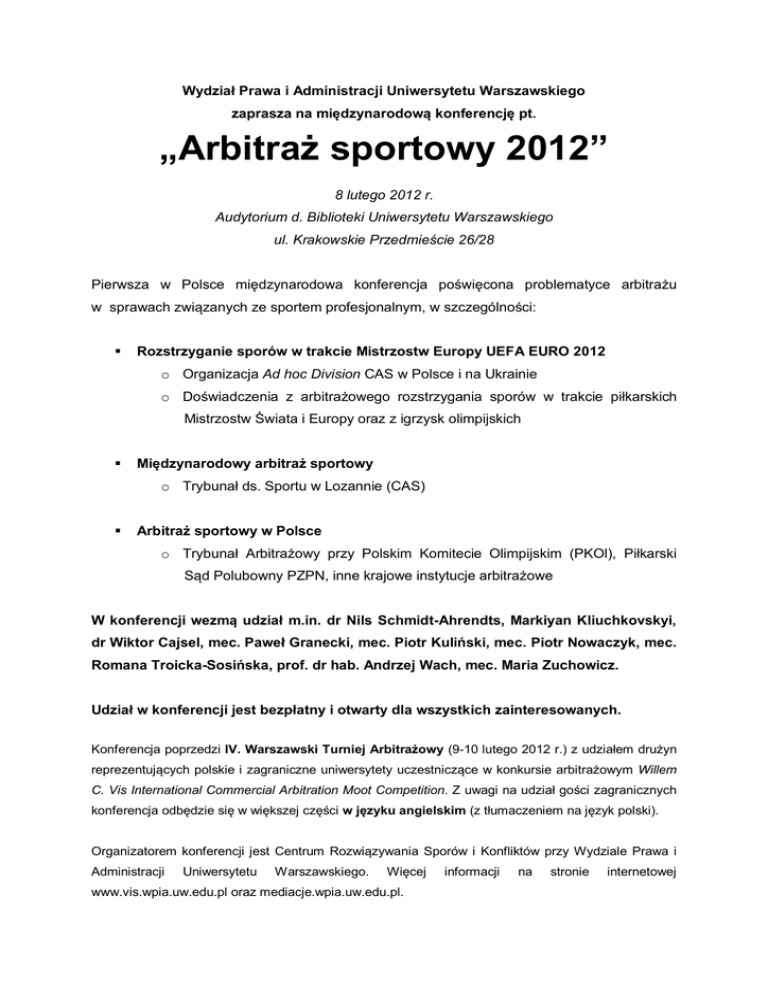 Wydział Prawa i Administracji Uniwersytetu Warszawskiego zaprasza na międzynarodową konferencję pt. „Arbitraż sportowy 2012” 8 lutego 2012 r. Audytorium d. Biblioteki Uniwersytetu Warszawskiego ul. Krakowskie Przedmieście 26/28 Pierwsza w Polsce międzynarodowa konferencja poświęcona problematyce arbitrażu w sprawach związanych ze sportem profesjonalnym, w szczególności: Rozstrzyganie sporów w trakcie Mistrzostw Europy UEFA EURO 2012 o Organizacja Ad hoc Division CAS w Polsce i na Ukrainie o Doświadczenia z arbitrażowego rozstrzygania sporów w trakcie piłkarskich Mistrzostw Świata i Europy oraz z igrzysk olimpijskich Międzynarodowy arbitraż sportowy o Trybunał ds. Sportu w Lozannie (CAS) Arbitraż sportowy w Polsce o Trybunał Arbitrażowy przy Polskim Komitecie Olimpijskim (PKOl), Piłkarski Sąd Polubowny PZPN, inne krajowe instytucje arbitrażowe W konferencji wezmą udział m.in. dr Nils Schmidt-Ahrendts, Markiyan Kliuchkovskyi, dr Wiktor Cajsel, mec. Paweł Granecki, mec. Piotr Kuliński, mec. Piotr Nowaczyk, mec. Romana Troicka-Sosińska, prof. dr hab. Andrzej Wach, mec. Maria Zuchowicz. Udział w konferencji jest bezpłatny i otwarty dla wszystkich zainteresowanych. Konferencja poprzedzi IV. Warszawski Turniej Arbitrażowy (9-10 lutego 2012 r.) z udziałem drużyn reprezentujących polskie i zagraniczne uniwersytety uczestniczące w konkursie arbitrażowym Willem C. Vis International Commercial Arbitration Moot Competition. Z uwagi na udział gości zagranicznych konferencja odbędzie się w większej części w języku angielskim (z tłumaczeniem na język polski). Organizatorem konferencji jest Centrum Rozwiązywania Sporów i Konfliktów przy Wydziale Prawa i Administracji Uniwersytetu Warszawskiego. Więcej www.vis.wpia.uw.edu.pl oraz mediacje.wpia.uw.edu.pl. informacji na stronie internetowej