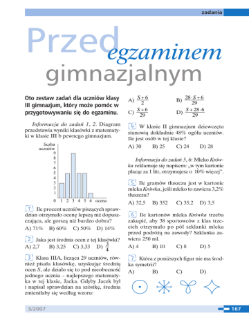 zadania Przedegzaminem gimnazjalnym Oto zestaw zadań dla uczniów klasy III gimnazjum, który może pomóc w przygotowywaniu się do egzaminu. Informacja do zadań 1, 2. Diagram przedstawia wyniki klasówki z matematyki w klasie III b pewnego gimnazjum. S+6 2 S+6 C) 29 28 £ S + 6 29 S + 28£ 6 D) 29 B) A) W klasie II gimnazjum dziewczęta stanowią dokładnie 48% ogółu uczniów. Ile jest osób w tej klasie? A) 30 B) 25 C) 24 D) 28 Informacja do zadań 5, 6: Mleko Krówka reklamuje się napisem: „w tym kartonie płacąc za 1 litr, otrzymujesz o 10% więcej”. Ile gramów tłuszczu jest w kartonie mleka Krówka, jeśli mleko to zawiera 3,2% tłuszczu? A) 32,5 Ile procent uczniów piszących sprawdzian otrzymało ocenę lepszą niż dopuszczająca, ale gorszą niż bardzo dobra? A) 71% B) 60% C) 50% D) 14% Jaka jest średnia ocen z tej klasówki? 3 A) 2,7 B) 3,25 C) 3,33 D) 4 Klasa IIIA, licząca 29 uczniów, również pisała klasówkę, uzyskując średnią ocen S, ale działo się to pod nieobecność jednego ucznia – najlepszego matematyka w tej klasie, Jacka. Gdyby Jacek był i napisał sprawdzian na szóstkę, średnia zmieniłaby się według wzoru: 3/2007 B) 352 C) 35,2 D) 3,5 Ile kartonów mleka Krówka trzeba zakupić, aby 38 sportowców z klas trzecich otrzymało po pół szklanki mleka przed podróżą na zawody? Szklanka zawiera 250 ml. A) 4 B) 10 C) 8 D) 5 Która z poniższych figur nie ma środka symetrii? A) B) C) D) 167 zadania Informacja do zadań 8–11. Pan Kowalski ma 3 km z domu do biura, w którym pracuje. Wychodzi z domu o godzinie 7.15. Dla utrzymania formy biegnie pierwszy kilometr z prędkością 12 km/h, a potem przez 5 minut odpoczywa, siedząc na ławce. Po dalszych 15 minutach szybkiego marszu i kupieniu w kiosku gazety, co zajmuje 2 minuty, idzie już wolnym krokiem przez kolejne 13 minut i dochodzi do miejsca pracy. Ile czasu trwa poranny bieg pana Kowalskiego? A) 10 min. B) 5 min. C) 12 min. D) 6 min. O której godzinie pan Kowalski wchodzi do biura? A) O 7.45 B) O 7.55 C) O 8.00 D) O 8.15 Jaka jest średnia prędkość, z jaką pan Kowalski podąża rano do pracy? A) 5,5 km/h B) 6 km/h C) 12 km/h D) 4,5 km/h Który z poniższych wykresów opisuje zależność drogi przebytej przez pana Kowalskiego od czasu? A) B) C) D) Informacja do zadań 12–14: Tunel foliowy do uprawy chryzantem rozpięty jest na półkolistych pałąkach o długości 5 m. Ile metrów sześciennych powietrza mieści się w takim tunelu, którego długość wynosi 10 metrów? 168 A) ok. 40 m3 C) ok. 125 m3 B) ok. 80 m3 D) ok. 250 m3 Środkiem tunelu prowadzi ścieżka, a po obu jej stronach ustawiono po dwa rzędy doniczek o średnicy 20 cm tak jak na rysunku. Które wyrażenie opisuje liczbę doniczek, jakie w ten sposób mieszczą się w tunelu o długości n metrów? B) 20n - 2 A) 10n - 1 C) 18n D) 9n Czy ogrodniczka o wzroście 1,60 m może wejść do tunelu bez schylania się? Zapisz obliczenia. W dniu swoich urodzin Julek, zdmuchując płomyczki świeczek na torcie obliczył, że za 6 lat będzie miał 2 razy więcej lat, niż miał 4 lata temu. Ile świeczek miał Julek na torcie? Zapisz obliczenia. Kartka papieru po złożeniu na pół jest prostokątem podobnym do całej kartki. Jaka jest skala tego podobieństwa? Wykonaj rysunek pomocniczy, wprowadź potrzebne oznaczenia, zapisz obliczenia. Dwa trójkąty prostokątne położone są i mają długości boków jak na rysunku. Oblicz długość odcinka x. Zapisz obliczenia. Zachęcamy do omówienia z uczniami pełnych rozwiązań zadań testowych, a nie tylko wybrania właściwej odpowiedzi. q Opracowanie redakcyjne matematyka