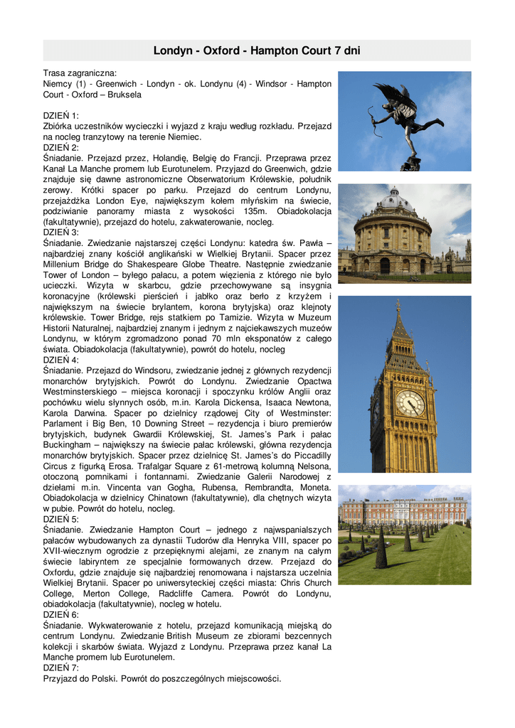 Londyn - Oxford - Hampton Court 7 dni Trasa zagraniczna: Niemcy (1) - Greenwich - Londyn - ok. Londynu (4) - Windsor - Hampton Court - Oxford – Bruksela DZIEŃ 1: Zbiórka uczestników wycieczki i wyjazd z kraju według rozkładu. Przejazd na nocleg tranzytowy na terenie Niemiec. DZIEŃ 2: Śniadanie. Przejazd przez, Holandię, Belgię do Francji. Przeprawa przez Kanał La Manche promem lub Eurotunelem. Przyjazd do Greenwich, gdzie znajduje się dawne astronomiczne Obserwatorium Królewskie, południk zerowy. Krótki spacer po parku. Przejazd do centrum Londynu, przejażdżka London Eye, największym kołem młyńskim na świecie, podziwianie panoramy miasta z wysokości 135m. Obiadokolacja (fakultatywnie), przejazd do hotelu, zakwaterowanie, nocleg. DZIEŃ 3: Śniadanie. Zwiedzanie najstarszej części Londynu: katedra św. Pawła – najbardziej znany kościół anglikański w Wielkiej Brytanii. Spacer przez Millenium Bridge do Shakespeare Globe Theatre. Następnie zwiedzanie Tower of London – byłego pałacu, a potem więzienia z którego nie było ucieczki. Wizyta w skarbcu, gdzie przechowywane są insygnia koronacyjne (królewski pierścień i jabłko oraz berło z krzyżem i największym na świecie brylantem, korona brytyjska) oraz klejnoty królewskie. Tower Bridge, rejs statkiem po Tamizie. Wizyta w Muzeum Historii Naturalnej, najbardziej znanym i jednym z najciekawszych muzeów Londynu, w którym zgromadzono ponad 70 mln eksponatów z całego świata. Obiadokolacja (fakultatywnie), powrót do hotelu, nocleg DZIEŃ 4: Śniadanie. Przejazd do Windsoru, zwiedzanie jednej z głównych rezydencji monarchów brytyjskich. Powrót do Londynu. Zwiedzanie Opactwa Westminsterskiego – miejsca koronacji i spoczynku królów Anglii oraz pochówku wielu słynnych osób, m.in. Karola Dickensa, Isaaca Newtona, Karola Darwina. Spacer po dzielnicy rządowej City of Westminster: Parlament i Big Ben, 10 Downing Street – rezydencja i biuro premierów brytyjskich, budynek Gwardii Królewskiej, St. James’s Park i pałac Buckingham – największy na świecie pałac królewski, główna rezydencja monarchów brytyjskich. Spacer przez dzielnicę St. James’s do Piccadilly Circus z figurką Erosa. Trafalgar Square z 61-metrową kolumną Nelsona, otoczoną pomnikami i fontannami. Zwiedzanie Galerii Narodowej z dziełami m.in. Vincenta van Gogha, Rubensa, Rembrandta, Moneta. Obiadokolacja w dzielnicy Chinatown (fakultatywnie), dla chętnych wizyta w pubie. Powrót do hotelu, nocleg. DZIEŃ 5: Śniadanie. Zwiedzanie Hampton Court – jednego z najwspanialszych pałaców wybudowanych za dynastii Tudorów dla Henryka VIII, spacer po XVII-wiecznym ogrodzie z przepięknymi alejami, ze znanym na całym świecie labiryntem ze specjalnie formowanych drzew. Przejazd do Oxfordu, gdzie znajduje się najbardziej renomowana i najstarsza uczelnia Wielkiej Brytanii. Spacer po uniwersyteckiej części miasta: Chris Church College, Merton College, Radcliffe Camera. Powrót do Londynu, obiadokolacja (fakultatywnie), nocleg w hotelu. DZIEŃ 6: Śniadanie. Wykwaterowanie z hotelu, przejazd komunikacją miejską do centrum Londynu. Zwiedzanie British Museum ze zbiorami bezcennych kolekcji i skarbów świata. Wyjazd z Londynu. Przeprawa przez kanał La Manche promem lub Eurotunelem. DZIEŃ 7: Przyjazd do Polski. Powrót do poszczególnych miejscowości. Program imprezy jest ramowy, kolejność zwiedzania może ulec zmianie. DOPŁATY OPCJONALNE: Dopłata do pokoju 1 – os.: 560 zł Dopłata do 4 obiadokolacji: 360 zł CENA IMPREZY OBEJMUJE: - przejazd autokarem (klimatyzacja, dvd, barek, wc) lub małym autokarem (klimatyzacja, dvd, barek) - przeprawę przez Kanał La Manche (Eurotunel lub prom) - 5 noclegów w hotelach**, w pokojach 2-osobowych z łazienką - 5 śniadań - opiekę pilota, program tyrystyczny, ubezpieczenie Signal Iduna (KL 10.000 EUR, NNW 15.000 PLN, bagaż 1.000 PLN) DODATKOWO PŁATNE: - pakiet do realizacji programu: 150 GBP (rezerwacje i wstępy do zwiedzanych obiektów, usługi przewodnickie, rejs po Tamizie, przejażdżka London Eye, bilety komunikacji miejskiej, zestaw słuchawkowy Tour Guide) płatny obligatoryjnie pilotowi wycieczki. WAŻNE INFORMACJE: 1 . Wycieczki będą realizowane w zależności od ilości uczestników w grupie: wygodnymi autokarami lub wygodnymi busami. 2 . Niektóre połączenia krajowe mogą być realizowane innymi środkami transportu niż autokar (bus, samochód osobowy, autokar liniowy, pociąg). Trasy antenowe obsługiwane są bez pilota. 3. Wyjazd *antenkowy za dopłatą z wybranego miasta organizowany przy minimum 6 os. wsiadających. W przypadku braku wymaganego min. 6 osób PBP OLSZTYN ma prawo anulować wyjazd z danej miejscowości. Anulacja wyjazdu nie upoważnia do bezkosztowej rezygnacji z wycieczki. W takim przypadku Klient wybiera wyjazd z innej miejscowości gwarantowanej. 4 . Podczas przejazdów krajowych w ramach niektórych wycieczek możliwe są przesiadki. 5 . Godziny i miejsca wsiadania mogą ulec zmianie, po wcześniejszym poinformowaniu Klienta. 6 . Pakiet do realizacji programu (rezerwacje i wstępy do zwiedzanych obiektów, usługi przewodnickie, bilety komunikacji miejskiej, opłaty klimatyczne oraz koszty zestawu słuchawkowego Tour Guide lub inne) nie jest ujęty w cenie imprezy wyrażonej w PLN. Cena pakietu do realizacji programu podana jest przy opisach poszczególnych wycieczek. Obligatoryjny koszt pakietu dotyczący realizacji programu jest kalkulowany przy grupie min. 40 osób. Przy mniejszej ilości uczestników cena pakietu zostanie przeliczona na odpowiednią ilość osób w grupie i podana do wiadomości uczestników przed wycieczką. Cena pakietu może być podwyższona maksymalnie o 25% podanej ceny w EUR/GBP/inna waluta. Powyższa zmiana nie upoważnia Klienta do rezygnacji z uczestnictwa w wycieczce. 7 . Osoby podróżujące samotnie, które nie chcą dopłacać do pokoju 1– osobowego, będą dokwaterowane do innej osoby tej 