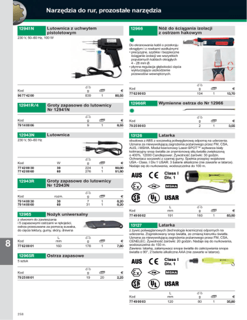 Narzędzia do rur, prozostałe narzędzia 12941N Lutownica z uchwytem pistoletowym 12966 230 V, 50–60 Hz, 100 W Nóż do ściągania izolacji z ostrzem hakowym U Do ekranowania kabli o przekroju okrągłym i z rowkami wzdłużnymi • precyzyjne, szybkie i bezpieczne ściąganie izolacji we wszystkich popularnych kablach okrągłych 4 - 28 mm O. • płynna regulacja głębokości cięcia wykluczająca uszkodzenie przewodów wewnętrznych. ʻ ʻ R g Kod ʻ 839 96 77 42 00 S 1 Kod € ʻ 80,55 ʻ 77 62 00 03 R g S 104 1 € 13,70 ʻ 12941R/4 12966R Groty zapasowe do lutownicy Nr 12941N U ʻ R g Kod ʻ Wymienne ostrza do Nr 12966 ʻ S € Kod R g S 2 1 ʻ 9 79 14 00 06 1 8,55 ʻ 79 25 00 03 € 3,55 ʻ 12943N Lutownica 13126 230 V, 50–60 Hz ʻ Kod W R g S 30 60 224 276 1 1 ʻ 77 42 00 30 77 42 00 60 € 50,00 51,50 Latarka obudowa z ABS z soczewką poliwęglanową odporną na uderzenia. Uznana za niewywołującą zagrożenia pożarowego przez FM, CSA, AUS, i MSHA. Moduł ksenonowy Laser-SPOT™ wytwarza biały kolimacyjny snop światła ze znamionową siłą światła zwiększoną o 400%. 12000 Candlepower. Żywotność żarówki: 30 godzin. Ochraniacz soczewki z czarnej gumy. Spełnia przepisy wojskowe USA - Class. I Div.1 USAR. 3 baterie alkaliczne (nie zawarte w latarce). Nadaje się do nurkowania, wodoszczelna do 100 m. ʻ 12943R Groty zapasowe do lutownicy Nr 12943N ʻ Kod rozm. R g S 30 60 7 31 1 1 ʻ 79 14 00 30 79 14 00 60 € 8,20 8,20 ʻ ʻ Kod 12965 L mm R g S 191 160 1 ʻ Nożyk uniwersalny 77 49 00 02 € 83,50 ʻ z otworem do zawieszania i 5 zapasowymi ostrzami w rękojeści, ostrza przesuwane za pomocą suwaka, do cięcia tektury, gumy, skóry, drewna 13127 ʻ 8 Kod L mm R g S 160 178 1 R g S € 19 20 2,25 ʻ 77 62 00 01 € 7,80 ʻ 12965R Latarka z żywic poliwęglanowych (technologia kosmiczna) odpornych na uderzenia. Zogniskowany snop światła, ze zmianą kierunku światła. Uznana za niewywołującą zagrożenia pożarowego przez FM, CSA, CENELEC. Żywotność żarówki: 20 godzin. Nadaje się do nurkowania, wodoszczelna do 150 m. Zawiera: latarkę, załamywacz snopa światła do zakrzywiania snopa światła o 90°, 2 baterie alkaliczne AAA (nie zawarte w latarce). Ostrza zapasowe 5 sztuk ʻ Kod ʻ 79 25 00 01 ʻ ʻ Kod L mm R g S 120 80 1 ʻ 77 49 00 03 ʻ 258 € 35,80