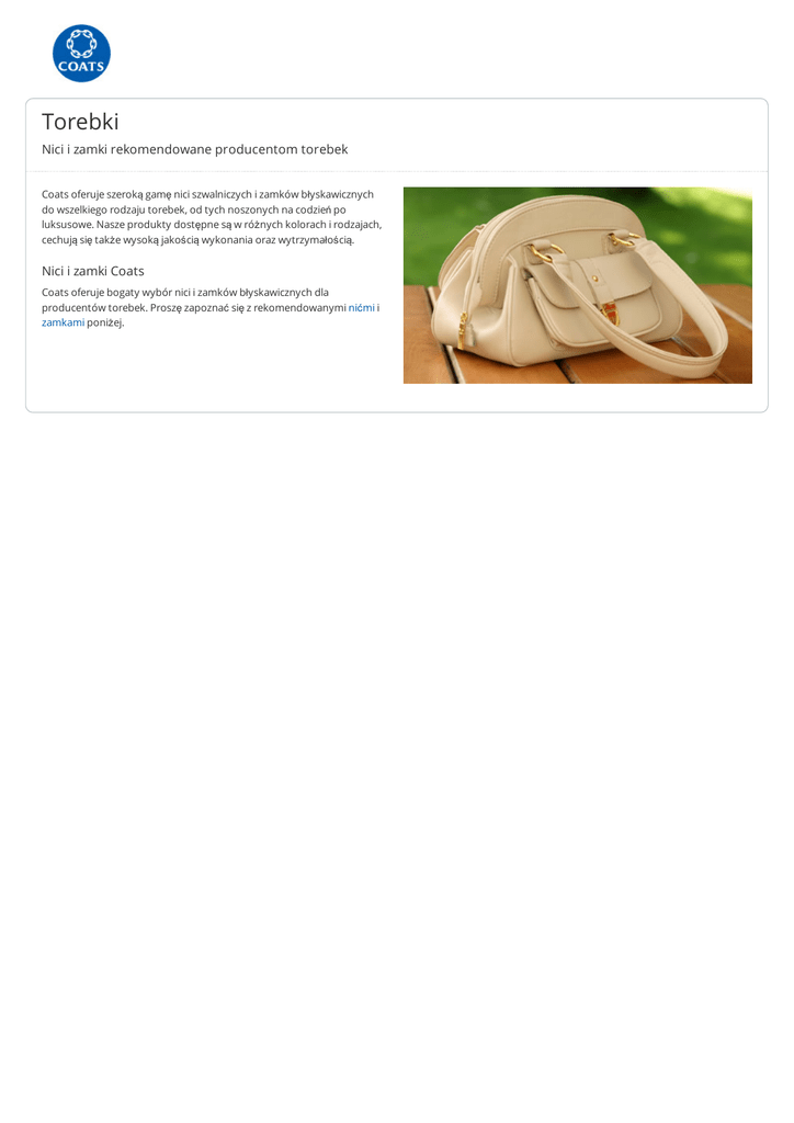 Torebki Nici i zamki rekomendowane producentom torebek Coats oferuje szeroką gamę nici szwalniczych i zamków błyskawicznych do wszelkiego rodzaju torebek, od tych noszonych na codzień po luksusowe. Nasze produkty dostępne są w różnych kolorach i rodzajach, cechują się także wysoką jakością wykonania oraz wytrzymałością. Nici i zamki Coats Coats oferuje bogaty wybór nici i zamków błyskawicznych dla producentów torebek. Proszę zapoznać się z rekomendowanymi nićmi i zamkami poniżej. 1 Numer ściegu Rodzaj ściegu Produkt 301 Przyszycie dekoracji (301) Gral Więcej Terko Satin Więcej Terko Satin Więcej Przyszycie 2 301 dekoracyjnych elementów skórzanych (301) Łączenie kołnierza 3 301 lamówki do pikówki (504 or 401) 4 301 Przyszycie zamka (301) Terko Satin Więcej 5 301 Uszycie worków z podszewki Epic Więcej Premium Poliestrowe nici rdzeniowe w oplocie bawełnianym z wykończeniem Glacé Nici przemysłowe Coats dostępne są w szerokiej gamie rodzajów włókien i wykończeń, z których każdy opracowany jest pod kątem konkretnych potrzeb naszych klientów. Zapraszamy do zapoznania się z naszą bogatą ofertą poniżej. W przypadku dostępności innych opcji, proszę wybrać odpowiednią opcję z listy. Wygląd szwu Rodzaj ściegu Numer ściegu Przyszycie dekoracji (301) 1 Przyszycie dekoracyjnych elementów skórzanych (301) Łączenie kołnierza lamówki do pikówki (504 or 401) 2 3 Górna nitka Dolna nitka Produkt Tex Tkt Produkt Tex Tkt 301 Gral 135 lub 270 20 lub 10 Gral 135 lub 270 20 lub 10 301 Terko Satin 105 lub 150 25 lub 20 Terko Satin 105 lub 150 25 lub 20 301 Terko Satin 105 lub 150 25 lub 20 Terko Satin 80 lub 105 36 lub 25 4 Przyszycie zamka (301) 301 Terko Satin 105 25 Terko Satin 60 50 5 Uszycie worków z podszewki 301 Epic 24 120 Epic 24 120 Key: Nierozdzielczy = Nierozdzielczy; Rozdzielczy = Rozdzielczy; Dwustronnie rozdzielczy = Dwustronnie rozdzielczy; Dwustronnie nierozdzielczy = Dwustronnie nierozdzielczy; X-Forma / O-Forma Opti LUX Zastosowanie Zamki dekoracyjne Otwór/Wlot/Zapięcie Kieszenie Opti M Opcje specjalne Opti P Opcje specjalne Opti S Opcje specjalne Opcje specjalne LUX8 CC - M60 CC - - - - - LUX6 CC Taśma satynowa M40 CC - - - - - LUX4 CC - M80 CC - - - - - LUX4 OF - M40 CC - P60 CC - S60 CC Reversed, Zero distance, Odblaskowy, Contrast LUX8 CC - M60 CC siMMiƨ P40 CC - S60 OF Reversed, Zero distance, Odblaskowy, Contrast LUX6 CC Taśma satynowa M60 OF siMMiƨ P80 CC - - - LUX4 CC - - - - - - - LUX6 OF Taśma satynowa - - - - - - LUX6 CC Taśma satynowa M40 CC - P40 CC - S60 CC Reversed LUX8 CC - M60 CE - P60 CC - S40 CC Reversed LUX4 CC - - - P80 CC - - - Suwaki Możemy wykonać indywidualną przywieszkę z logo twojej firmy. Bag Non-lock Werra Ribbon Ring Ribbon D-Ring Fulda Drop Non-lock Chic Bulle Non-lock Body Non-lock Opcje specjalne Ponieważ rodzaje produktów i warunki zastosowania nici znacznie się między sobą różnią, Coats ani jego poszczególne oddziały nie mogą zagwarantować jednolitych rezultatów. Niniejsze zalecenia udzielone są w dobrej wierze, jednak bez gwarancji i odpowiedzialności ze strony firmy lub jej pracowników. Nie możemy zagwarantować, że produkt jest odpowiedni do określonego zastosowania. Klienci zawsze powinni przeprowadzić własne testy. W przypadku wątpliwości prosimy o odwołanie się do warunków użytkowania serwisu.