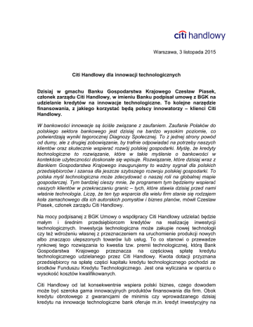 Warszawa, 3 listopada 2015 Citi Handlowy dla innowacji technologicznych Dzisiaj w gmachu Banku Gospodarstwa Krajowego Czesław Piasek, członek zarządu Citi Handlowy, w imieniu Banku podpisał umowę z BGK na udzielanie kredytów na innowacje technologiczne. To kolejne narzędzie finansowania, z jakiego korzystać będą polscy innowatorzy – klienci Citi Handlowy. W bankowości innowacje są ściśle związane z zaufaniem. Zaufanie Polaków do polskiego sektora bankowego jest dzisiaj na bardzo wysokim poziomie, co potwierdzają wyniki tegorocznej Diagnozy Społecznej. To z jednej strony powód od dumy, ale z drugiej zobowiązanie, by trafnie odpowiadać na potrzeby naszych klientów oraz skutecznie wspierać rozwój polskiej gospodarki. Myślę, że kredyty technologiczne to rozwiązanie, które w takie myślenie o bankowości w kontekście użyteczności doskonale się wpisuje. Rozwiązanie, które dzisiaj wraz z Bankiem Gospodarstwa Krajowego inaugurujemy to ważny sygnał dla polskich przedsiębiorców i szansa dla jeszcze szybszego rozwoju polskiej gospodarki. To polska myśl technologiczna może zdecydować o naszej roli na globalnej mapie gospodarczej. Tym bardziej cieszy mnie, że programem tym będziemy wspierać naszych klientów w przekraczaniu granic – tych, które stawia dzisiaj przed nami właśnie technologia. Liczę, że ten typ wsparcia dla wielu firm stanie się rodzajem koła zamachowego dla ich autorskich pomysłów i biznes planów, mówił Czeslaw Piasek, członek zarządu Citi Handlowy. Na mocy podpisanej z BGK Umowy o współpracy Citi Handlowy udzielać będzie małym i średnim przedsiębiorcom kredytów na realizację inwestycji technologicznych. Inwestycja technologiczna może zakupie nowej technologii czy też wdrożeniu własnej z przeznaczeniem na uruchomienie produkcji nowych albo znacząco ulepszonych towarów lub usług. To co stanowi o przewadze rynkowej tego rozwiązania to kwestia tzw. premii technologicznej, którą Bank Gospodarstwa Krajowego przeznacza na częściową spłatę kredytu technologicznego udzielanego przez Citi Handlowy. Kwota dotacji przyznana przedsiębiorcy na spłatę części kapitału kredytu technologicznego pochodzi ze środków Funduszu Kredytu Technologicznego. Jest ona wyliczana w oparciu o wysokość kosztów kwalifikowanych. Citi Handlowy od lat konsekwentnie wspiera polski biznes, czego dowodem może być szeroka gama innowacyjnych produktów finansowania dla firm. Obok kredytu obrotowego z gwarancjami de minimis czy wprowadzanego dzisiaj kredytu na innowacje technologiczne bank oferuje m.in. kredyt inwestycyjny na podniesienie efektywności energetycznej z KfW oraz kredyt na finansowanie VAT. Dodatkowo Citi Handlowy, korzystając z globalnych doświadczeń i sieci, prowadzi program Emerging Market Champion, w ramach którego aktywnie wspiera polskie firmy w prowadzeniu działalności na rynkach zagranicznych. *** Dodatkowych informacji udziela: Dorota Szostek-Rustecka, Dyrektor Biura Prasowego, tel. (0-22) 692 10 49 E-mail: [email protected] Agata Charuba-Chadryś, Kierownik ds. Kontaktów z Mediami, tel. (0-22) 692 94 16 E-mail: [email protected] Marta Wiszniewska, Specjalista ds.kontaktów z mediami, tel. (0-22) 692 90 52 E-mail: [email protected] Bank Handlowy w Warszawie SA to jedna z największych instytucji finansowych w Polsce, oferująca pod marką Citi Handlowy bogaty i nowoczesny asortyment produktów i usług bankowości korporacyjnej, inwestycyjnej i detalicznej. Bank Handlowy obsługuje 7,5 tys. klientów korporacyjnych i 776,5 tys. klientów indywidualnych poprzez nowoczesne kanały dystrybucji oraz sieć 60 oddziałów. W skład grupy kapitałowej Banku wchodzą takie podmioty jak: Dom Maklerski Banku Handlowego i Handlowy Leasing. Przynależność do Citigroup, największej na świecie instytucji finansowej, zapewnia klientom Banku Handlowego dostęp do usług finansowych w ponad 100 krajach. Citi (NYSE:C) to wiodąca globalna instytucja finansowa, mająca około 200 milionów klientów w ponad 140 krajach. Poprzez swoje dwie odrębne jednostki operacyjne: Citicorp i Citi Holdings, Citi obsługuje klientów indywidualnych, korporacyjnych, rządowych i instytucjonalnych zapewniając im bogaty wachlarz produktów i usług finansowych w zakresie bankowości detalicznej, bankowości korporacyjnej i inwestycyjnej, usług maklerskich i zarządzania aktywami. Dodatkowe informacje www.citi.com. można uzyskać na stronie internetowej www.citigroup.com lub