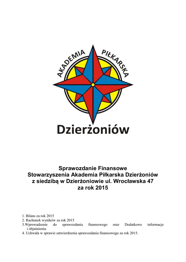 Sprawozdanie Finansowe Stowarzyszenia Akademia Piłkarska Dzierżoniów z siedzibą w Dzierżoniowie ul. Wrocławska 47 za rok 2015 1. Bilans za rok 2015 2. Rachunek wyników za rok 2015 3.Wprowadzenie do sprawozdania finansowego oraz Dodatkowe i objaśnienia. 4. Uchwała w sprawie zatwierdzenia sprawozdania finansowego za rok 2015. informacje Sprawozdanie finansowe Akademii Piłkarskiej Dzierżoniów za rok 2015 I. Wprowadzenie do sprawozdania finansowego za 2015 rok 1. Nazwa organizacji, adres siedziby: Stowarzyszenie Akademia Piłkarska Dzierżoniów z siedzibą w Dzierżoniowie ul. Wrocławska 47 . 2. Przedmiotem działalności organizacji jest: a) Działalność pozostałych organizacji członkowskich, gdzie indziej niesklasyfikowana (9499Z) 3. Organ prowadzący rejestr, data dokonania wpisu organizacji, Nr KRS, Numer statystyczny REGON: Sąd Rejonowy dla Wrocławia-Fabrycznej we Wrocławiu, IX Wydział Gospodarczy Krajowego Rejestru Sądowego; Data dokonania wpisu Organizacji: 08.07.2013 r., Nr KRS: 0000469019, REGON: 022253037 4. Zarząd Stowarzyszenia: a) Sota Krystian – Prezes Zarządu b) Mrzygłód Michał – Członek Zarządu c) Bielawski Adam – Członek Zarządu 5. Cele statutowe: Par. 7 Statutu: Celem działania Akademii jest krzewienie kultury fizycznej wśród dzieci, młodzieży i dorosłych oraz wychowywanie dzieci i młodzieży poprzez kulturę fizyczną i sport. 6. Okres trwania działalności organizacji: Organizacja nie posiada ograniczonego okresu działalności 7. Okres objęty sprawozdaniem finansowym: Roczne sprawozdanie finansowe za rok obrotowy od 01.01.2015 do 31.12.2015 8. Kontynuacja działalności, zagrożenia: Roczne sprawozdanie sporządzono przy założeniu kontynuowania działalności przez organizację, co najmniej 12 miesięcy i dłużej. Nie są nam znane okoliczności, które wskazywałyby na istnienie poważnych zagrożeń dla kontynuowania przez organizację działalności. 1 Sprawozdanie finansowe Akademii Piłkarskiej Dzierżoniów za rok 2015 9.Porównywalność danych Niniejsze sprawozdanie finansowe zawiera dane finansowe za rok obrotowy 2015 oraz porównywalne dane finansowe za rok obrotowy 2014. 10.Stosowane metody i zasady rachunkowości oraz metody wyceny aktywów i pasywów. Sprawozdanie finansowe zostało sporządzone z uwzględnieniem nadrzędnych zasad rachunkowości określonych ustawą o rachunkowości oraz odrębnych przepisów regulujących zasady gospodarki finansowej stowarzyszenia. Stowarzyszenie sporządza sprawozdanie finansowe według wzoru przewidzianego dla jednostek mikro, o których mowa w art. 3 ust. 1a pkt. 2 ustawy o rachunkowości – tj. zgodnie z załącznikiem nr 4 ustawy o rachunkowości. Rachunek wyników Przychody Przychody z działalności statutowej obejmują otrzymane środki pieniężne i inne aktywa finansowe ze źródeł określonych przepisami prawa lub statutem. Koszty Koszty działalności Stowarzyszenia to koszty realizacji zadań statutowych, w tym również świadczeń określonych statutem. Do kosztów w rachunku wyników zalicza się: - koszty realizacji zadań statutowych, czyli związane z wykonywaniem przez stowarzyszenie zadań przewidzianych statutem, koszty administracyjne, nadwyżkę kosztów nad przychodami roku ubiegłego (zgodnie z art.47 ust.3a ustawy o rachunkowości). Bilans Środki pieniężne wykazuje się w wartości nominalnej. Obejmują one środki pieniężne w kasie i na rachunkach bankowych. Zobowiązania zostały wykazane w wartości wymagającej zapłaty. Wynik finansowy netto za rok obrotowy – wykazuje się różnicą pomiędzy przychodami, a kosztami za dany rok obrotowy. 2 Sprawozdanie finansowe Akademii Piłkarskiej Dzierżoniów za rok 2015 11.Zmiany zasad rachunkowości w okresie sprawozdawczym W związku z faktem, iż przestały obowiązywać przepisy rozporządzenia Ministra Finansów z dnia 15 listopada 2001 roku w sprawie szczególnych zasad rachunkowości dla niektórych jednostek niebędących spółkami handlowymi, nieprowadzących działalności gospodarczej jednostka sporządza uproszczone sprawozdanie finansowe przewidziane dla jednostek mikro. II. Informacje dodatkowe do sprawozdania finansowego za 2015 rok 1. Dane dotyczące bilansu Środki pieniężne obejmują wartości pieniężne znajdujące się na rachunkach bankowych stowarzyszenia oraz w kasie. Inne zobowiązania obejmują: kwotę zobowiązań wobec budżetu państwa z tytułu podatku dochodowego oraz ubezpieczeń zdrowotnych płatnych od umów cywilno-prawnych 123,14 zł. kwotę niewypłaconych wynagrodzeń 380,00 zł. kwotę zobowiązań wobec dostawców 3,53 zł. 2. Dane dotyczące struktury przychodów i kosztów w rachunku wyników Struktura zrealizowanych przychodów: Składki członkowskie: Przychody z działalności statutowej odpłatnej Otrzymane darowizny na działalność statutową Dotacje na działalność statutową Razem: 1.500,00 zł. 55.195,00 zł. 9.905,00 zł. 13.296,00 zł. 79 896,00 zł. W roku 2015 Stowarzyszenie realizowało zadania publiczne: - Wspieranie i upowszechnianie kultury fizycznej poprzez udział przedszkolaków z Dzierżoniowa w zajęciach piłki nożnej pod nazwą Mała Akademia Przedszkolaka” na podstawie umowy zawartej z Gminą Miejską Dzierżoniów. Dotacja na ten cel wyniosła 3000,00 zł. Koszty realizacji zadania publicznego wyniosły : 3000,00 zł. ze środków pochodzących z dotacji i 1.054,00 zł. ze środków własnych. - Powiatowy Turniej Przedszkolaków 2015 dotacja w kwocie 3.000,00 zł. od Powiatu Dzierżoniowskiego, z czego koszty realizacji tego zadania wyniosły : 3000,00 zł. środki pochodzące z dotacji, natomiast 604,00 zł. środki własne. - Wypoczynek letni dzieci i młodzieży w formie obozu sportowo-rekreacyjnego na podstawie umowy zawartej z Gminą Miejską Dzierżoniów – dotacja 2.000,00 zł. – koszty realizacji zadania publicznego wyniosły 2.230,00 zl. Z czego środki pochodzące z dotacji : 2000,00 zł. , środki wła