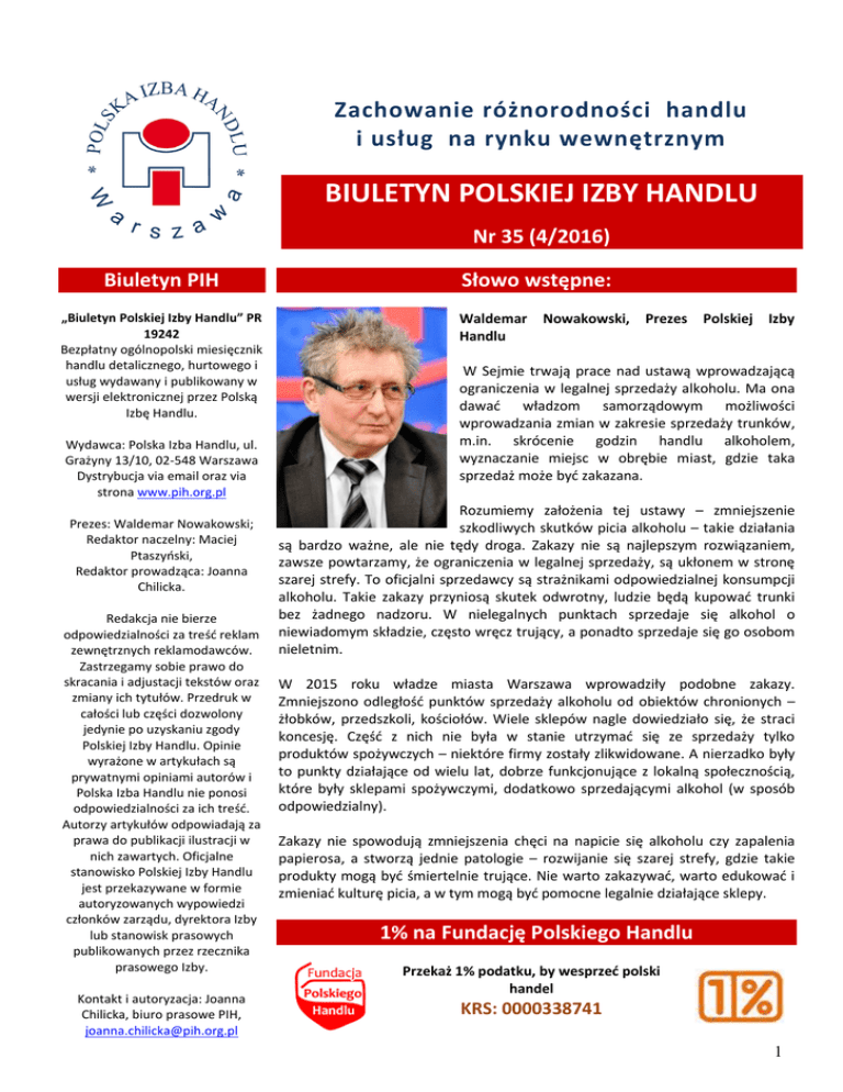 Nowoczesność z tradycjami Zachowanie różnorodności handlu i usług na rynku wewnętrznym i usług na r BIULETYN POLSKIEJ IZBY HANDLU Nr 35 (4/2016) Biuletyn PIH „Biuletyn Polskiej Izby Handlu” PR 19242 Bezpłatny ogólnopolski miesięcznik handlu detalicznego, hurtowego i usług wydawany i publikowany w wersji elektronicznej przez Polską Izbę Handlu. Wydawca: Polska Izba Handlu, ul. Grażyny 13/10, 02-548 Warszawa Dystrybucja via email oraz via strona www.pih.org.pl Prezes: Waldemar Nowakowski; Redaktor naczelny: Maciej Ptaszyński, Redaktor prowadząca: Joanna Chilicka. Redakcja nie bierze odpowiedzialności za treść reklam zewnętrznych reklamodawców. Zastrzegamy sobie prawo do skracania i adjustacji tekstów oraz zmiany ich tytułów. Przedruk w całości lub części dozwolony jedynie po uzyskaniu zgody Polskiej Izby Handlu. Opinie wyrażone w artykułach są prywatnymi opiniami autorów i Polska Izba Handlu nie ponosi odpowiedzialności za ich treść. Autorzy artykułów odpowiadają za prawa do publikacji ilustracji w nich zawartych. Oficjalne stanowisko Polskiej Izby Handlu jest przekazywane w formie autoryzowanych wypowiedzi członków zarządu, dyrektora Izby lub stanowisk prasowych publikowanych przez rzecznika prasowego Izby. Kontakt i autoryzacja: Joanna Chilicka, biuro prasowe PIH, [email protected] Słowo wstępne: Waldemar Handlu Nowakowski, Prezes Polskiej Izby W Sejmie trwają prace nad ustawą wprowadzającą ograniczenia w legalnej sprzedaży alkoholu. Ma ona dawać władzom samorządowym możliwości wprowadzania zmian w zakresie sprzedaży trunków, m.in. skrócenie godzin handlu alkoholem, wyznaczanie miejsc w obrębie miast, gdzie taka sprzedaż może być zakazana. Rozumiemy założenia tej ustawy – zmniejszenie szkodliwych skutków picia alkoholu – takie działania są bardzo ważne, ale nie tędy droga. Zakazy nie są najlepszym rozwiązaniem, zawsze powtarzamy, że ograniczenia w legalnej sprzedaży, są ukłonem w stronę szarej strefy. To oficjalni sprzedawcy są strażnikami odpowiedzialnej konsumpcji alkoholu. Takie zakazy przyniosą skutek odwrotny, ludzie będą kupować trunki bez żadnego nadzoru. W nielegalnych punktach sprzedaje się alkohol o niewiadomym składzie, często wręcz trujący, a ponadto sprzedaje się go osobom nieletnim. W 2015 roku władze miasta Warszawa wprowadziły podobne zakazy. Zmniejszono odległość punktów sprzedaży alkoholu od obiektów chronionych – żłobków, przedszkoli, kościołów. Wiele sklepów nagle dowiedziało się, że straci koncesję. Część z nich nie była w stanie utrzymać się ze sprzedaży tylko produktów spożywczych – niektóre firmy zostały zlikwidowane. A nierzadko były to punkty działające od wielu lat, dobrze funkcjonujące z lokalną społecznością, które były sklepami spożywczymi, dodatkowo sprzedającymi alkohol (w sposób odpowiedzialny). Zakazy nie spowodują zmniejszenia chęci na napicie się alkoholu czy zapalenia papierosa, a stworzą jednie patologie – rozwijanie się szarej strefy, gdzie takie produkty mogą być śmiertelnie trujące. Nie warto zakazywać, warto edukować i zmieniać kulturę picia, a w tym mogą być pomocne legalnie działające sklepy. 1% na Fundację Polskiego Handlu Przekaż 1% podatku, by wesprzeć polski handel KRS: 0000338741 1 Walne Zgromadzenie Izby 19 maja 2016 (czwartek) w Sali Zielonej w siedzibie KZRSS „Społem” przy ul. Grażyny 13 w Warszawie odbędzie się Walne Zgromadzenie Polskiej Izby Handlu. Bezpłatne szkolenie PIH Polska Izba Handlu, najszersza reprezentacja handlu detalicznego w Polsce, zaprasza kierowników i właścicieli sklepów na bezpłatne szkolenie Perfekcyjny sprzedawca – socjotechniki sprzedaży oraz Kartą się opłaca, czyli o korzyściach związanych z akceptacją płatności bezgotówkowych Kraków, 11 maja 2016 Zgłoszenia przyjmujemy do 5 maja 2016 roku [email protected] tel.22 4408323 Z jednej firmy mogą uczestniczyć maksymalnie 2 osoby. 11.30 (I termin) 11.45 (II termin) Szkolenie jest bezpłatne i udział w nim nie zobowiązuje do niczego, w trakcie szkolenia zapewniamy bezpłatny obiad. Spotkanie będzie przeprowadzone przez wysoko cenionego szkoleniowca, który angażuje uczestników i przekazuje praktyczne eksperckie wskazówki dot. prowadzenia sklepu. Szczegóły: Szkolenie Perfekcyjny sprzedawca - socjotechniki sprzedaży Osoby zainteresowane Jakie czynniki wpływają na zachowania konsumentów. Co wpływa na ich udziałem prosimy ze decyzje zakupowe. Na podstawie jakich oznak klienci postrzegają względów technicznych placówkę handlowa i zachowania personelu. W jaki stopniu szybkość i o potwierdzenie sprawność obsług wpływają na decyzje zakupowe. Jaki występują typy obecności w terminie do klientów i na czym polegają różnice w ich obsłudze. Kryteria, które decydują o wyborze miejsca zakupów. Jakie są najbardziej pożądane cechy 12 maja poprzez profesjonalnego sprzedawcy. wysłanie maila [email protected] lub telefonicznie 22 440 83 23 Agenda: 10.00 Otwarcie i wprowadzenie 10.15 Szkolenie Perfekcyjny sprzedawca - socjotechniki sprzedaży cz. 1 11.15 Przygotowanie firmy do płatności elektronicznych 11.45 przerwa 12.00 Szkolenie Perfekcyjny sprzedawca - socjotechniki sprzedaży cz. 2 13.00 Znalezienie właściwego partnera do akceptacji kart. Oczekiwane koszty i warunki 13.30 obiad 14.00 Zarządzanie ryzykiem i chargeback 14.30 Sesja pytań i odpowiedzi 14.45 Szkolenie Perfekcyjny sprzedawca - socjotechniki sprzedaży cz. 3 16.00 zakończenie 2 Pszczelarz Roku Polska Izba Handlu patronem Ogólnopolskiego Konkursu PSZCZELARZ ROKU (II edycja) 8 kwietnia 2016 Fundacja Edukacji Ekonomicznej i Rozwoju Obszarów Wiejskich jest organizatorem II edycji Ogólnopolskiego Konkursu PSZCZELARZ ROKU. Celem Konkursu jest promowanie pszczelarstwa i integrowanie środowiska hodowców pszczół oraz ukazywanie roli pszczelarstwa w rolnictwie i ochronie różnorodności 