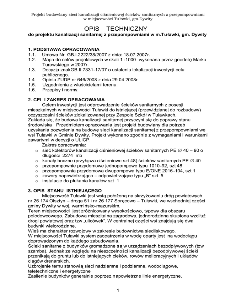 Projekt budowlany sieci kanalizacji ciśnieniowej ścieków sanitarnych z przepompowniami w miejscowości Tuławki, gm.Dywity OPIS TECHNICZNY do projektu kanalizacji sanitarnej z przepompowniami w m.Tuławki, gm. Dywity 1. PODSTAWA OPRACOWANIA 1.1. Umowa Nr GB.I.2222/38/2007 z dnia: 18.07.2007r. . 1.2. Mapa do celów projektowych w skali 1 :1000 wykonana przez geodetę Marka Turowskiego w 2007r. 1.3. Decyzja znakGB.II.7331-17/07 o ustaleniu lokalizacji inwestycji celu publicznego. 1.4. Opinia ZUDP nr 646/2008 z dnia 29.04.2008r. 1.5. Uzgodnienia z właścicielami terenu. 1.6. Przepisy i normy. 2. CEL I ZAKRES OPRACOWANIA Celem inwestycji jest odprowadzenie ścieków sanitarnych z posesji mieszkalnych w miejscowości Tuławki do istniejącej (przewidzianej do rozbudowy) oczyszczalni ścieków zlokalizowanej przy Zespole Szkół w Tuławkach. Zakłada się, że budowa kanalizacji sanitarnej przyczyni się do poprawy stanu środowiska Przedmiotem opracowania jest projekt budowlany dla potrzeb uzyskania pozwolenia na budowę sieci kanalizacji sanitarnej z przepompowniami we wsi Tuławki w Gminie Dywity. Projekt wykonano zgodnie z wymaganiami i warunkami zawartymi w decyzji o ULICP. Zakres opracowania: o sieć kolektorów kanalizacji ciśnieniowej ścieków sanitarnych PE ∅ 40 – 90 o długości 2274 mb o kanały boczne (przyłącza ciśnieniowe szt 48) ścieków sanitarnych PE ∅ 40 o przepompownie przydomowe jednopompowe typu 1010-92, szt 48 o przepompownia przydomowa dwupompowa typu E/ONE 2016 -104, szt 1 o zawory napowietrzająco – odpowietrzające typu „B” szt 5 o instalacje do płukania kanałów szt 1 3. OPIS STANU ISTNIEJĄCEGO Miejscowość Tuławki jest wsią położoną na skrzyżowaniu dróg powiatowych nr 26 174 Olsztyn – droga 51 i nr 26 177 Spręcowo – Tuławki, we wschodniej części gminy Dywity w woj. warmińsko-mazurskim. Teren miejscowości jest zróżnicowany wysokościowo, typowy dla obszaru polodowcowego. Zabudowa mieszkalna zagrodowa, jednorodzinna skupiona wzd łuż drogi powiatowej oraz tzw „ulicówek”. W centralnej cz ęści wsi znajdują się dwa budynki wielorodzinne. Wieś ma charakter rozwojowy w zakresie budownictwa siedliskowego. W miejscowości Tuławki system zaopatrzenia w wodę oparty jest na wodociągu doprowadzonym do każdego zabudowania. Ścieki sanitarne z budynków gromadzone są w urządzeniach bezodpływowych (tzw szamba). Jednak ze względu na nieszczelności kanalizacji bezodpływowej ścieki przenikają do gruntu lub do istniejących cieków, rowów melioracyjnych i układów ciągów drenarskich. Uzbrojenie ternu stanowią sieci nadziemne i podziemne, wodociągowe, teletechniczne i energetyczne Zasilenie budynków generalnie poprzez napowietrzne linie energetyczne. 1 Projekt budowlany sieci kanalizacji ciśnieniowej ścieków sanitarnych z przepompowniami w miejscowości Tuławki, gm.Dywity Warunki wodno-gruntowe W podłożu projektowanego rurociągu ciśnieniowego na wysoczyźnie występują pleistoceńskie gliny morenowe z wkładkami piasków. Są to grunty nośne, pozwalające na bezpośrednie układanie kolektorów. Występują tu także liczne przewarstwienia piasków z wodą gruntową. Na odcinkach występowania słabych gruntów nośnych potrzebna jest częściowa lub całkowita ich wymiana przy jednoczesnym odwadnianiu wykopów . Niektóre odcinki trasy wymagają odwodnienia wykopów także w gruntach nośnych (piaskach i glinach morenowych). Warunki wodne wykonawstwa robót ziemnych są stosunkowo korzystne, mimo że na niektórych odcinkach odwodnienie będzie trudne i wymagać będzie zastosowania igłofiltrów i ścianek szczelnych. Do wykonywania podsypek czy wymiany gruntów należy stosować kruszywo stabilizowane cementem bez intensywnego zagęszczania, które może powodować rozluźnienie zalegających gruntów rodzimych. Nie dotyczy to odwodnionych piasków oraz glin morenowych. Na odcinkach płytkiego występowania wody gruntowej potrzebne będzie szalowanie wykopów nawet płytszych niż 1,5 m. Przepompownia strefowa P - 1 zlokalizowana na stoku wzniesienia morenowego, w pobliżu zabudowy wielorodzinnej. Wystąpi tam glina piaszczysta twardoplastyczna i piaski gliniaste.. 4. OPIS STANU PROJEKTOWANEGO I ZAGOSPODAROWANIA Projektowana sieć kanalizacyjna jest obiektem liniowym podziemnym. Teren przeznaczony pod lokalizacje Kanalizacji stanowi własność prywatną, gminną lub Skarbu Państwa. Przewiduje się, że z każdego budynku ścieki spływać będą grawitacyjnie rurą PCV ∅ 160 mm do przydomowej pompowni (zbiornika z zamontowan ą pompą rozdrabniającą). Założono zastosowanie jednej pompy na jeden budynek mieszkalny. Kanał boczny (przyłącze ciśnieniowe rura PE ∅ 40 mm) z armaturą (dodatkowy zawór zwrotny i odcinający) łączy każdą pompę z kolektorem wykonanym z rur PE o średnicy 50 do 90 mm łączonych przez zgrzewanie. Instalacje zasilające szafki sterujące przepompowni przydomowych wykonują właściciele we własnym zakresie. Budowa kanalizacji wymaga czasowego zajęcia pasa robót, którego szerokość w zależności od możliwości terenowych wynosi do 2,5 m. Część ciągów kanalizacyjnych wykonana zostanie metodą przewiertu sterowanego, co znacznie zmniejszy szkody spowodowane robotami ziemnymi. Posadowienie kanalizacji ciśnieniowej projektuje się na głębokości poniżej 1,4 m ppt. Lokalnie możliwe jest niewielkie odstępstwo od tych wartości po wykonaniu dodatkowego ocieplenie przewodu. Istniejący we wsi układ komunikacyjny zostanie zachowany, nawierzchnia dróg asfaltowych nie zostanie naruszona. W przypadku pozosta łych dróg (brukowych i gruntowych) po wykonaniu robót sanitarnych nawierzchnie nale ży doprowadzić do stanu pierwotnego. Trasę kanalizacji wytyczono w taki sposób aby chronić istniejący drzewostan i inne nasadzenia roślinne. Teren realizacji sieci kanalizacyjnej nie jest wpisany do rejestru zabytków. Sieć kanalizacyjna nie jest wymieni