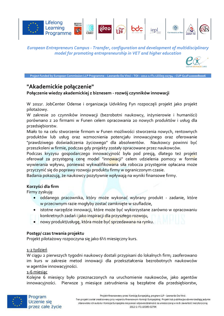 European Entrepreneurs Campus - Transfer, configuration and development of multidisciplinary model for promoting entrepreneurship in VET and higher education Project funded by European Commission LLP Programme – Leonardo Da Vinci – TOI – 2012-1-IT1-LEO05-02794 – CUP G12F12000080006 "Akademickie połączenie" Połączenie wiedzy akademickiej z biznesem - rozwój czynników innowacji W 2011r. JobCenter Odense i organizacja Udvikling Fyn rozpoczęli projekt jako projekt pilotażowy. W zakresie 20 czynników innowacji (bezrobotni naukowcy, inżynierowie i humaniści) porównano z 20 firmami w Funen celem opracowania 20 nowych produktów i usług dla przedsiębiorstw. Miało to na celu stworzenie firmom w Funen możliwości stworzenia nowych, rentownych produktów lub usług oraz wzmocnienia potencjału innowacyjnego oraz oferowanie "prawdziwego doświadczenia życiowego" dla absolwentów. Naukowcy powinni być przeszkoleni w firmie, podczas gdy projekty zostały opracowane przez naukowców. Podczas kryzysu gospodarczego innowacyjność była pod presją, dlatego też projekt oferował za przystępną cenę model "innowacji" celem udzielenia pomocy w formie wywierania wpływu, ponieważ wykwalifikowana siła robocza przystępnie opłacana może przyczynić się do poprawy rozwoju produktu firmy w ograniczonym czasie. Badania pokazują, że naukowcy pozytywnie wpływają na wyniki finansowe firmy. Korzyści dla firm Firmy zyskują: oddanego pracownika, który może wykonać wybrany produkt - zadanie, które w przeciwnym razie mogłyby zostać zamknięte w szufladzie, istotne narzędzie innowacji, które może być wykorzystane zarówno w opracowaniu konkretnych zadań i jako inspiracji dla przyszłego rozwoju, nowy produkt/usługę, która może być sprzedawana na rynku. Postęp/ czas trwania projektu Projekt pilotażowy rozpoczyna się jako 6½ miesięczny kurs. 1-2 tydzień W ciągu 2 pierwszych tygodni naukowcy dostali przypisani do lokalnych firm; zaoferowano im kurs w zakresie metod innowacji dla przekształcenia bezrobotnych naukowców w agentów innowacyjności. 1-6 miesiąc Kolejne 6 miesięcy było przeznaczonych na uruchomienie naukowców, jako agentów innowacyjności. Pierwsze 3 miesiące zatrudnienia są bezpłatne dla przedsiębiorstw, European Entrepreneurs Campus - Transfer, configuration and development of multidisciplinary model for promoting entrepreneurship in VET and higher education Project funded by European Commission LLP Programme – Leonardo Da Vinci – TOI – 2012-1-IT1-LEO05-02794 – CUP G12F12000080006 ponieważ agenci innowacyjności otrzymują zasiłki dla bezrobotnych i przez ostatnie 3 miesiące firmy mogą otrzymać dotację. Rola IDEA Centrum Przedsiębiorczości IDEA zostało zaproszone, by poprowadzić 5-dniowy kurs w zakresie metod innowacji. Miało to na celu przygotowanie naukowców do ich debiutu w pracy w "prawdziwym życiu" oraz przeprowadzenie dla nich kursu generowania pomysłów i koncepcji, rozwoju metodologii i zarządzanie projektem, a poza tym narzędzi do systematycznej pracy z projektami w ich nowych przedsiębiorstwach. IDEA delegowała grupę 3 wykładowców, którzy stworzyli tydzień zróżnicowanych ćwiczeń i wykładów teoretycznych. Agenci uzyskują dyplom potwierdzający ich uczestnictwo oraz treść kursu. Harmonogram PONIEDZIAŁEK 08:30 -15:30 Wstęp do kursu Prezentacja zespołu IDEA Prezentacja absolwentów Czym jest innowacyjność Czym jest przedsiębiorczość Kryteria sukcesu i cel obecności twojej firmy. WTOREK 08:30 -15:30 Refleksje z dnia 1 Generacja pomysłu Ocena/wybór pomysłu Prezentacja pomysłu Mentoring (zaproszony gość) ŚRODA 08:30 -15:30 Refleksje z dnia 2 Innowacja napędza użytkownika (wizyta w G10- ośrodek skupiający innowacje napędzające użytkownika) European Entrepreneurs Campus - Transfer, configuration and development of multidisciplinary model for promoting entrepreneurship in VET and higher education Project funded by European Commission LLP Programme – Leonardo Da Vinci – TOI – 2012-1-IT1-LEO05-02794 – CUP G12F12000080006 Rozwój pomysłu Proces myślenia Prezentacja - szkolenie (zaprezentuj się) CZWARTEK 08:30 -15:30 Refleksje z dnia 3 Sieć Prezentacja modeli\u biznesowego Ostewalder Szkolenie z prezentacji Zaprezentuj swój pomysł Zaprojektuj "skrzynkę" PIĄTEK 08:30 -15:30 Refleksje z dnia 4 Wykonanie - prezentacja twojego pomysłu na firmę Wykonanie - plan projektu/ biznes plan Informacja zwrotna w grupach Kryteria sukcesu Ocena i jak mogę wykorzystać nabytą wiedzę Narzędzia Narzędzia i pytania z całego tygodnia Kapelusze myślenia De Bono Metoda NAF (nowość, atrakcyjność, wykonalność) Kanwy modelu biznesowego Dyplom Przypadek: Historia Luciana Castelão 39-letnia Luciana Castelão, mgr. kultury i komunikacji, obecnie pracuje w branży sprzedaży zaawansowanych technologii pakowania maszyn dla firmy Roll-o-Matic z Odense. European Entrepreneurs Campus - Transfer, configuration and development of multidisciplinary model for promoting entrepreneurship in VET and higher education Project funded by European Commission LLP Programme – Leonardo Da Vinci – TOI – 2012-1-IT1-LEO05-02794 – CUP G12F12000080006 Luciana pochodzi z Brazylii, ale od 1999r. mieszka w Danii, mówi po portugalsku, duńsku, holendersku, angielsku i trochę po hiszpańsku. Luciana był bezrobotna i brała udział w pierwszym kursie połączenia akademickiego. Od sierpnia 2011 pracuje jako koordynator ds. marketingu w Roll-o-Matic. Przez pierwsze szczęść miesięcy Luciana była częścią projektu Połączenia Akademickiego, firma otrzymała dotację od państwa. Dyrektor Generalny i partner Roll-o-Matic, Birger Sørensen, był tak entuzjastycznie nastawiony i zadowolony z projektu i Luciany, że firma zatrudniła ją. "Mamy 45 lat doświadczenia i prowadzimy sprzedaż już w 60 krajach. Kiedy chcieliśmy wzmocnić naszą pozycję na runku Ameryki Łacińskiej, a Luciana mówi