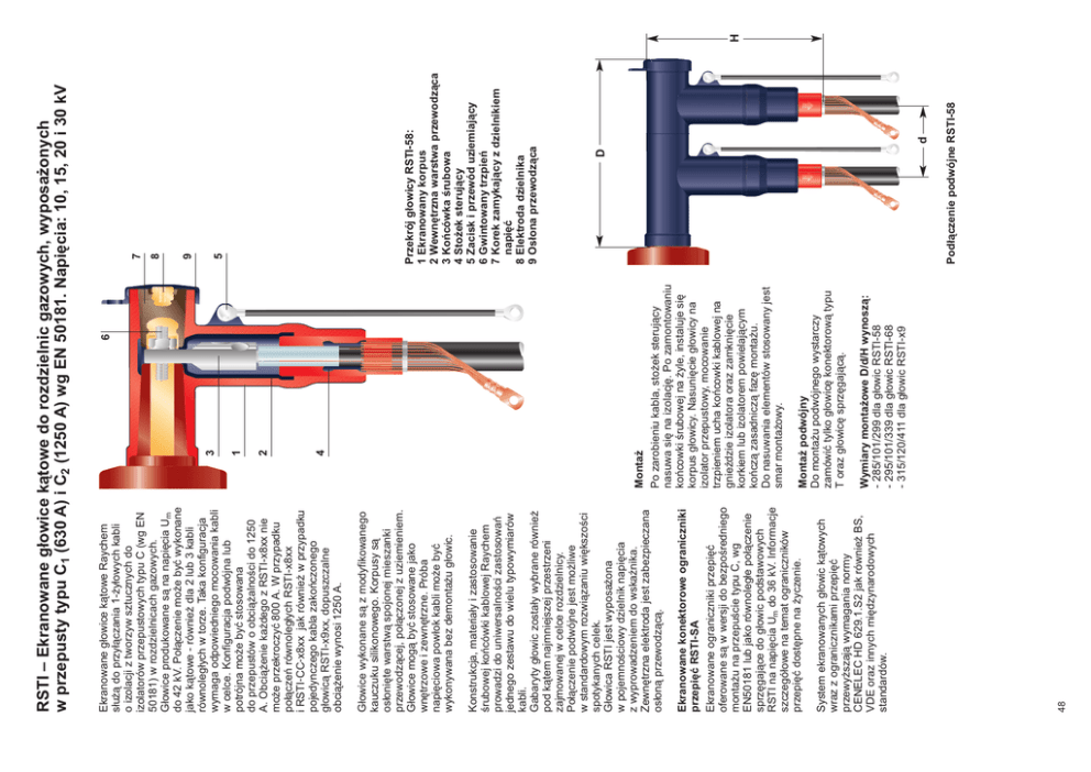 48 System ekranowanych głowic kątowych wraz z ogranicznikami przepięć przewyŜszają wymagania normy CENELEC HD 629.1.S2 jak równieŜ BS, VDE oraz innych międzynarodowych standardów. Ekranowane konektorowe ograniczniki przepięć RSTI-SA Ekranowane ograniczniki przepięć oferowane są w wersji do bezpośredniego montaŜu na przepuście typu C, wg EN50181 lub jako równoległe połączenie sprzęgające do głowic podstawowych RSTI na napięcia Um do 36 kV. Informacje szczegółowe na temat ograniczników przepięć dostępne na Ŝyczenie. Konstrukcja, materiały i zastosowanie śrubowej końcówki kablowej Raychem prowadzi do uniwersalności zastosowań jednego zestawu do wielu typowymiarów kabli. Gabaryty głowic zostały wybrane równieŜ pod kątem najmniejszej przestrzeni zajmowanej w celce rozdzielnicy. Połączenie podwójne jest moŜliwe w standardowym rozwiązaniu większości spotykanych celek. Głowica RSTI jest wyposaŜona w pojemnościowy dzielnik napięcia z wyprowadzeniem do wskaźnika. Zewnętrzna elektroda jest zabezpieczana osłoną przewodzącą. Głowice wykonane są z modyfikowanego kauczuku silikonowego. Korpusy są osłonięte warstwą spojonej mieszanki przewodzącej, połączonej z uziemieniem. Głowice mogą być stosowane jako wnętrzowe i zewnętrzne. Próba napięciowa powłok kabli moŜe być wykonywana bez demontaŜu głowic. Ekranowane głowice kątowe Raychem słuŜą do przyłączania 1-Ŝyłowych kabli o izolacji z tworzyw sztucznych do izolatorów przepustowych typu C (wg EN 50181) w rozdzielnicach gazowych. Głowice produkowane są na napięcia Um do 42 kV. Połączenie moŜe być wykonane jako kątowe - równieŜ dla 2 lub 3 kabli równoległych w torze. Taka konfiguracja wymaga odpowiedniego mocowania kabli w celce. Konfiguracja podwójna lub potrójna moŜe być stosowana do przepustów o obciąŜalności do 1250 A. ObciąŜenie kaŜdego z RSTI-x8xx nie moŜe przekroczyć 800 A. W przypadku połączeń równoległych RSTI-x8xx i RSTI‑CC‑x8xx jak równieŜ w przypadku pojedynczego kabla zakończonego głowicą RSTI-x9xx, dopuszczalne obciąŜenie wynosi 1250 A. Wymiary montaŜowe D/d/H wynoszą: - 285/101/299 dla głowic RSTI-58 - 295/101/339 dla głowic RSTI-68 - 315/120/411 dla głowic RSTI-x9 MontaŜ podwójny Do montaŜu podwójnego wystarczy zamówić tylko głowicę konektorową typu T oraz głowicę sprzęgającą. MontaŜ Po zarobieniu kabla, stoŜek sterujący nasuwa się na izolację. Po zamontowaniu końcowki śrubowej na Ŝyle, instaluje się korpus głowicy. Nasunięcie głowicy na izolator przepustowy, mocowanie trzpieniem ucha końcowki kablowej na gnieździe izolatora oraz zamknięcie korkiem lub izolatorem powielającym kończą zasadniczą fazę montaŜu. Do nasuwania elementów stosowany jest smar montaŜowy. 4 2 1 3 6 d Podłączenie podwójne RSTI-58 D Przekrój głowicy RSTI-58: 1 Ekranowany korpus 2 Wewnętrzna warstwa przewodząca 3 Końcówka śrubowa 4 StoŜek sterujący 5 Zacisk i przewód uziemiający 6 Gwintowany trzpień 7 Korek zamykający z dzielnikiem napięć 8 Elektroda dzielnika 9 Osłona przewodząca 5 9 8 7 RSTI – Ekranowane głowice kątowe do rozdzielnic gazowych, wyposaŜonych w przepusty typu C1 (630 A) i C2 (1250 A) wg EN 50181. Napięcia: 10, 15, 20 i 30 kV H RSTI-5851 RSTI-5853 RSTI-5855 RSTI-3951 RSTI-3952 RSTI-3953 RSTI-5851 RSTI-5854 RSTI-5855 RSTI-5951 RSTI-5952 RSTI-5953 RSTI-5954 RSTI-6851 RSTI-6852 RSTI-6853 RSTI-6855 RSTI-6951 RSTI-6952 RSTI-6953 35– 95 95– 240 185– 300 400 500 630 35– 70 95– 240 185– 300 400 500 630 800 35– 95 95– 150 120– 240 180– 300 400 500– 630 800 6/10 8,7/15 i 12/20 18/30 RSTI-CC-6851 RSTI-CC-6852 RSTI-CC-6853 RSTI-CC-6855 RSTI-CC-6951 RSTI-CC-6952 RSTI-CC-6953 RSTI-CC-5851 RSTI-CC-5854 RSTI-CC-5855 RSTI-CC-5951 RSTI-CC-5952 RSTI-CC-5953 RSTI-CC-5954 RSTI-CC-5851 RSTI-CC-5853 RSTI-CC-5855 RSTI-CC-3951 RSTI-CC-3952 RSTI-CC-3953 Głowica sprzęgająca 22,4 – 35,5 22,4 – 35,5 28,9 – 42,0 28,9 – 42,0 34,0 – 45,4 39,1 – 59,0 39,1 – 59,0 12,7 – 25,0 21,3 – 34,6 21,3 – 34,6 34,0 – 45,4 34,0 – 45,4 39,1 – 59,0 39,1 – 59,0 12,7 – 25,0 17,0 – 32,6 21,3 – 34,6 28,9 – 36,4 28,9 – 36,4 34,0 – 45,4 Średnica na izolacji Ŝył kabla (mm) 35– 120 70– 300 35– 120 50– 240 Typ SMOE-62871 SMOE-62872 46,0 - 67,0 50,0 - 90,0 85,0 - 140,0 13,7 - 25,0 17,6 - 35,6 25,6 - 43,0 RSTI-68EA25 Zestaw 3 korków z elektrodą o kształcie kuli o średnicy 25 mm. Korek uziemiający śyła robocza kabla moŜe być uziemiona, gdy głowica i kabel są przyłączone w rozdzielnicy. RSTI-68TP Zestaw zawiera 3 sztuki RSTI-N66RC Zestaw zawiera 3 sztuki Izolator zastępczy do głowicy końcowej UmoŜliwia uszczelnienie i zamknięcie głowicy RSTI w przypadku, gdy nie jest ona zainstalowana na przepuście. Izolator zastępczy musi być zainstalowany przed doprowadzeniem napięcia do Ŝyły roboczej (np. napięcia probierczego). Izolowana osłona Izolowana osłona do przepustów typu C zgodnych z EN 50181. RSTI-68EA20 Zestaw 3 korków z elektrodą o kształcie kuli o średnicy 20 mm. Zestaw trzech izolatorów wyposaŜonych w redukcję gwintu M16 / M12 RSTI-68TRA 2 izolatory o długości 310 mm, 1 izolator o długości 460 mm. RSTI-68TR 3 izolatory o długości 310 mm. RSTI-68TRL 3 izolatory o długości 460 mm. 600 600 600 Maks. długość* (mm) Izolatory probiercze Izolacja kabli moŜe być poddana próbie napięciowej, gdy głowica i kabel są przyłączone w rozdzielnicy. RSTI - akcesoria * Zestawy do wykonania głowic o dłuŜszych Ŝyłach dostępne na Ŝyczenie. Uwaga: Zestawy naleŜy zamawiać oddzielnie. Średnica kabla (mm) Średnica na izolacji (mm) RSTI-TRF01 RSTI-TRF02 RSTI-TRF03 Typ Dodatkowy zestaw do nieopancerzonych kabli trójŜyłowych o ekranowanej izolacji z tworzyw sztucznych Uwaga: Zestawy uziemiające naleŜy zamawiać oddzielnie. Zestaw SMOE zawiera: 3 spręŜyny, 3 przewody uziemiające i plecionkę miedzianą.