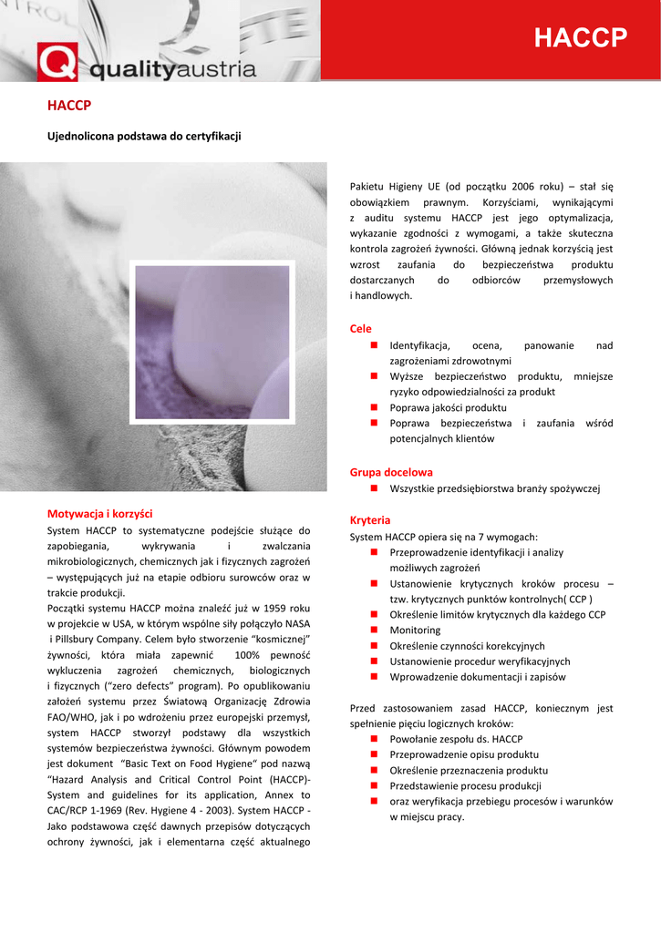 HACCP HACCP Ujednolicona podstawa do certyfikacji Pakietu Higieny UE (od początku 2006 roku) – stał się obowiązkiem prawnym. Korzyściami, wynikającymi z auditu systemu HACCP jest jego optymalizacja, wykazanie zgodności z wymogami, a także skuteczna kontrola zagrożeń żywności. Główną jednak korzyścią jest wzrost zaufania do bezpieczeństwa produktu dostarczanych do odbiorców przemysłowych i handlowych. Cele Identyfikacja, ocena, panowanie nad zagrożeniami zdrowotnymi Wyższe bezpieczeństwo produktu, mniejsze ryzyko odpowiedzialności za produkt Poprawa jakości produktu Poprawa bezpieczeństwa i zaufania wśród potencjalnych klientów Grupa docelowa Motywacja i korzyści System HACCP to systematyczne podejście służące do zapobiegania, wykrywania i zwalczania mikrobiologicznych, chemicznych jak i fizycznych zagrożeń – występujących już na etapie odbioru surowców oraz w trakcie produkcji. Początki systemu HACCP można znaleźć już w 1959 roku w projekcie w USA, w którym wspólne siły połączyło NASA i Pillsbury Company. Celem było stworzenie “kosmicznej” żywności, która miała zapewnić 100% pewność wykluczenia zagrożeń chemicznych, biologicznych i fizycznych (“zero defects” program). Po opublikowaniu założeń systemu przez Światową Organizację Zdrowia FAO/WHO, jak i po wdrożeniu przez europejski przemysł, system HACCP stworzył podstawy dla wszystkich systemów bezpieczeństwa żywności. Głównym powodem jest dokument “Basic Text on Food Hygiene“ pod nazwą “Hazard Analysis and Critical Control Point (HACCP)System and guidelines for its application, Annex to CAC/RCP 1-1969 (Rev. Hygiene 4 - 2003). System HACCP Jako podstawowa część dawnych przepisów dotyczących ochrony żywności, jak i elementarna część aktualnego Wszystkie przedsiębiorstwa branży spożywczej Kryteria System HACCP opiera się na 7 wymogach: Przeprowadzenie identyfikacji i analizy możliwych zagrożeń Ustanowienie krytycznych kroków procesu – tzw. krytycznych punktów kontrolnych( CCP ) Określenie limitów krytycznych dla każdego CCP Monitoring Określenie czynności korekcyjnych Ustanowienie procedur weryfikacyjnych Wprowadzenie dokumentacji i zapisów Przed zastosowaniem zasad HACCP, koniecznym jest spełnienie pięciu logicznych kroków: Powołanie zespołu ds. HACCP Przeprowadzenie opisu produktu Określenie przeznaczenia produktu Przedstawienie procesu produkcji oraz weryfikacja przebiegu procesów i warunków w miejscu pracy. HACCP Następnie przeprowadza się identyfikację i analizę zagrożeń oraz ocenę ryzyka. Obejmuje ona: zbiór wszystkich możliwych zagrożeń występujących na każdym etapie produkcji, prawdopodobieństwo wystąpienia zagrożenia a także ocenę znaczenia zagrożenia dla zdrowia potencjalnego klienta. Skuteczność wdrażania i funkcjonowania systemu HACCP jest weryfikowana i szczegółowo udokumentowana. Poprawność planu jest poddawana regularnej weryfikacji. Inne normy i standardy ISO 9001, ISO 22000, BRC, IFS, IFS Logistics Kontakt Michał Kubista Dyrektor Marketingu i Działu Szkoleń tel. 516687768 e-mail: [email protected] O Quality Austria Quality Austria GmbH jest Państwa kompetentnym partnerem dla zintegrowanych systemów zarządzania w zakresie jakości, środowiska, bezpieczeństwa pracy i standardów branżowych. Usługi świadczone przez Quality Austria obejmują zakres od szkoleń w zakresie międzynarodowych trendów i metod zarządzania, poprzez certyfikację systemów zarządzania na zgodność z międzynarodowymi standardami i krajowymi wymaganiami, aż po oceny w oparciu o model doskonałości EFQM. Quality Austria jest akredytowana przez BMWFJ w zakresie certyfikacji systemów zarządzania i certyfikacji personelu. Posiada również liczne, międzynarodowe dopuszczenia. Quality Austria z ponad 650 audytorami, trenerami i ekspertami technicznymi zapewnienia skuteczny transfer wiedzy, kompetencji i doświadczenia. Ścisły związek krajowego przedstawiciela z międzynarodowymi organizacjami tj. IQNet, EOQ i EFQM , a także współpraca z firmami: IPC, VDA-QMC , IATF dają niepowtarzalną szansę aktywnego uczestniczenia w wypracowywaniu wymagań standardów, które staną się powszechne w niedalekiej przyszłości. Stawia to klientów Quality Austria w niezwykle uprzywilejowanej pozycji. Ponad 12 tys. klientów w prawie 50 krajach osiąga poprzez tę współpracę wymierne korzyści, uzyskując efekt synergii. Quality Austria Polska Sp. z o.o. ul. Żwirki i Wigury 14 43-190 Mikołów Tel.: +48 32 226 60 07 Fax: +48 32 216 26 41 e-mail: [email protected] web: www.qualityaustria.com.pl