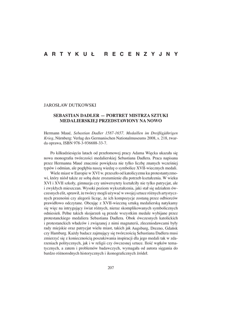 A R T Y K U Ł R E C E N Z Y J N Y JAROSŁAW DUTKOWSKI SEBASTIAN DADLER — PORTRET MISTRZA SZTUKI MEDALIERSKIEJ PRZEDSTAWIONY NA NOWO Hermann Maué, Sebastian Dadler 1587-1657. Medaillen im Dreißigjährigen Krieg, Nürnberg: Verlag des Germanischen Nationalmuseums 2008, s. 218, twarda oprawa, ISBN 978-3-936688-33-7. Po kilkudziesięciu latach od przełomowej pracy Adama Więcka ukazała się nowa monografia twórczości medalierskiej Sebastiana Dadlera. Praca napisana przez Hermanna Maué znacznie powiększa nie tylko liczbę znanych wcześniej typów i odmian, ale pogłębia naszą wiedzę o symbolice XVII-wiecznych medali. Wiele miast w Europie w XVI w. przeszło od katolicyzmu ku protestantyzmowi, który niósł także ze sobą duże zrozumienie dla potrzeb kształcenia. W wieku XVI i XVII szkoły, gimnazja czy uniwersytety kształciły nie tylko patrycjat, ale i zwykłych mieszczan. Wysoki poziom wykształcenia, jaki stał się udziałem ówczesnych elit, sprawił, że twórcy mogli używać w swojej sztuce różnych artystycznych przenośni czy alegorii licząc, że ich kompozycje zostaną przez odbiorców prawidłowo odczytane. Obcując z XVII-wieczną sztuką medalierską natykamy się więc na intrygujący świat różnych, nieraz skomplikowanych symbolicznych odniesień. Pełne takich skojarzeń są przede wszystkim medale wybijane przez protestanckiego medaliera Sebastiana Dadlera. Obok ówczesnych katolickich i protestanckich władców i związanej z nimi magnaterii, zleceniodawcami były rady miejskie oraz patrycjat wielu miast, takich jak Augsburg, Drezno, Gdańsk czy Hamburg. Każdy badacz zajmujący się twórczością Sebastiana Dadlera musi zmierzyć się z koniecznością poszukiwania inspiracji dla jego medali tak w zdarzeniach politycznych, jak i w religii czy ówczesnej sztuce. Ilość wątków tematycznych, a zatem i problemów badawczych, wymagała od autora sięgania do bardzo różnorodnych historycznych i ikonograficznych źródeł. 207 Książka została podzielona na dwie części — pierwszą stanowi rozbudowany esej poświęcony Dadlerowi i sztuce medalierskiej XVII w. Drugą — katalog medali wzbogacony szerokim komentarzem. Pierwszą część rozpoczyna biografia Sebastiana Dadlera wraz z omówieniem kolejnych faz jego artystycznej działalności. W kolejności omawiane są jego pobyty i aktywność medalierska w Strasburgu, Augsburgu, Dreźnie, Gdańsku (1635/1636-1648) oraz Hamburgu. Hermann Maué przywołuje historyczne postaci, które zamawiały jego medale lub były ich bohaterami. Autor ukazuje Dadlera m.in. jako artystę zafascynowanego osobą wybitnego wodza i króla szwedzkiego, Gustawa II Adolfa. Kolejna cześć rozważań została poświęcona warsztatowi Dadlera. W tym rozdziale zostały przedstawione techniki mennicze przydatne przy sporządzaniu i wybijaniu medali. Autor często powiększa fragmenty medali Dadlera wskazując na charakterystyczne dla jego ręki elementy kompozycyjne. Pokusił się o zestawienie szeregu charakterystycznych autorskich punc, które były wykorzystywane przez Dadlera w różnych okresach jego twórczości. Wielu ówczesnych medalierów czy rytowników samodzielnie wykonywało swoje punce. Były to wszelkiego rodzaju ozdobniki, rozetki, liście, trójlistki, a także poszczególne litery, czy nawet większe elementy: wieńce, obłoki, złączone dłonie, napis hebrajski IHWH w wieńcu, czy wyobrażenie gołębicy (był to zresztą charakterystyczny dla Dadlera ikonograficzny symbol, często wkomponowany w modelowane sceny, stanowiący nawiązanie do Ducha Świętego). Znajomość i możliwość odróżnienia takich detali pozwala na uchwycenie typowych cech warsztatu tego artysty, a jest to tym bardziej istotne, że Sebastian Dadler był często kopiowany i nie zawsze — jak zobaczymy — łatwo odróżnić jego medal od wyrobu innego artysty. Hermann Maué zwraca uwagę na współpracę Sebastiana Dadlera z Johannem Höhnem i opisuje liczne wspólnie skomponowane przez nich medale. W niektórych wypadkach dodatkowo wyróżnia medale Höhna będące czasami dosłownymi kopiami kompozycji Dadlera, ale zjawisko to wyraźnie marginalizuje. Cały okres gdański współpracy i zapewne rywalizacji obu artystów jest omówiony stosunkowo powierzchownie. Istnieją medale, które obaj artyści realizowali wspólnie, są jednak — i to liczne — takie, dla których pomysłodawcą kompozycji jest Dadler, ale mimo to w kolejnych wersjach częściej spotykamy na nich sygnatury Höhna. Należą do nich m.in. medale przedstawiające scenę zaślubin a na odwrocie szczęśliwą rodzinę (s. 144–145, poz. 101 i 102). Adam Więcek zamieszcza w swojej pracy zdjęcie niesygnowanego medalu — jak mniema — Dadlera, na którym są wszakże widoczne w fałdach sukni inicjały IH. Hermann Maué omawia inny medal skomponowany przez Dadlera, który został potem skopiowany przez Johanna Höhna i anonimowego naśladowcę (s. 42). Od czasu wybicia pierwszej wersji do ostatniej mija kilkadziesiąt lat i szkoda, że autor nie podejmuje prób wyjaśnienia nośności ideowej tej kompozycji, która tak samo, jak się wydaje, przemawiała do odbiorców przez dziesiątki lat. Wątek inspiracji dziełami z różnych epok przewi208 ja się w całej książce, ale autora przede wszystkim interesuje on jako źródło dla konkretnej kompozycji, a nie jako przejaw trwałości idei. Z innym interesującym tropem, który autor otwiera, ale go nie kontynuuje, mamy do czynienia, gdy zestawia medale Dadlera z medalami Höhna wybijanymi po wyjeździe Dadlera z Gdańska. Intrygująca jest nie tylko zbieżność kompozycyjna podejmowanych tematów, ale możliwość uchwycenia obecności charakterystycznych punc Dadlera na medalach Höhna. Nie można wykluczyć, że Sebastian Dadler opuszczając Gdańsk pozostawił Höhnowi nie tylko gotowe stemple, ale i swoje punce. Medale Dadlera z okresu hamburskiego zawierają bowiem nie tylko nowe wątki tematyczn