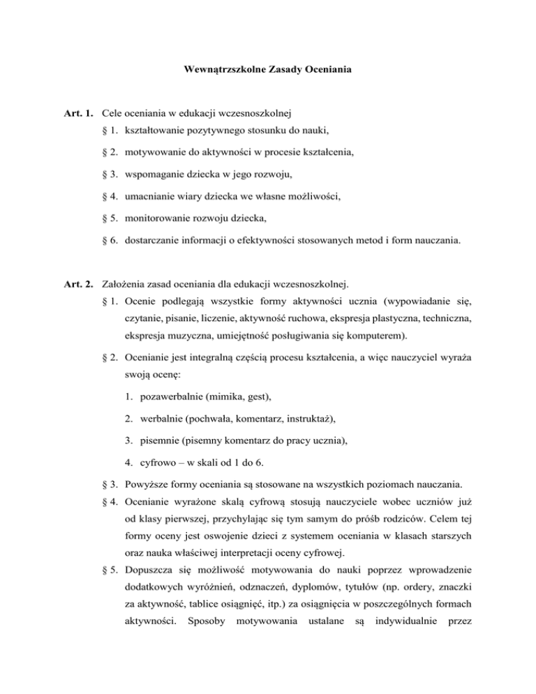 Wewnątrzszkolne Zasady Oceniania Art. 1. Cele oceniania w