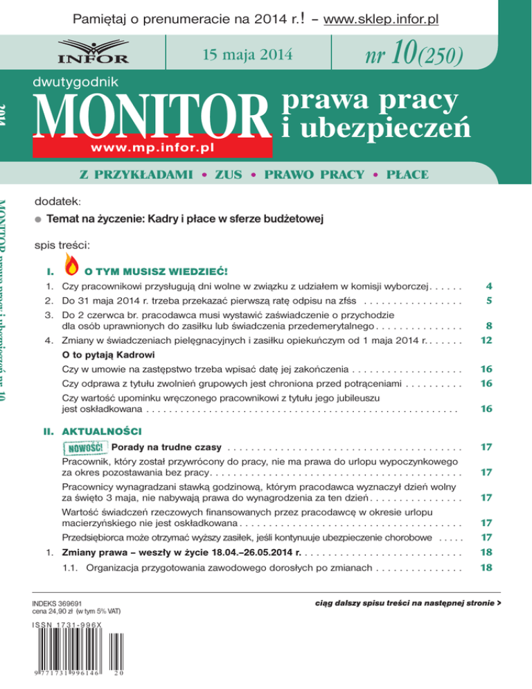 Pamiętaj o prenumeracie na 2014 r.! – www.sklep.infor.pl nr 10(250) 15 maja 2014 dwutygodnik MONITOR www.mp.infor.pl prawa pracy i ubezpieczeń Z PRZYKŁADAMI • ZUS • PRAWO PRACY • PŁACE dodatek: ● Temat na życzenie: Kadry i płace w sferze budżetowej spis treści: I. O TYM MUSISZ WIEDZIEĆ! 1. Czy pracownikowi przysługują dni wolne w związku z udziałem w komisji wyborczej. . . . . . 2. Do 31 maja 2014 r. trzeba przekazać pierwszą ratę odpisu na zfśs . . . . . . . . . . . . . . . . . 3. Do 2 czerwca br. pracodawca musi wystawić zaświadczenie o przychodzie dla osób uprawnionych do zasiłku lub świadczenia przedemerytalnego . . . . . . . . . . . . . . . 4. Zmiany w świadczeniach pielęgnacyjnych i zasiłku opiekuńczym od 1 maja 2014 r. . . . . . . O to pytają Kadrowi Czy w umowie na zastępstwo trzeba wpisać datę jej zakończenia . . . . . . . . . . . . . . . . . . . Czy odprawa z tytułu zwolnień grupowych jest chroniona przed potrąceniami . . . . . . . . . . Czy wartość upominku wręczonego pracownikowi z tytułu jego jubileuszu jest oskładkowana . . . . . . . . . . . . . . . . . . . . . . . . . . . . . . . . . . . . . . . . . . . . . . . . . . . . . . . 4 5 8 12 16 16 16 II. AKTUALNOŚCI Porady na trudne czasy . . . . . . . . . . . . . . . . . . . . . . . . . . . . . . . . . . . . . . . . Pracownik, który został przywrócony do pracy, nie ma prawa do urlopu wypoczynkowego za okres pozostawania bez pracy. . . . . . . . . . . . . . . . . . . . . . . . . . . . . . . . . . . . . . . . . . . Pracownicy wynagradzani stawką godzinową, którym pracodawca wyznaczył dzień wolny za święto 3 maja, nie nabywają prawa do wynagrodzenia za ten dzień . . . . . . . . . . . . . . . . Wartość świadczeń rzeczowych finansowanych przez pracodawcę w okresie urlopu macierzyńskiego nie jest oskładkowana . . . . . . . . . . . . . . . . . . . . . . . . . . . . . . . . . . . . . . Przedsiębiorca może otrzymać wyższy zasiłek, jeśli kontynuuje ubezpieczenie chorobowe . . . . . 17 1. Zmiany prawa – weszły w życie 18.04.–26.05.2014 r. . . . . . . . . . . . . . . . . . . . . . . . . . . . 18 1.1. Organizacja przygotowania zawodowego dorosłych po zmianach . . . . . . . . . . . . . . . 18 INDEKS 369691 cena 24,90 zł (w tym 5% VAT) I S S N 17 3 1 - 9 9 6 X 9 771731 996146 20 17 17 17 17 ciąg dalszy spisu treści na następnej stronie > ◗ POLECAMY! W 2014 r. w MONITORZE prawa pracy i ubezpieczeń m.in.: ◗ Zmiany w zasadach pomocy dla pracodawców zatrudniających osoby bezrobotne ◗ Ustalenie przychodu z nieodpłatnych świadczeń dla pracowników – zmiany w opodatkowaniu ◗ Nowe zasady stosowania certyfikatów rezydencji, niezawierających okresu ważności ◗ Jakie będą nowe zasady oskładkowania umów zleceń ◗ Rewolucyjne zmiany w zakresie dokumentowania niezdolności do pracy– e-zwolnienia Informacje i zamówienia: Biuro Obsługi Klienta: tel. 801 626 666, (22) 761 30 30, e-mail: [email protected] 1.2. Zmiany w ustalaniu wysokości dodatku zagranicznego przysługującego członkowi służby zagranicznej . . . . . . . . . . . . . . . . . . . . . . . . . . . . . . . . . . . . . . . . 18 1.3. Zmiany w szkoleniach w rybołówstwie morskim . . . . . . . . . . . . . . . . . . . . . . . . . . . . 19 1.4. Nowe szkolenia dla marynarzy działu maszynowego . . . . . . . . . . . . . . . . . . . . . . . . 19 1.5. Obowiązek przedłożenia informacji o niekaralności przez wychowawcę lub kierownika formy wypoczynku dzieci i młodzieży . . . . . . . . . . . . . . . . . . . . . . . . 20 2. Oczekują na wejście w życie od 1.06.2014 r. i od 1.10.2014 r. . . . . . . . . . . . . . . . . . . . . 20 2.1. Zmiana podstawy zasiłku chorobowego dla żołnierzy i funkcjonariuszy . . . . . . . . . . . 20 2.2. Niższe wynagrodzenie za czas choroby dla sędziów i prokuratorów . . . . . . . . . . . . . 21 2.3. Skrócona procedura powoływania kandydatów na wolne stanowiska sędziowskie . . 21 3. W Sejmie . . . . . . . . . . . . . . . . . . . . . . . . . . . . . . . . . . . . . . . . . . . . . . . . . . . . . . . . . . . . 22 3.1. Zmiany w służbie Narodowych Sił Rezerwowych . . . . . . . . . . . . . . . . . . . . . . . . . . . 22 3.2. Zatrudnianie asystentów do opieki szkolnej nad dziećmi szkół podstawowych . . . . . 22 4. Najnowsze orzecznictwo . . . . . . . . . . . . . . . . . . . . . . . . . . . . . . . . . . . . . . . . . . . . . . . 23 4.1. Decyzja ZUS nie musi określać odpowiedzialności solidarnej za zaległości składkowe członków zarządu . . . . . . . . . . . . . . . . . . . . . . . . . . . . . . . . . . . . . . . . . . . . . . . . . . 23 III. TEMAT NUMERU 1. Zatrudnianie pracowników sezonowych – forma podjęcia współpracy . . . . . . . . . . . . Umowa o pracę dla pracownika sezonowego . . . . . . . . . . . . . . . . . . . . . . . . . . . . . . . . . Umowa na czas określony . . . . . . . . . . . . . . . . . . . . . . . . . . . . . . . . . . . . . . . . . . . . . . . Umowa na czas wykonania określonej pracy . . . . . . . . . . . . . . . . . . . . . . . . . . . . . . . . . . Umowa na zastępstwo . . . . . . . . . . . . . . . . . . . . . . . . . . . . . . . . . . . . . . . . . . . . . . . . . . Umowa na okres próbny . . . . . . . . . . . . . . . . . . . . . . . . . . . . . . . . . . . . . . . . . . . . . . . . . Pracownicy młodociani i dzieci a prace sezonowe . . . . . . . . . . . . . . . . . . . . . . . . . . . . . . Pracownicy tymczasowi . . . . . . . . . . . . . . . . . . . . . . . . . . . . . . . . . . . . . . . . . . . . . . . . . Umowy cywilnoprawne na prace sezonowe . . . . . . . . . . . . . . . . . . . . . . . . . . . . . . . . . . Uprawnienia zatrudnionych na umowy cywilnoprawne . . . . . . . . . . . . . . . . . . . . . . . . . . . Składki z umowy o pracę, z umowy zlecenia i o dzieło . . . . . . . . . . . . . . . . . . . . . . . . . . Świadczenia za czas niezdolności do pracy . . . . . . . . . . . . . . . . . . . . . . 