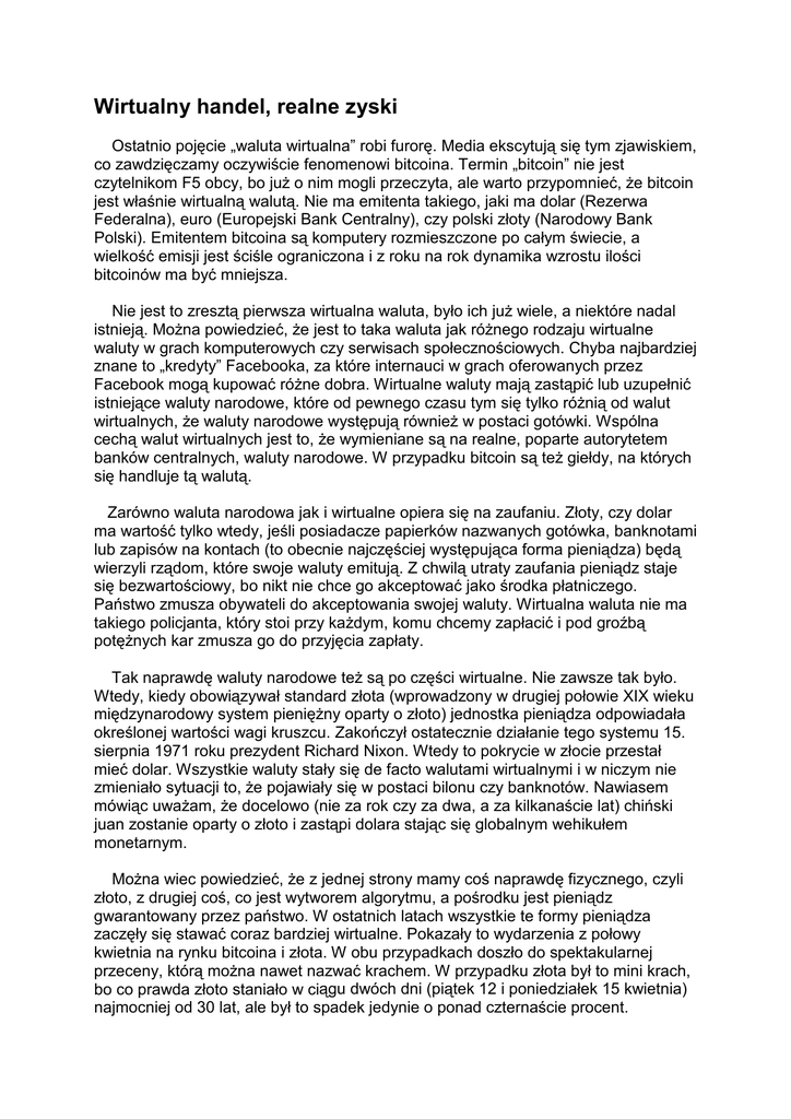 Wirtualny handel, realne zyski Ostatnio pojęcie „waluta wirtualna” robi furorę. Media ekscytują się tym zjawiskiem, co zawdzięczamy oczywiście fenomenowi bitcoina. Termin „bitcoin” nie jest czytelnikom F5 obcy, bo juŜ o nim mogli przeczyta, ale warto przypomnieć, Ŝe bitcoin jest właśnie wirtualną walutą. Nie ma emitenta takiego, jaki ma dolar (Rezerwa Federalna), euro (Europejski Bank Centralny), czy polski złoty (Narodowy Bank Polski). Emitentem bitcoina są komputery rozmieszczone po całym świecie, a wielkość emisji jest ściśle ograniczona i z roku na rok dynamika wzrostu ilości bitcoinów ma być mniejsza. Nie jest to zresztą pierwsza wirtualna waluta, było ich juŜ wiele, a niektóre nadal istnieją. MoŜna powiedzieć, Ŝe jest to taka waluta jak róŜnego rodzaju wirtualne waluty w grach komputerowych czy serwisach społecznościowych. Chyba najbardziej znane to „kredyty” Facebooka, za które internauci w grach oferowanych przez Facebook mogą kupować róŜne dobra. Wirtualne waluty mają zastąpić lub uzupełnić istniejące waluty narodowe, które od pewnego czasu tym się tylko róŜnią od walut wirtualnych, Ŝe waluty narodowe występują równieŜ w postaci gotówki. Wspólna cechą walut wirtualnych jest to, Ŝe wymieniane są na realne, poparte autorytetem banków centralnych, waluty narodowe. W przypadku bitcoin są teŜ giełdy, na których się handluje tą walutą. Zarówno waluta narodowa jak i wirtualne opiera się na zaufaniu. Złoty, czy dolar ma wartość tylko wtedy, jeśli posiadacze papierków nazwanych gotówka, banknotami lub zapisów na kontach (to obecnie najczęściej występująca forma pieniądza) będą wierzyli rządom, które swoje waluty emitują. Z chwilą utraty zaufania pieniądz staje się bezwartościowy, bo nikt nie chce go akceptować jako środka płatniczego. Państwo zmusza obywateli do akceptowania swojej waluty. Wirtualna waluta nie ma takiego policjanta, który stoi przy kaŜdym, komu chcemy zapłacić i pod groźbą potęŜnych kar zmusza go do przyjęcia zapłaty. Tak naprawdę waluty narodowe teŜ są po części wirtualne. Nie zawsze tak było. Wtedy, kiedy obowiązywał standard złota (wprowadzony w drugiej połowie XIX wieku międzynarodowy system pienięŜny oparty o złoto) jednostka pieniądza odpowiadała określonej wartości wagi kruszcu. Zakończył ostatecznie działanie tego systemu 15. sierpnia 1971 roku prezydent Richard Nixon. Wtedy to pokrycie w złocie przestał mieć dolar. Wszystkie waluty stały się de facto walutami wirtualnymi i w niczym nie zmieniało sytuacji to, Ŝe pojawiały się w postaci bilonu czy banknotów. Nawiasem mówiąc uwaŜam, Ŝe docelowo (nie za rok czy za dwa, a za kilkanaście lat) chiński juan zostanie oparty o złoto i zastąpi dolara stając się globalnym wehikułem monetarnym. MoŜna wiec powiedzieć, Ŝe z jednej strony mamy coś naprawdę fizycznego, czyli złoto, z drugiej coś, co jest wytworem algorytmu, a pośrodku jest pieniądz gwarantowany przez państwo. W ostatnich latach wszystkie te formy pieniądza zaczęły się stawać coraz bardziej wirtualne. Pokazały to wydarzenia z połowy kwietnia na rynku bitcoina i złota. W obu przypadkach doszło do spektakularnej przeceny, którą moŜna nawet nazwać krachem. W przypadku złota był to mini krach, bo co prawda złoto staniało w ciągu dwóch dni (piątek 12 i poniedziałek 15 kwietnia) najmocniej od 30 lat, ale był to spadek jedynie o ponad czternaście procent. „Jedynie”, dlatego, Ŝe bitcoin zdroŜał w tym roku kilkunastokrotnie (od połowy marca do blisko połowy kwietnia około sześciokrotnie), a krach był zdecydowanie bardzie spektakularny niŜ w przypadku złota. W dniach 10 do 16. kwietnia wartość bitcoina spadła z ponad 270 dolarów (podczas sesji) do mniej niŜ 50 dolarów. Osiemdziesiąt procent straty w ciągu kilku dni to jest rzeczywiście prawdziwy krach. Potem cena zaczęła rosnąć i w chwili pisanie tekstu wynosiła około 120 USD. To jednak nie jest według mnie koniec przeceny, bo mechanika rynków jest nieubłagana – takie korekty najczęściej są trzyfalowe: po zwyŜkach spadek, potem korekcyjny wzrost, a w końcu zaczynają sprzedawać ci, którzy nie zdąŜyli tego zrobić podczas zwyŜki. Interesujące są mechanizm, który doprowadził do tego krachu doprowadziły. Układ czasowy krachu był zarówno dla złota (12- 15.04) jak i dla bitcoina (10-16.04) bardzo podobny, ale jest to według mnie najpewniej przypadkowa koincydencja i nie o nią mi chodzi. Interesująca jest inna, wspólna cecha. W obu przypadkach handel odbywał się elektronicznie. Nie jest bowiem prawdą, Ŝe to fizyczny popyt doprowadził od 2002 do 2011 do blisko ośmiokrotnego wzrostu ceny złota. To tylko i wyłącznie działania funduszy inwestycyjnych i posługiwania się instrumentami pochodnymi (niewielki depozyt pozwala do wygenerowania potęŜnych zysków) doprowadziło do takiego wzrostu ceny (podobnie było na rynku ropy). Przerzucanie gorącego kartofla, którym jest handel instrumentami pochodnymi (kupujemy nie po to, Ŝeby posiadać, ale po to, Ŝeby dalej sprzedać i na sprzedaŜy zarobić) i generalnie handel elektroniczny oraz uŜycie programów komputerowych znacznie zwiększają szybkość wymiany aktywów, doprowadzając do zmian na rynkach, które czasami zapierają dech w piersiach. Kilka lat temu nowojorski oddział Rezerwy Federalnej ostrzegał, Ŝe stosowanie zautomatyzowanych systemów komputerowych do przeprowadzania operacji giełdowych moŜe doprowadzić do krachu. Komputery otrzymują bowiem sygnały kupna/sprzedaŜy w podobnych momentach czasu, co znacznie zwiększa skalę i zakres wzrostów/spadków cen. To właśnie było według mnie przyczyną krachu na rynku złota. W momencie tej przeceny spotkało się kilka czynników. Po pierwsze rozczarowanie brakiem wysokiej inflacji. Oczekiwano (ja teŜ tego nadal oczekuję), Ŝe banki centralne drukując n