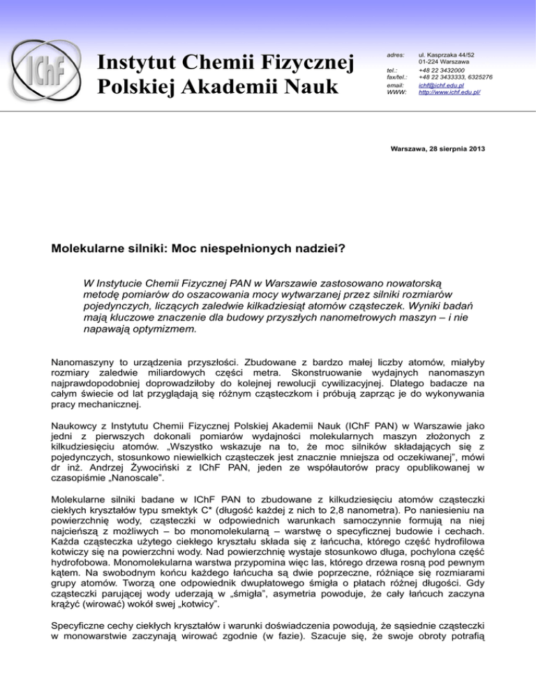 Instytut Chemii Fizycznej Polskiej Akademii Nauk adres: tel.: fax/tel.: email: WWW: ul. Kasprzaka 44/52 01-224 Warszawa +48 22 3432000 +48 22 3433333, 6325276 [email protected] http://www.ichf.edu.pl/ Warszawa, 28 sierpnia 2013 Molekularne silniki: Moc niespełnionych nadziei? W Instytucie Chemii Fizycznej PAN w Warszawie zastosowano nowatorską metodę pomiarów do oszacowania mocy wytwarzanej przez silniki rozmiarów pojedynczych, liczących zaledwie kilkadziesiąt atomów cząsteczek. Wyniki badań mają kluczowe znaczenie dla budowy przyszłych nanometrowych maszyn – i nie napawają optymizmem. Nanomaszyny to urządzenia przyszłości. Zbudowane z bardzo małej liczby atomów, miałyby rozmiary zaledwie miliardowych części metra. Skonstruowanie wydajnych nanomaszyn najprawdopodobniej doprowadziłoby do kolejnej rewolucji cywilizacyjnej. Dlatego badacze na całym świecie od lat przyglądają się różnym cząsteczkom i próbują zaprząc je do wykonywania pracy mechanicznej. Naukowcy z Instytutu Chemii Fizycznej Polskiej Akademii Nauk (IChF PAN) w Warszawie jako jedni z pierwszych dokonali pomiarów wydajności molekularnych maszyn złożonych z kilkudziesięciu atomów. „Wszystko wskazuje na to, że moc silników składających się z pojedynczych, stosunkowo niewielkich cząsteczek jest znacznie mniejsza od oczekiwanej”, mówi dr inż. Andrzej Żywociński z IChF PAN, jeden ze współautorów pracy opublikowanej w czasopiśmie „Nanoscale”. Molekularne silniki badane w IChF PAN to zbudowane z kilkudziesięciu atomów cząsteczki ciekłych kryształów typu smektyk C* (długość każdej z nich to 2,8 nanometra). Po naniesieniu na powierzchnię wody, cząsteczki w odpowiednich warunkach samoczynnie formują na niej najcieńszą z możliwych – bo monomolekularną – warstwę o specyficznej budowie i cechach. Każda cząsteczka użytego ciekłego kryształu składa się z łańcucha, którego część hydrofilowa kotwiczy się na powierzchni wody. Nad powierzchnię wystaje stosunkowo długa, pochylona część hydrofobowa. Monomolekularna warstwa przypomina więc las, którego drzewa rosną pod pewnym kątem. Na swobodnym końcu każdego łańcucha są dwie poprzeczne, różniące się rozmiarami grupy atomów. Tworzą one odpowiednik dwupłatowego śmigła o płatach różnej długości. Gdy cząsteczki parującej wody uderzają w „śmigła”, asymetria powoduje, że cały łańcuch zaczyna krążyć (wirować) wokół swej „kotwicy”. Specyficzne cechy ciekłych kryształów i warunki doświadczenia powodują, że sąsiednie cząsteczki w monowarstwie zaczynają wirować zgodnie (w fazie). Szacuje się, że swoje obroty potrafią zsynchronizować „połacie lasu” liczące nawet bilion (1012) cząsteczek, tworzące na powierzchni wody obszary o rozmiarach milimetrowych. „Co więcej, badane przez nas cząsteczki wirują bardzo wolno. Jeden obrót może trwać od kilku sekund do nawet kilku minut. To bardzo pożądana cecha. Gdyby cząsteczki obracały się z częstotliwościami na przykład megahercowymi, byłoby trudno przenieść ich energię na większe obiekty”, wyjaśnia dr Żywociński. Wcześniejsze oszacowania mocy nanosilników molekularnych dotyczyły albo znacznie większych cząsteczek, albo takich, których praca była napędzana reakcjami chemicznymi. Oszacowania te nie uwzględniały również oporów ośrodka, w którym pracują cząsteczki. Wolne, kolektywne obroty cząsteczek ciekłych kryształów na powierzchni wody można łatwo obserwować i mierzyć. Naukowcy z IChF PAN sprawdzili więc, jak zmienia się szybkość wirowania cząsteczek w zależności od temperatury, oszacowali również zmiany lepkości (rotacyjnej) zachodzące w układzie. Okazało się, że energia ruchu pojedynczej cząsteczki, wytworzona podczas jednego obrotu, jest bardzo mała: wynosi zaledwie 3,5·10-28 dżula. Wartość ta jest aż dziesięć milionów razy mniejsza od energii ruchów termicznych. „Nasze pomiary to kubeł zimnej wody dla konstruktorów molekularnych nanomaszyn”, zauważa prof. Robert Hołyst (IChF PAN). Mimo wytwarzania małej mocy, wirujące cząsteczki ciekłych kryształów mogą znaleźć praktyczne zastosowania. Wynika to z faktu, że moc kolektywnie wirującego dużego zespołu cząsteczek jest odpowiednio większa. Ponadto na jednym centymetrze kwadratowym powierzchni wody takich zespołów, każdy liczący biliony cząsteczek, może być wiele. W ramach tych samych badań w IChF PAN porównano również moc wytwarzaną przez wirujące cząsteczki ciekłych kryształów z mocą biologicznego silnika – bardzo dużej cząsteczki znanej jako adenozynotrifosfataza (ATPaza). Enzym ten funkcjonuje w komórkach zwierzęcych jako pompa sodowo-potasowa. Po dokonaniu odpowiednich przeliczeń oszacowano, że gęstość energii wytwarzanej w jednostce objętości w przypadku ATPazy jest ok. 100 tysięcy razy większa niż w przypadku wirujących ciekłych kryształów. „Ewolucja miała miliony lat, by wytworzyć tak wydajną pompę molekularną. My, ludzie, zajmujemy się molekularnymi maszynami dopiero od paru-parunastu lat”, komentuje prof. Hołyst i dodaje: „Proszę nam dać odrobinę czasu”. Materiał prasowy przygotowany w ramach grantu NOBLESSE z działania „Potencjał badawczy” 7. Programu Ramowego Unii Europejskiej. Instytut Chemii Fizycznej Polskiej Akademii Nauk (http://www.ichf.edu.pl/) został powołany w 1955 roku jako jeden z pierwszych instytutów chemicznych PAN. Profil naukowy Instytutu jest silnie powiązany z najnowszymi światowymi kierunkami rozwoju chemii fizycznej i fizyki chemicznej. Badania naukowe są prowadzone w 9 zakładach naukowych. Działający w ramach Instytutu Zakład Doświadczalny CHEMIPAN wdraża, produkuje i komercjalizuje specjalistyczne związki chemiczne do zastosowań m.in. w rolnictwie i farmacji. Instytut publikuje około 200 oryginalnych prac badawczych rocznie. DODATKOWE INFORMACJE: 