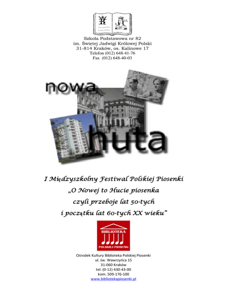 Szkoła Podstawowa nr 82 im. Świętej Jadwigi Królowej Polski 31-814 Kraków, os. Kalinowe 17 Telefon (012) 648-41-76 Fax (012) 648-40-03 I Międzyszkolny Mi dzyszkolny Festiwal Polskiej Piosenki „O Nowej to Hucie piosenka czyli czyli przeboje lat 5050-tych i początku pocz tku lat 6060-tych XX wieku” wieku” Ośrodek Kultury Biblioteka Polskiej Piosenki ul. św. Wawrzyńca 15 31-060 Kraków tel. (0-12) 430-43-00 kom. 509-176-100 www.bibliotekapiosenki.pl Cele - Zapoznanie uczniów z historią polskiej piosenki - Poznanie historii Nowej Huty - Poznanie repertuaru piosenek polskich: dziecięcych, popularnych, innych rodzajów (rock, jazz itp.) - Kształtowanie umiejętności słuchania i rozumienia muzyki - Kształtowanie wrażliwości emocjonalnej - Rozbudzanie radości z kontaktu z muzyką - Kształcenie umiejętności działania w grupie - Przygotowanie do czynnego udziału w kulturze - Rozwijanie świadomości narodowej, kształtowanie postaw patriotycznych - Kształcenie umiejętności współpracy w grupie - Umiejętność przeprowadzania profesjonalnej prezentacji Organizatorzy − Szkoła Podstawowa Nr 82 im, Świętej Jadwigi Królowej Polski – dyrektor Beata Tomaszewska − Biblioteka Polskiej Piosenki - dyrektor Waldemar Domański Koordynatorzy projektu: − Szkoła Podstawowa Nr 82 – Krystyna Downar, Zofia Wiekierak, − Biblioteka Polskiej Piosenki – Wojciech Mirgos Uczestnicy: - uczniowie szkół podstawowych - klasy I – III - klas IV – VI - nauczyciele, wychowawcy i rodzice. Moduły 1. Projekt składa się z 3 modułów: 2. Promocja Festiwalu – listy intencyjne, zaproszenia do udziału wysłane do szkół, informacje merytoryczne – wybrany repertuar - przed feriami zimowymi – zgłoszenia do 13 lutego 2009 r. 3. Przesłuchania konkursowe kwiecień- maj 2009. 4. Koncert finałowy – maj/czerwiec 2009. Osiągnięcia projektu. Uczestnik projektu: - pozna historię Polski z lat 50-tych XX wieku ze szczególnym naciskiem na powstanie Nowej Huty poprzez piosenkę, - pozna historię polskiej muzyki rozrywkowej tego okresu, - rozwinie swoją kreatywność, samodzielność w realizowaniu zadań - rozwinie swoją wrażliwość emocjonalną, - pozna różne formy spędzania wolnego czasu - potrafi dokonać samooceny Kryteria oceniania. 1. Organizatorzy opracują szczegółowy regulamin Festiwalu i kryteria oceny zadań konkursowych. 2. Oceny uczestników Festiwalu dokona niezależne jury. 3. Organizatorzy opracują ankietę ewaluacyjną, która pozwoli ocenić wartość edukacyjną projektu. Forma prezentacji. Przesłuchania konkursowe, koncert finałowy. Formą prezentacji efektów projektu może też być konferencja metodyczna zorganizowana dla władz miasta oraz dyrektorów szkół prezentująca efekty takiego prowadzenia edukacji artystycznej w szkołach Ewaluacja projektu. Opracowana ankieta jak i uwagi uczniów, nauczycieli, rodziców, obserwatorów, umożliwiają ocenę projektu w trakcie jego realizacji oraz po jej zakończeniu. Wypływające uwagi i wnioski pozwolą określić przydatność projektu w sensie edukacyjnym i wychowawczym, dostrzec słabe punkty w jego realizacji, mogą także nasunąć nowe pomysły do realizacji na przyszłość w zakresie edukacji kulturalnej, Szczegółowy regulamin 1. W Festiwalu uczestniczą zespoły złożone z uczniów, rodziców i nauczycieli klas I – III, IV – VI szkół podstawowych. 2. Ilość uczestników w jednym zespole – do 35 osób (1klasa – uczniowie, rodzice, wychowawca) . 3. Prezentować można zarówno utwory wokalne jak i wokalno-instrumentalne. 4. Każdy zespół wybiera – 2 polskie piosenki: - polską piosenkę pop z lat 50 tych i początku lat 60-tych XX w. – przebój tego okresu, - tzw. Pieśń zaangażowaną związaną z tamtym okresem, związaną z obyczajowością i kulturą okresu budowy Nowej Huty, z listy przygotowanej przez organizatorów. 5. Uczestnicy mogą wykonać piosenki spoza listy przygotowanej przez organizatorów z lat 50 tych, ale tylko po wcześniejszym uzgodnieniu z organizatorami. 6. Każdy zespół prezentuje 2 utwory o łącznym czasie nie przekraczającym 10 min. 7. Niedopuszczalne będzie wykonanie z playbackiem. 8. Festiwal odbywa się w dwóch etapach: - przesłuchania konkursowe odbędą się w Szkole Podstawowej Nr 8 w miesiącu kwietniu. Szczegółowa data zostanie ustalona po otrzymaniu zgłoszeń. - Koncert finałowy przewidywany jest na 1 Maja 2009. Laureaci poszczególnych kategorii wezmą udział w koncercie finałowym – Lekcja Śpiewania na Rynku Głównym lub Placu Centralnym. Organizatorzy zastrzegają sobie prawa zmiany terminu z przyczyn od nich niezależnych. 9. Ocenie jury podlega: - wartość artystyczna prezentacji, - elementy choreograficzne, - elementy scenograficzne, - udział rodziców i nauczycieli w danym zespole. 10. Zgłoszenia należy dostarczy do Szkoły Podstawowej Nr 82 w Krakowie do 7 marca 2009 r. Po wysłaniu zgłoszenia chętni uczestnicy otrzymają listę piosenek wraz z płytą oraz szczegółowy formularz zgłoszeniowy. 11. Organizatorzy przewidują także dodatkową możliwość zdobycia punktów: każdy zespół przygotuje plakat reklamujący Nową Hutę. Forma i technika plastyczna dowolna. 12. Nagrody: - przewidziano wartościowe nagrody. Zwycięski zespół dodatkowo nagra audycje radiową Biblioteka Polskiej Piosenki. 13. Dodatkowe informacje, piosenki, wykonawców można znaleźć na stronie WWW.bibliotekapiosenki.pl Formularz zgłoszeniowy 1. Nazwa placówki (nazwa, adres, ………………………………………………………………………………………………………… Telefon ………………………………………………………………………………………………… e-mail …………………………………………………………………………………………………... 2. Zespół nazwa zespołu …………………………………………………