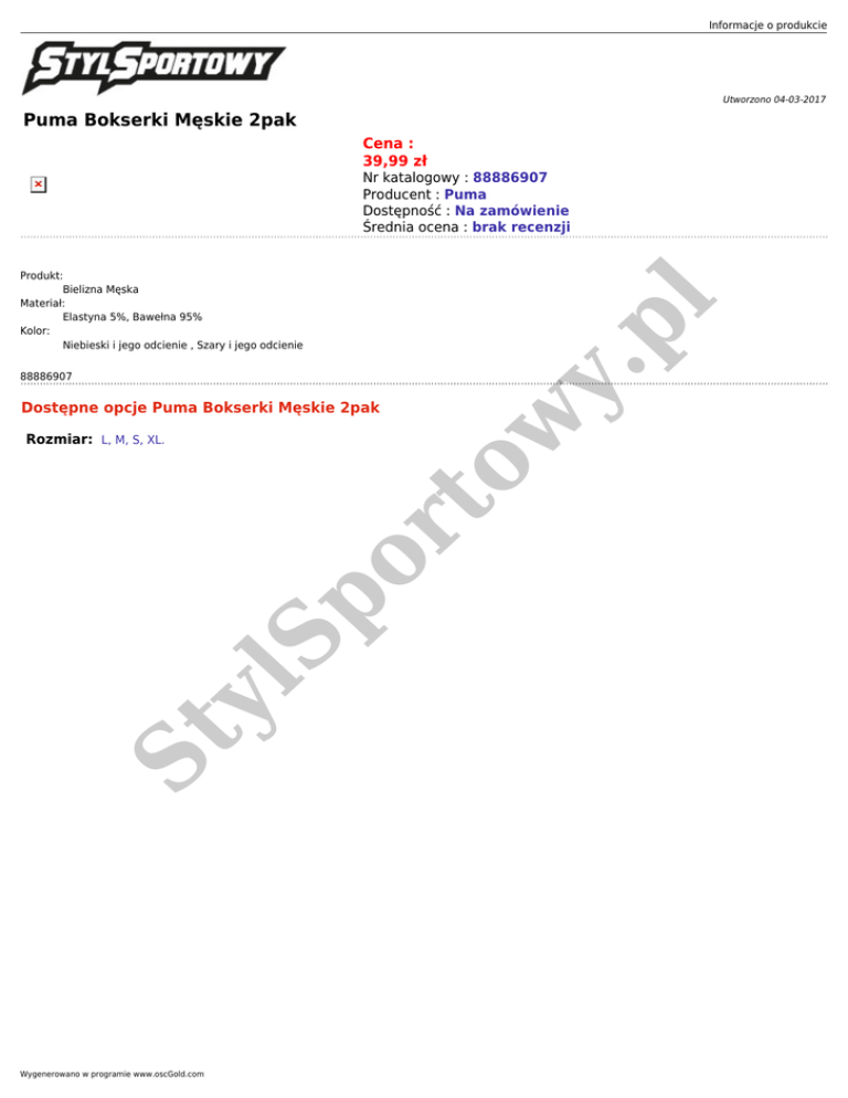 Informacje o produkcie Utworzono 04-03-2017 Puma Bokserki Męskie 2pak Cena : 39,99 zł Nr katalogowy : 88886907 Producent : Puma Dostępność : Na zamówienie Średnia ocena : brak recenzji 88886907 or to w Dostępne opcje Puma Bokserki Męskie 2pak y. pl Produkt: Bielizna Męska Materiał: Elastyna 5%, Bawełna 95% Kolor: Niebieski i jego odcienie , Szary i jego odcienie St y lS p Rozmiar: L, M, S, XL. Wygenerowano w programie www.oscGold.com