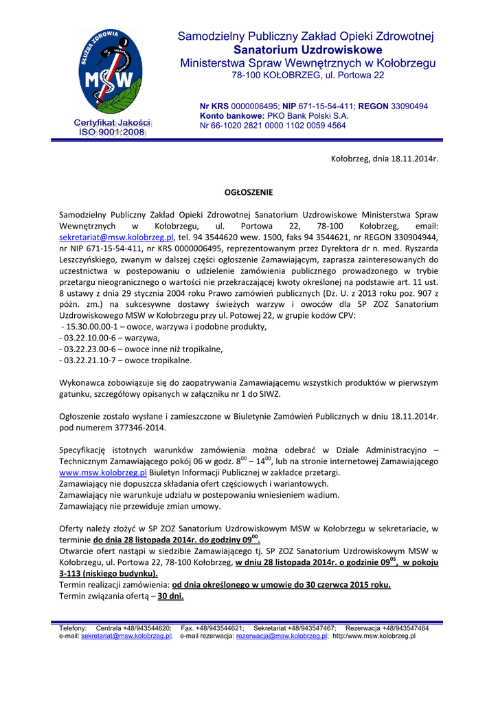 Samodzielny Publiczny Zakład Opieki Zdrowotnej Sanatorium Uzdrowiskowe Ministerstwa Spraw Wewnętrznych w Kołobrzegu 78-100 KOŁOBRZEG, ul. Portowa 22 Nr KRS 0000006495; NIP 671-15-54-411; REGON 33090494 Konto bankowe: PKO Bank Polski S.A. Nr 66-1020 2821 0000 1102 0059 4564 Kołobrzeg, dnia 18.11.2014r. OGŁOSZENIE Samodzielny Publiczny Zakład Opieki Zdrowotnej Sanatorium Uzdrowiskowe Ministerstwa Spraw Wewnętrznych w Kołobrzegu, ul. Portowa 22, 78-100 Kołobrzeg, email: [email protected], tel. 94 3544620 wew. 1500, faks 94 3544621, nr REGON 330904944, nr NIP 671-15-54-411, nr KRS 0000006495, reprezentowanym przez Dyrektora dr n. med. Ryszarda Leszczyńskiego, zwanym w dalszej części ogłoszenie Zamawiającym, zaprasza zainteresowanych do uczestnictwa w postepowaniu o udzielenie zamówienia publicznego prowadzonego w trybie przetargu nieogranicznego o wartości nie przekraczającej kwoty określonej na podstawie art. 11 ust. 8 ustawy z dnia 29 stycznia 2004 roku Prawo zamówień publicznych (Dz. U. z 2013 roku poz. 907 z póżn. zm.) na sukcesywne dostawy świeżych warzyw i owoców dla SP ZOZ Sanatorium Uzdrowiskowego MSW w Kołobrzegu przy ul. Potowej 22, w grupie kodów CPV: - 15.30.00.00-1 – owoce, warzywa i podobne produkty, - 03.22.10.00-6 – warzywa, - 03.22.23.00-6 – owoce inne niż tropikalne, - 03.22.21.10-7 – owoce tropikalne. Wykonawca zobowiązuje się do zaopatrywania Zamawiającemu wszystkich produktów w pierwszym gatunku, szczegółowy opisanych w załączniku nr 1 do SIWZ. Ogłoszenie zostało wysłane i zamieszczone w Biuletynie Zamówień Publicznych w dniu 18.11.2014r. pod numerem 377346-2014. Specyfikację istotnych warunków zamówienia można odebrać w Dziale Administracyjno – Technicznym Zamawiającego pokój 06 w godz. 800 – 1400, lub na stronie internetowej Zamawiającego www.msw.kolobrzeg.pl Biuletyn Informacji Publicznej w zakładce przetargi. Zamawiający nie dopuszcza składania ofert częściowych i wariantowych. Zamawiający nie warunkuje udziału w postepowaniu wniesieniem wadium. Zamawiający nie przewiduje zmian umowy. Oferty należy złożyć w SP ZOZ Sanatorium Uzdrowiskowym MSW w Kołobrzegu w sekretariacie, w terminie do dnia 28 listopada 2014r. do godziny 0900. Otwarcie ofert nastąpi w siedzibie Zamawiającego tj. SP ZOZ Sanatorium Uzdrowiskowym MSW w Kołobrzegu, ul. Portowa 22, 78-100 Kołobrzeg, w dniu 28 listopada 2014r. o godzinie 0905, w pokoju 3-113 (niskiego budynku). Termin realizacji zamówienia: od dnia określonego w umowie do 30 czerwca 2015 roku. Termin związania ofertą – 30 dni. Telefony: Centrala +48/943544620; e-mail: [email protected]; Fax. +48/943544621; Sekretariat +48/943547467; Rezerwacja +48/943547464 e-mail rezerwacja: [email protected]; http:/www.msw.kolobrzeg.pl Samodzielny Publiczny Zakład Opieki Zdrowotnej Sanatorium Uzdrowiskowe Ministerstwa Spraw Wewnętrznych w Kołobrzegu 78-100 KOŁOBRZEG, ul. Portowa 22 Nr KRS 0000006495; NIP 671-15-54-411; REGON 33090494 Konto bankowe: PKO Bank Polski S.A. Nr 66-1020 2821 0000 1102 0059 4564 Kryteria oceny ofert i ich znaczenie: - cena –90%, - termin płatności – 10% Udział w postepowaniu mogą wziąć wszyscy spełniający wymogi art. 22 ust. 1 oraz nie podlegające wykluczeniu na podstawie art. 24 ust. 1 i 2 ustawy Prawo zamówień publicznych z dnia 29 stycznia 2004r. (Dz. U. z 2013r poz. 907 z późn. zm.). O udzielenia zamówienia ubiegać się mogą Wykonawcy, którzy: a) są uprawnieni do występowania w obrocie prawnym i gospodarczym, b) posiadają niezbędne uprawnienia i zezwolenia na prowadzenie działalności w zakresie będącym przedmiotem zamówienia, c) posiadają niezbędne doświadczenie w realizacji zamówień na dostawy warzyw i owoców będących przedmiotem niniejszego postępowania, d) posiadają wymagane zaświadczenia i decyzje organów sanitarnych oraz posiadają wdrożony system HACCP, e) nie podlegają wykluczeniu z postępowania o udzielenie zamówienia na podstawie art. 24 ust. 1 i 2 ustawy Prawo zamówień publicznych, f) posiadają bądź dysponują transportem i gwarantują dostawy tym transportem w uzgodnionych terminach i na własny koszt i ryzyko, do siedziby Zamawiającego, g) znajdują się w sytuacji ekonomicznej i finansowej zapewniającej wykonanie zamówienia i posiadają środki bądź zdolność kredytową na niezbędnym do wykonania zamówienia poziomie, posiadają ubezpieczenie OC w zakresie prowadzonej działalności z rozszerzeniem na OC PRODUKT, o wartości nie niższej niż 150.000,00 PLN, wraz z dokumentem potwierdzającym, że polisa została opłacona. Informacja o oświadczeniach lub dokumentach, jakie mają dostarczyć Wykonawcy w celu potwierdzenia warunków udziału w postępowaniu wymienione są w SIWZ. Dyrektor SP ZOZ Sanatorium Uzdrowiskowego MSW w Kołobrzegu dr n. med. Ryszard Leszczyński Telefony: Centrala +48/943544620; e-mail: [email protected]; Fax. +48/943544621; Sekretariat +48/943547467; Rezerwacja +48/943547464 e-mail rezerwacja: [email protected]; http:/www.msw.kolobrzeg.pl