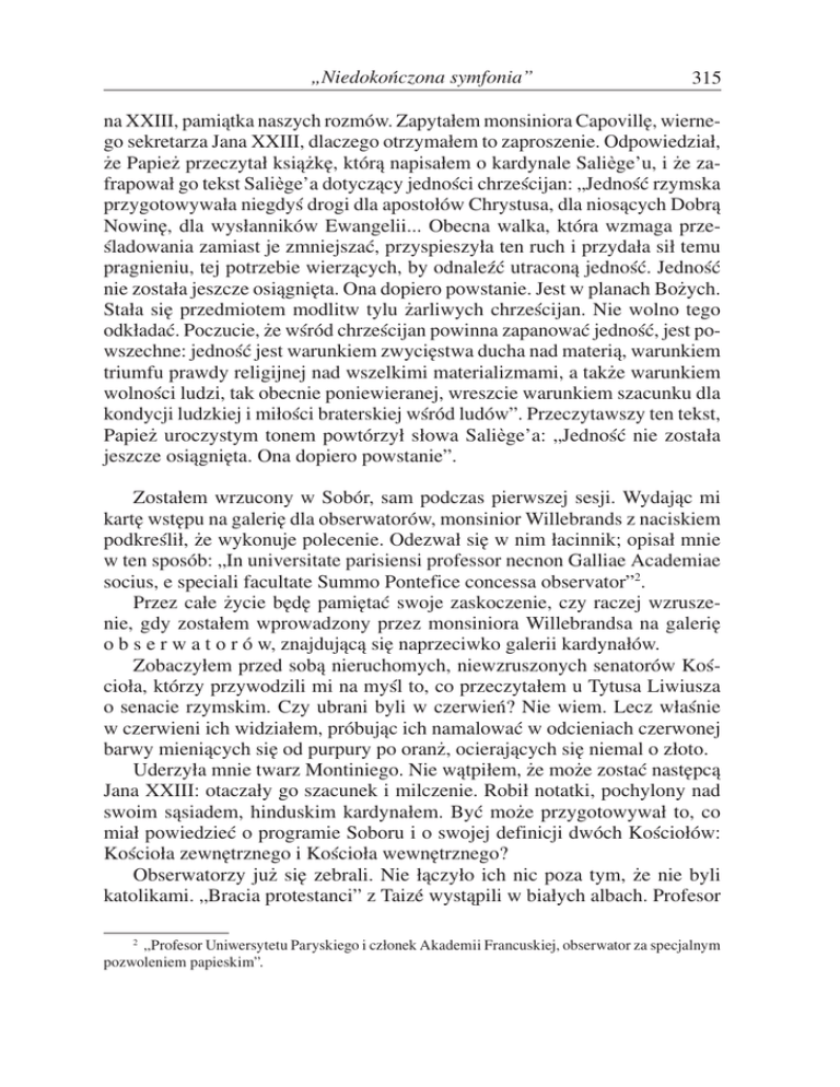 „Niedokończona symfonia” 315 na XXIII, pamiątka naszych rozmów. Zapytałem monsiniora Capovillę, wiernego sekretarza Jana XXIII, dlaczego otrzymałem to zaproszenie. Odpowiedział, że Papież przeczytał książkę, którą napisałem o kardynale Saliège’u, i że zafrapował go tekst Saliège’a dotyczący jedności chrześcijan: „Jedność rzymska przygotowywała niegdyś drogi dla apostołów Chrystusa, dla niosących Dobrą Nowinę, dla wysłanników Ewangelii... Obecna walka, która wzmaga prześladowania zamiast je zmniejszać, przyspieszyła ten ruch i przydała sił temu pragnieniu, tej potrzebie wierzących, by odnaleźć utraconą jedność. Jedność nie została jeszcze osiągnięta. Ona dopiero powstanie. Jest w planach Bożych. Stała się przedmiotem modlitw tylu żarliwych chrześcijan. Nie wolno tego odkładać. Poczucie, że wśród chrześcijan powinna zapanować jedność, jest powszechne: jedność jest warunkiem zwycięstwa ducha nad materią, warunkiem triumfu prawdy religijnej nad wszelkimi materializmami, a także warunkiem wolności ludzi, tak obecnie poniewieranej, wreszcie warunkiem szacunku dla kondycji ludzkiej i miłości braterskiej wśród ludów”. Przeczytawszy ten tekst, Papież uroczystym tonem powtórzył słowa Saliège’a: „Jedność nie została jeszcze osiągnięta. Ona dopiero powstanie”. Zostałem wrzucony w Sobór, sam podczas pierwszej sesji. Wydając mi kartę wstępu na galerię dla obserwatorów, monsinior Willebrands z naciskiem podkreślił, że wykonuje polecenie. Odezwał się w nim łacinnik; opisał mnie w ten sposób: „In universitate parisiensi professor necnon Galliae Academiae socius, e speciali facultate Summo Pontefice concessa observator”2. Przez całe życie będę pamiętać swoje zaskoczenie, czy raczej wzruszenie, gdy zostałem wprowadzony przez monsiniora Willebrandsa na galerię o b s e r w a t o r ó w, znajdującą się naprzeciwko galerii kardynałów. Zobaczyłem przed sobą nieruchomych, niewzruszonych senatorów Kościoła, którzy przywodzili mi na myśl to, co przeczytałem u Tytusa Liwiusza o senacie rzymskim. Czy ubrani byli w czerwień? Nie wiem. Lecz właśnie w czerwieni ich widziałem, próbując ich namalować w odcieniach czerwonej barwy mieniących się od purpury po oranż, ocierających się niemal o złoto. Uderzyła mnie twarz Montiniego. Nie wątpiłem, że może zostać następcą Jana XXIII: otaczały go szacunek i milczenie. Robił notatki, pochylony nad swoim sąsiadem, hinduskim kardynałem. Być może przygotowywał to, co miał powiedzieć o programie Soboru i o swojej definicji dwóch Kościołów: Kościoła zewnętrznego i Kościoła wewnętrznego? Obserwatorzy już się zebrali. Nie łączyło ich nic poza tym, że nie byli katolikami. „Bracia protestanci” z Taizé wystąpili w białych albach. Profesor 2 „Profesor Uniwersytetu Paryskiego i członek Akademii Francuskiej, obserwator za specjalnym pozwoleniem papieskim”. Jean GUITTON 316 Cullmann przyglądał się ze skupionym uśmiechem. Zobaczyłem w pierwszym rzędzie rosyjskiego biskupa prawosławnego, przybyłego z Moskwy, w towarzystwie tłumacza, który był również policjantem. Obecność tych obserwatorów zmieniła atmosferę Soboru, jak niegdyś obecność przedstawicieli cesarza. Obserwatorzy, chociaż się między sobą różnili (a nawet potajemnie ze sobą walczyli, jak prawosławni i protestanci), stanowili swego rodzaju drugą władzę. Tych niemych i jakże różnych świadków łączyło przekonanie – niewypowiedziane, lecz szczere – że uznanie Rzymu za stolicę Kościoła, skutek pod pewnym względem pożałowania godnych okoliczności, zniekształciło pierwotny obraz Kościoła, przyjmowany na sześciu pierwszych soborach ekumenicznych; że w dwudziestym wieku powrót Kościoła do jego istoty, niezależnej od przypadkowych wydarzeń, jest pożądany; że można być wdzięcznym Janowi XXIII, iż powtórzył gest Piotra, „wypływając na głębię”. W gruncie rzeczy ten niejednoznaczny Papież nie był p o l i t y k i e m, lecz m i s t y k i e m: odnoszę do niego słowa Bergsona o duszy mistycznej: „Spokojne ożywienie wszystkich jej władz sprawia, że jej sposób patrzenia jest szeroki i, jakkolwiek słaba by była, wszystko wykonuje z mocą. Przede wszystkim jej spojrzenie jest proste i ta prostota, uderzająca zarówno w słowach, jak i w postępowaniu, przeprowadza ją przez komplikacje, których zdaje się nawet nie dostrzegać”. ODWIEDZINY U KILKU KSIĄŻĄT KOŚCIOŁA Zdarzyło mi się podczas Soboru odwiedzić kardynała Ottavianiego w wielkich i pustych salonach Świętego Oficjum. Odniosłem wrażenie, że zostałem przeniesiony do Hiszpanii z czasów El Greca; zdawało mi się, że widzę wydłużone postaci, krople światła. Cisza Świętego Oficjum była cichsza niż cisza. Kardynał Ottaviani wydawał się dźwigać ciężary, a największym z nich był ciężar jego twarzy. Mógłbym odnieść do niego przeciwieństwo tego, co Saint-Simon powiedział o Fenelonie: „Trzeba było wysiłku, by na niego patrzeć”4. Nie odpowiadałem jego umysłowości, jego wykształceniu, tak różnemu od mojego. Nie aprobował mojego krytycznego umysłu, mojej „kartezjańskiej” formacji. Jego łagodna ironia nauczyła 3 H. B e r g s o n, Dwa źródła moralności i religii, tłum. P. Kostyło SJ, K. Skorulski SJ, Wydawnictwo Homini, Kraków 2007, s. 231. 4 „Il fallait effort pour cesser de le regarder” [„Trzeba było wysiłku, by przestać na niego patrzeć”]. Por. H. d e S a i n t - S i m o n, Pamiętniki, tłum. A. Bocheński, M. Bocheńska, Państwowy Instytut Wydawniczy, Warszawa 1961, t. 1, s. 254-259.