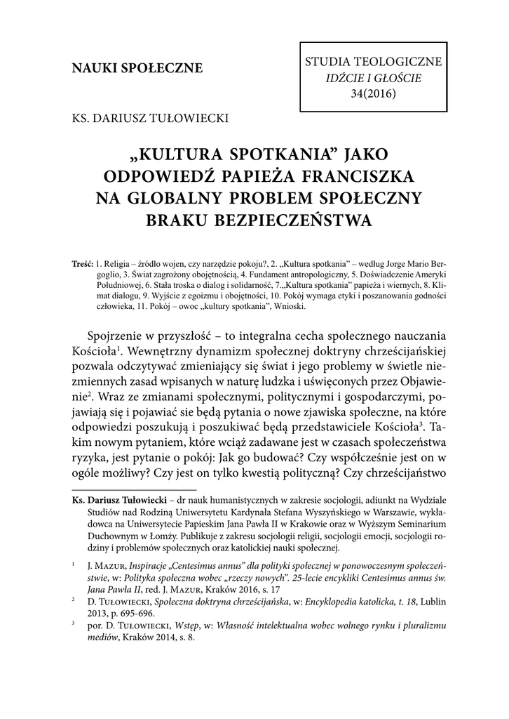 Nauki społeczne Studia Teologiczne IDŹCIE I GŁOŚCIE 34(2016) Ks. Dariusz Tułowiecki „Kultura spotkania” jako odpowiedź papieża Franciszka na globalny problem społeczny braku bezpieczeństwa Treść: 1. Religia – źródło wojen, czy narzędzie pokoju?, 2. „Kultura spotkania” – według Jorge Mario Bergoglio, 3. Świat zagrożony obojętnością, 4. Fundament antropologiczny, 5. Doświadczenie Ameryki Południowej, 6. Stała troska o dialog i solidarność, 7.„Kultura spotkania” papieża i wiernych, 8. Klimat dialogu, 9. Wyjście z egoizmu i obojętności, 10. Pokój wymaga etyki i poszanowania godności człowieka, 11. Pokój – owoc „kultury spotkania”, Wnioski. Spojrzenie w przyszłość – to integralna cecha społecznego nauczania Kościoła1. Wewnętrzny dynamizm społecznej doktryny chrześcijańskiej pozwala odczytywać zmieniający się świat i jego problemy w świetle niezmiennych zasad wpisanych w naturę ludzka i uświęconych przez Objawienie2. Wraz ze zmianami społecznymi, politycznymi i gospodarczymi, pojawiają się i pojawiać sie będą pytania o nowe zjawiska społeczne, na które odpowiedzi poszukują i poszukiwać będą przedstawiciele Kościoła3. Takim nowym pytaniem, które wciąż zadawane jest w czasach społeczeństwa ryzyka, jest pytanie o pokój: Jak go budować? Czy współcześnie jest on w ogóle możliwy? Czy jest on tylko kwestią polityczną? Czy chrześcijaństwo Ks. Dariusz Tułowiecki – dr nauk humanistycznych w zakresie socjologii, adiunkt na Wydziale Studiów nad Rodziną Uniwersytetu Kardynała Stefana Wyszyńskiego w Warszawie, wykładowca na Uniwersytecie Papieskim Jana Pawła II w Krakowie oraz w Wyższym Seminarium Duchownym w Łomży. Publikuje z zakresu socjologii religii, socjologii emocji, socjologii rodziny i problemów społecznych oraz katolickiej nauki społecznej. 1 2 3 J. Mazur, Inspiracje „Centesimus annus” dla polityki społecznej w ponowoczesnym społeczeństwie, w: Polityka społeczna wobec „rzeczy nowych”. 25-lecie encykliki Centesimus annus św. Jana Pawła II, red. J. Mazur, Kraków 2016, s. 17 D. Tułowiecki, Społeczna doktryna chrześcijańska, w: Encyklopedia katolicka, t. 18, Lublin 2013, p. 695-696. por. D. Tułowiecki, Wstęp, w: Własność intelektualna wobec wolnego rynku i pluralizmu mediów, Kraków 2014, s. 8. Ks. Dariusz Tułowiecki może pomóc odnaleźć politykom drogę (drogi) do autentycznego pokoju? 1. Religia – źródło wojen, czy narzędzie pokoju? Myśl społeczna Kościoła zakłada, że istnieje silne powiązanie pomiędzy wiarą chrześcijańską a politycznym porządkiem świata4. „Sprawiedliwy porządek społeczeństwa i państwa jest centralnym zadaniem polityki. Państwo, które nie kierowałoby sie sprawiedliwością, zredukowałoby się do wielkiej bandy złodziei” – pisał św. Augustyn, zaś współcześni chrześcijańscy politycy twierdzą, że polityka i wiara stykają się w polu troski o urządzanie sprawiedliwego, nieegoistycznego, coraz bardziej ludzkiego świata. Chrześcijaństwo chce nieść pomoc politykom oraz wszystkim ludziom, by oczyszczać rozum i kształcić sumienie (wrażliwość moralną), by to co sprawiedliwe mogło być tu i teraz rozpoznawane i realizowane5. Jednak nie wszyscy podzielają tę perspektywę. Richard Dawkins w swojej głośnej książce „Bóg urojony” w bardzo wyraźny sposób formuje tezę o wrogości wiary i religii wobec świata. Dlatego – według niego – należy „uwolnić” człowieka i cywilizację od fałszywej „hipotezy Boga”6. Postulat „uwolnienia od religii” i „odczarowania świata” nie jest zresztą niczym nowym w myśli społecznej ostatnich stuleci. Stał on u początków socjologii jako nauki mającej konsekwencje terapeutyczne dla społeczności7. Natomiast książka Dawkinsa nie jest tylko uzasadnieniem ateizmu, lecz ale także wystąpieniem przeciwko religii. Totalną krytykę wszelkiej religii i postulat „uwolnienia” od niej świata, Dawkins uważa za całkowicie uzasadnione, ponieważ właśnie w religii widzi przyczynę prześladowania nauki, wzniecania fanatyzmu i nietolerancji. Uważa on, że na wiele sposobów religia ma negatywny wpływ na społeczeństwo. Religia – jego zdaniem – nie przynosi pokoju i ładu, lecz przeciwnie: rodzi przemoc miedzy jednostkami i społecznościami funkcjonującymi w ramach różnych kultur, religii i rodzin8. Wobec tak sprzecznych twierdzeń, mogą rodzić się i rodzą pytania: Czy to religia jest w rzeczywistości winna wojnom i stanowi przyczynę niena4 5 6 7 8 Benedykt XVI, Deus caritas est, n. 28. N. Neuhaus, H. Langes, Values of Christian Democracy. Some key concepts, Kisslegg 2011, s. 28. R. Dawkins, The God Delusion, Boston-New York 2008, s. 51-98. S. Whimster, Max Weber – Work end Interpretation, w: Handbook of Social Theory, red. G. Ritzer, B. Smart, London-Thousand Oaks-New Delhi 2003, s. 54-65. R. Dawkins, The God Delusion, Boston-New York 2008, s. 318-387. 376 „Kultura spotkania” jako odpowiedź papieża Franciszka na globalny problem społeczny... wiści? Czy antagonizmu i wrogości uczyli najwięksi przywódcy religijni i założyciele wielkich religii świata: Jezus, Budda, Mahomet? A może raczej religia źle rozumiana, wykorzystywana jako narzędzie polityczne, rozumiana jako forma nacisku na społeczności – czyli zdeformowana i źle wykorzystywana – stać się może źródłem podziałów? I może postępowanie w którym materializuje się wypaczona interpretacja założeń poszczególnych religii uniemożliwia zachowanie pokoju?9 A zatem, czy rację mają chcący wyeliminować Boga ze sceny historii i umysłu człowieka10, gdyż Bóg jest złem: „Bóg jest przeciw człowiekowi. Każdy postęp człowieka jest zwycięstwem przeciw Bogu”11? Czy też przeciwnie: nauczanie społeczne Kościoła daje istotny wkład w budowanie pokoju oraz oczyszczanie ludzkich zamiarów i działań z egoizmów o