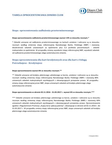 TABELA OPROCENTOWANIA DINERS CLUB Stopa oprocentowania zadłużenia przeterminowanego Stopa oprocentowania zadłużenia przeterminowanego wynosi 14% w stosunku rocznym.* * Odsetki umowne od zadłużenia przeterminowanego na kartach ustalane i naliczane są w stosunku rocznym według zmiennej stopy referencyjnej Narodowego Banku Polskiego (NBP) i stanowią dwukrotność odsetek ustawowych za opóźnienie plus 5,5 punktów procentowych - odsetki maksymalne za opóźnienie. W przypadku zmiany wysokości stopy referencyjnej NBP, wysokość odsetek od zadłużenia przeterminowanego ulega automatycznie zmianie. Stopa oprocentowania dla kart kredytowych oraz dla kart z Usługą Potrzebujesz - Kredytujesz Stopa oprocentowania wynosi 8% w stosunku rocznym.** ** Odsetki umowne od kredytu płatniczego udzielonego w karcie, ustalane i naliczane są w stosunku rocznym według zmiennej stopy referencyjnej Narodowego Banku Polskiego (NBP) i stanowią 80% umownych odsetek maksymalnych wynikających z obowiązujących przepisów prawa. W przypadku zmiany stopy referencyjnej przez NBP, stopa umownych odsetek od kredytu płatniczego ulega automatycznie zmianie. Stopa oprocentowania w okresie 02.11.2016 - 31.03.2017 r. wynosi 6% w stosunku rocznym.*** *** Odsetki umowne od kredytu płatniczego udzielonego w karcie, ustalane i naliczane są w stosunku rocznym według zmiennej stopy referencyjnej Narodowego Banku Polskiego (NBP) i stanowią 60% umownych odsetek maksymalnych wynikających z obowiązujących przepisów prawa. Oprocentowanie zgodne z Regulaminem Promocji „Kupuj teraz spłacaj później”; obowiązuje w okresie od 02.11.2016 r. do 31.03.2017 r. W przypadku zmiany stopy referencyjnej przez NBP, stopa umownych odsetek od kredytu płatniczego ulega automatycznie zmianie. 2 listopada 2016 r.