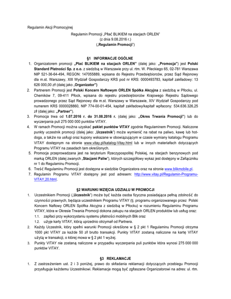 Regulamin Akcji Promocyjnej Regulamin Promocji „Płać BLIKIEM na stacjach ORLEN” (z dnia 9.08.2016 r.) („Regulamin Promocji”) §1 INFORMACJE OGÓLNE 1. Organizatorem promocji „Płać BLIKIEM na stacjach ORLEN” (dalej jako: „Promocja”) jest Polski Standard Płatności Sp. z o.o. z siedzibą w Warszawie przy ul. rtm. W. Pileckiego 65, 02-781 Warszawa NIP 521-36-64-494, REGON: 147055889, wpisana do Rejestru Przedsiębiorców, przez Sąd Rejonowy dla m.st. Warszawy, XIII Wydział Gospodarczy KRS pod nr KRS: 0000493783, kapitał zakładowy: 13 626 000,00 zł (dalej jako „Organizator”) 2. Partnerem Promocji jest Polski Koncern Naftowym ORLEN Spółka Akcyjna z siedzibą w Płocku, ul. Chemików 7, 09-411 Płock, wpisana do rejestru przedsiębiorców Krajowego Rejestru Sądowego prowadzonego przez Sąd Rejonowy dla m.st. Warszawy w Warszawie, XIV Wydział Gospodarczy pod numerem KRS 0000028860, NIP 774-00-01-454, kapitał zakładowy/kapitał wpłacony: 534.636.326,25 zł (dalej jako: „Partner”). 3. Promocja trwa od 1.07.2016 r. do 31.08.2016 r. (dalej jako: „Okres Trwania Promocji”) lub do wyczerpania puli 275 000 000 punktów VITAY. 4. W ramach Promocji można uzyskać pakiet punktów VITAY zgodnie Regulaminem Promocji. Naliczone punkty uczestnik promocji (dalej jako: „Uczestnik”) może wymienić na rabat na paliwo, kawę lub hotdoga, a także na usługi oraz kupony wskazane w obowiązującym w czasie wymiany katalogu Programu VITAY dostępnym na stronie www.vitay.pl/katalog-Vitay.html lub w innych materiałach dotyczących Programu VITAY na zasadach tam określonych. 5. Promocja przeprowadzana jest na terytorium Rzeczypospolitej Polskiej, na stacjach benzynowych pod marką ORLEN (dalej zwanych „Stacjami Paliw”), których szczegółowy wykaz jest dostępny w Załączniku nr 1 do Regulaminu Promocji. 6. Treść Regulaminu Promocji jest dostępna w siedzibie Organizatora oraz na stronie www.blikmobile.pl. 7. Regulamin Programu VITAY dostępny jest pod adresem: http://www.vitay.pl/Regulamin-ProgramuVITAY,20.html. 1. 2. 3. 1. §2 WARUNKI WZIĘCIA UDZIAŁU W PROMOCJI Uczestnikiem Promocji („Uczestnik”) może być każda osoba fizyczna posiadająca pełną zdolność do czynności prawnych, będąca uczestnikiem Programu VITAY (tj. programu organizowanego przez Polski Koncern Naftowy ORLEN Spółka Akcyjna z siedzibą w Płocku) w rozumieniu Regulaminu Programu VITAY, która w Okresie Trwania Promocji dokona zakupu na stacjach ORLEN produktów lub usług oraz: 1.1. zapłaci przy wykorzystaniu systemu płatności mobilnych Blik oraz 1.2. użyje karty VITAY, którą uprzednio otrzymał od Partnera. Każdy Uczestnik, który spełni warunki Promocji określone w § 2 pkt 1 Regulaminu Promocji otrzyma 1000 pkt VITAY za każde 50 zł brutto transakcji. Punkty VITAY zostaną naliczone na kartę VITAY użytą w transakcji, o której mowa w § 2 pkt 1 wyżej. Punkty VITAY nie zostaną naliczone w przypadku wyczerpania puli punktów która wynosi 275 000 000 punktów VITAY. §3 REKLAMACJE Z zastrzeżeniem ust. 2 i 3 poniżej, prawo do składania reklamacji dotyczących przebiegu Promocji przysługuje każdemu Uczestnikowi. Reklamacje mogą być zgłaszane Organizatorowi na adres: ul. rtm. 2. 3. 1. 2. W. Pileckiego 65, 02-781 Warszawa w Okresie Trwania Promocji lub po jej zakończeniu, nie później jednak niż w terminie 30 (trzydziestu) dni kalendarzowych od dnia zakończenia Promocji. Reklamacje dotyczące nieprawidłowego naliczenia punktów VITAY mogą być składane bezpośrednio pracownikowi stacji paliw ORLEN lub za pomocą elektronicznego formularza na Stronie Internetowej https://www.vitay.pl/kontakt.html, lub telefonicznie w Infolinii Programu VITAY: 801 167 536. Reklamacje dotyczące przebiegu płatności za towary i usługi oferowane na stacjach ORLEN z wykorzystaniem systemu płatności mobilnych BLIK powinny być zgłaszane do właściwego dla Uczestnika dokonującego transakcji płatniczej banku będącego wydawcą aplikacji mobilnej umożliwiającej Uczestnikowi płatność BLIKiem. Reklamacje rozpatrywane są przez banki w terminie 30 dni od otrzymania zgłoszenia zgodnie z zgodnie z ustawą z dnia 5 sierpnia 2015 r. o rozpatrywaniu reklamacji przez podmioty rynku finansowego i o Rzeczniku Finansowym lub właściwym regulaminem rozpatrywania reklamacji. §4 PRZETWARZANIE DANYCH OSOBOWYCH Administratorem danych osobowych Uczestników Promocji, które podawane są w celu rozpatrzenia ewentualnych reklamacji, o których mowa w § 3 pkt 1 Regulaminu Promocji i dotyczących przebiegu Promocji jest Organizator. Dane osobowe są przetwarzane zgodnie z zasadami określonymi w Ustawie z dnia 29.08.1997 r. o ochronie danych osobowych. Uczestnikom Promocji udostępniającym w tym celu dane osobowe przysługują prawa do: dostępu do swoich danych, możliwości ich poprawiania, żądania zaprzestania ich przetwarzania lub sprzeciwu wobec ich przetwarzania w każdym czasie. Podanie danych jest dobrowolne lecz warunkuje rozpatrzenie reklamacji, o których mowa w § 3 pkt 1 Regulaminu Promocji. Dane osobowe uczestników Programu VITAY przetwarzane są przez administratora danych, którym jest Polski Koncern Naftowy ORLEN S.A. z siedzibą w Płocku, ul. Chemików 7, na zasadach opisanych w regulaminie Programu VITAY Regulamin Programu VITAY dostępny jest pod adresem: http://www.vitay.pl/Regulamin-Programu-VITAY,20.html w celu określonym w § 3 pkt 1 Regulaminu Promocji. §5 POSTANOWIENIA KOŃCOWE 1. Przystępując do Promocji jej Uczestnik jest zobowiązany przestrzegać postanowień niniejszego Regulaminu Promocji oraz Regulaminu Programu VITAY oraz powszechnie obowiązujących przepisów prawa. 2. Regulamin Promocji obowiązuje od dnia 01.072016 r.