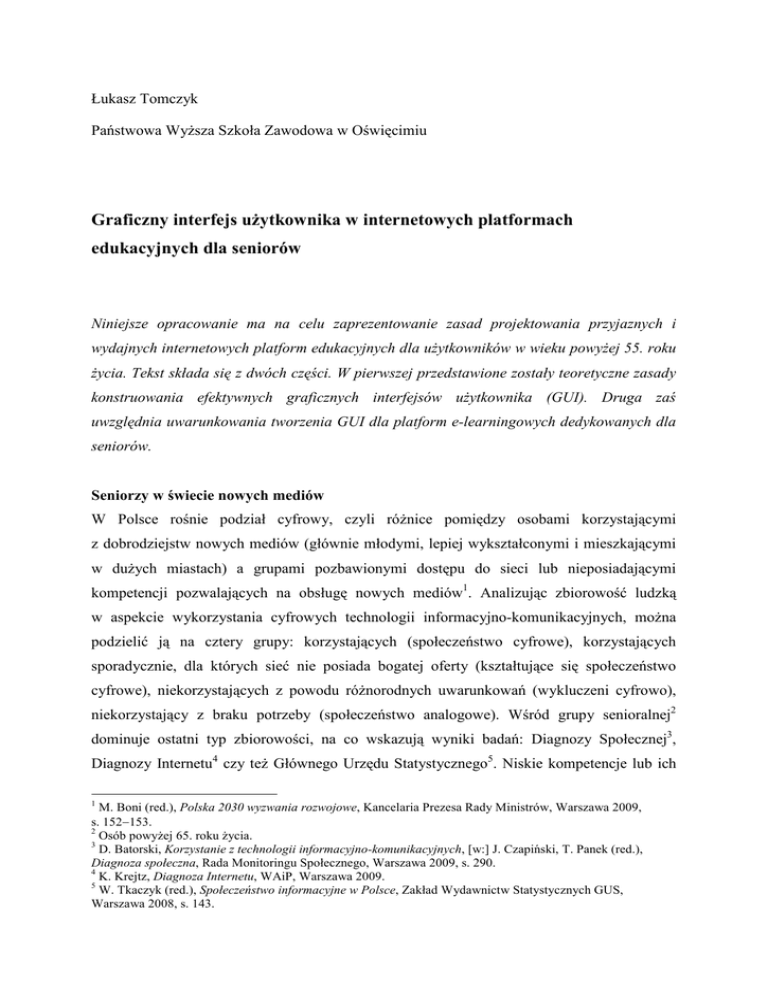 Łukasz Tomczyk Państwowa WyŜsza Szkoła Zawodowa w Oświęcimiu Graficzny interfejs uŜytkownika w internetowych platformach edukacyjnych dla seniorów Niniejsze opracowanie ma na celu zaprezentowanie zasad projektowania przyjaznych i wydajnych internetowych platform edukacyjnych dla uŜytkowników w wieku powyŜej 55. roku Ŝycia. Tekst składa się z dwóch części. W pierwszej przedstawione zostały teoretyczne zasady konstruowania efektywnych graficznych interfejsów uŜytkownika (GUI). Druga zaś uwzględnia uwarunkowania tworzenia GUI dla platform e-learningowych dedykowanych dla seniorów. Seniorzy w świecie nowych mediów W Polsce rośnie podział cyfrowy, czyli róŜnice pomiędzy osobami korzystającymi z dobrodziejstw nowych mediów (głównie młodymi, lepiej wykształconymi i mieszkającymi w duŜych miastach) a grupami pozbawionymi dostępu do sieci lub nieposiadającymi kompetencji pozwalających na obsługę nowych mediów1. Analizując zbiorowość ludzką w aspekcie wykorzystania cyfrowych technologii informacyjno-komunikacyjnych, moŜna podzielić ją na cztery grupy: korzystających (społeczeństwo cyfrowe), korzystających sporadycznie, dla których sieć nie posiada bogatej oferty (kształtujące się społeczeństwo cyfrowe), niekorzystających z powodu róŜnorodnych uwarunkowań (wykluczeni cyfrowo), niekorzystający z braku potrzeby (społeczeństwo analogowe). Wśród grupy senioralnej2 dominuje ostatni typ zbiorowości, na co wskazują wyniki badań: Diagnozy Społecznej3, Diagnozy Internetu4 czy teŜ Głównego Urzędu Statystycznego5. Niskie kompetencje lub ich 1 M. Boni (red.), Polska 2030 wyzwania rozwojowe, Kancelaria Prezesa Rady Ministrów, Warszawa 2009, s. 152−153. 2 Osób powyŜej 65. roku Ŝycia. 3 D. Batorski, Korzystanie z technologii informacyjno-komunikacyjnych, [w:] J. Czapiński, T. Panek (red.), Diagnoza społeczna, Rada Monitoringu Społecznego, Warszawa 2009, s. 290. 4 K. Krejtz, Diagnoza Internetu, WAiP, Warszawa 2009. 5 W. Tkaczyk (red.), Społeczeństwo informacyjne w Polsce, Zakład Wydawnictw Statystycznych GUS, Warszawa 2008, s. 143. brak są złoŜoną pochodną m.in. nieposiadania informacji o moŜliwościach narzędzi informatycznych, niewystarczającej edukacji całoŜyciowej, szybkiego rozwoju technologii cyfrowych, nastawienia mentalnego wobec nowych mediów, jak równieŜ braku moŜliwości technicznych oraz finansowych pośród jednostek z grupy wykluczonych cyfrowo. Stan ten wpływa znacząco na nieharmonijny rozwój społeczeństwa informacyjnego, a takŜe powoduje iŜ technologie cyfrowe stają się znaczącym czynnikiem róŜnicującym. Polscy seniorzy, z racji swego potencjału ilościowego, są niebagatelnym klientem wszelakich usług realizowanych równieŜ poprzez internet. Niestety, z racji niskiego odsetka uŜytkowników nowych mediów, w tej grupie wiekowej rozwój e-usług dedykowanych (np. sklepy, portale społecznościowe, bankowość) rozwija się, w porównaniu z innymi zbiorowościami internautów, w powolnym tempie. E-nauczanie zdobyło w relatywnie krótkim czasie znaczącą popularność − jako uzupełnienie lub samodzielna forma zdobywania wiedzy. JednakŜe w wyniku upowszechniania kursów prowadzonych w trybie online pomijana jest tematyka teoretycznego oraz praktycznego opracowywania zajęć dedykowanych seniorom. W celu efektywnego tworzenia spotkań edukacyjnych w sieci naleŜy uwzględniać wskazania samych zainteresowanych na ten temat, a takŜe prowadzić szczegółowe analizy elementarnych składowych kształcenia zdalnego, poniewaŜ poszczególne fragmenty złoŜonej platformy są odpowiedzialne za jej wydajnościowy wymiar6. Projektowanie graficznego interfejsu uŜytkownika Współcześnie idea e-learningu wdroŜona w praktykę edukacyjną wyznacza nowe pola poszukiwań związanych m.in. ze skutecznością tejŜe metody, słuŜącej zdobywaniu wiedzy oraz umiejętności. W obszarze tym mieszczą się równieŜ zagadnienia efektywności przekazywania informacji poprzez projektowanie odpowiednio dopasowanych graficznych interfejsów uŜytkownika (GUI). Proces ten w swej istocie jest czynnością złoŜoną, poniewaŜ wymaga uwzględnienia poszczególnych składowych, które zawierają się w róŜnych, często niezaleŜnych od siebie, dyscyplinach. Przy tworzeniu GUI poŜądane staje się wykorzystanie dorobku takich dziedzin nauk teoretycznych i praktycznych jak m.in.: projektowanie 6 Ł. Tomczyk, E-edukacja seniorów jako element budowy społeczeństwa informacyjnego, “e-mentor” 2009, nr 30, s. 72. systemów informatycznych, psychologia, pedagogika (dydaktyka nauczania na odległość, pedagogika medialna, andragogika), grafika komputerowa7. Dwa podstawowe wymiary kaŜdego kursu online to wymiar merytoryczny (jakość ukazywanej wiedzy, dobór materiału, wykorzystanie ćwiczeń utrwalających) oraz warstwa prezentacyjna, czyli graficzny interfejs uŜytkownika (GUI). Proces projektowania części odpowiedzialnej za przesyłanie komunikatów wiąŜe się z występowaniem pewnych zaleŜnych od siebie etapów, które w sposób zalgorytmizowany prowadzą do określonego celu, jakim jest utworzenie optymalnie działającego systemu dedykowanego konkretnej grupie odbiorców. MoŜna wskazać następujące etapy: 1. analiza uŜytkowników – typowy uŜytkownik postrzega całościowo system z kilku punktów widzenia: atrakcyjności, dostępności, wartości merytorycznej oraz przez pryzmat jego interfejsu. Prawidłowo skonstruowany interfejs minimalizuje czas potrzebny na nauczenie się obsługi systemu, jak równieŜ eliminuje nadmiarowość dokumentacji dla uŜytkownika lub konieczność przeprowadzania wstępnych szkoleń stacjonarnych. Optymalnie zaprojektowany interfejs charakteryzuje się tym, iŜ reaguje w sposób zgodny z oczekiwaniami uŜytkowników8. Konstruując system, na wstępie naleŜy uwzględnić cechy uŜytkowników, zwracając szczególną uwagę na ich moŜliwości fizyc