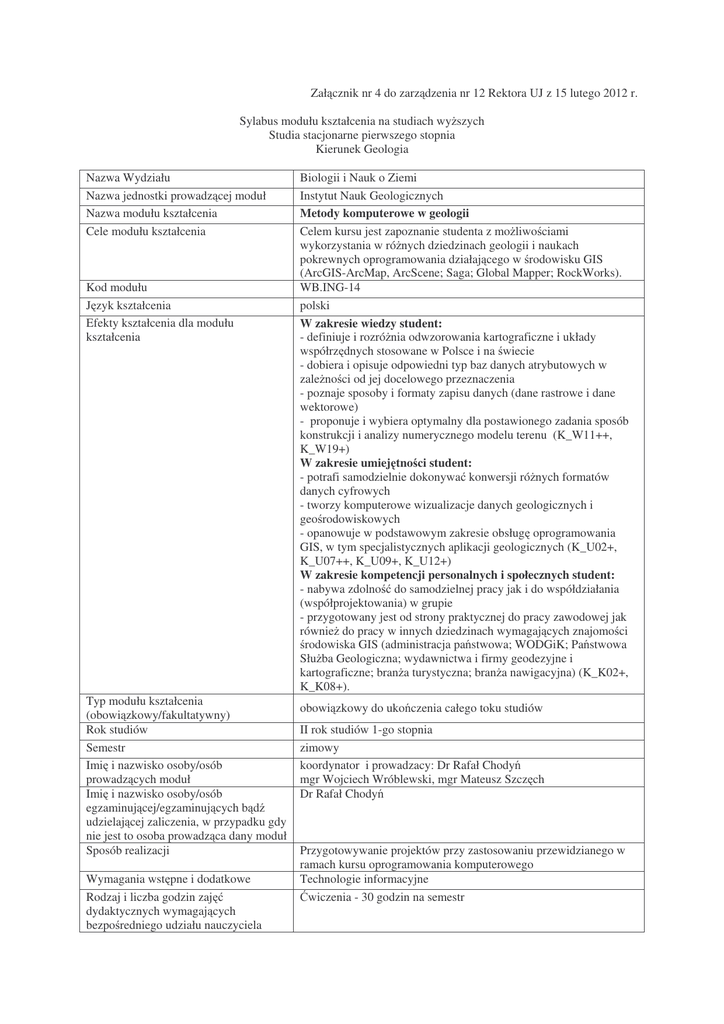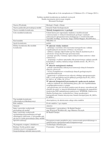 Zał cznik nr 4 do zarz dzenia nr 12 Rektora UJ z 15 lutego 2012 r. Sylabus modułu kształcenia na studiach wy szych Studia stacjonarne pierwszego stopnia Kierunek Geologia Nazwa Wydziału Nazwa jednostki prowadz cej moduł Nazwa modułu kształcenia Cele modułu kształcenia Kod modułu J zyk kształcenia Efekty kształcenia dla modułu kształcenia Typ modułu kształcenia (obowi zkowy/fakultatywny) Rok studiów Semestr Imi i nazwisko osoby/osób prowadz cych moduł Imi i nazwisko osoby/osób egzaminuj cej/egzaminuj cych b d udzielaj cej zaliczenia, w przypadku gdy nie jest to osoba prowadz ca dany moduł Sposób realizacji Wymagania wst pne i dodatkowe Rodzaj i liczba godzin zaj dydaktycznych wymagaj cych bezpo redniego udziału nauczyciela Biologii i Nauk o Ziemi Instytut Nauk Geologicznych Metody komputerowe w geologii Celem kursu jest zapoznanie studenta z mo liwo ciami wykorzystania w ró nych dziedzinach geologii i naukach pokrewnych oprogramowania działaj cego w rodowisku GIS (ArcGIS-ArcMap, ArcScene; Saga; Global Mapper; RockWorks). WB.ING-14 polski W zakresie wiedzy student: - definiuje i rozró nia odwzorowania kartograficzne i układy współrz dnych stosowane w Polsce i na wiecie - dobiera i opisuje odpowiedni typ baz danych atrybutowych w zale no ci od jej docelowego przeznaczenia - poznaje sposoby i formaty zapisu danych (dane rastrowe i dane wektorowe) - proponuje i wybiera optymalny dla postawionego zadania sposób konstrukcji i analizy numerycznego modelu terenu (K_W11++, K_W19+) W zakresie umiej tno ci student: - potrafi samodzielnie dokonywa konwersji ró nych formatów danych cyfrowych - tworzy komputerowe wizualizacje danych geologicznych i geo rodowiskowych - opanowuje w podstawowym zakresie obsług oprogramowania GIS, w tym specjalistycznych aplikacji geologicznych (K_U02+, K_U07++, K_U09+, K_U12+) W zakresie kompetencji personalnych i społecznych student: - nabywa zdolno do samodzielnej pracy jak i do współdziałania (współprojektowania) w grupie - przygotowany jest od strony praktycznej do pracy zawodowej jak równie do pracy w innych dziedzinach wymagaj cych znajomo ci rodowiska GIS (administracja pa stwowa; WODGiK; Pa stwowa Słu ba Geologiczna; wydawnictwa i firmy geodezyjne i kartograficzne; bran a turystyczna; bran a nawigacyjna) (K_K02+, K_K08+). obowi zkowy do uko czenia całego toku studiów II rok studiów 1-go stopnia zimowy koordynator i prowadzacy: Dr Rafał Chody mgr Wojciech Wróblewski, mgr Mateusz Szcz ch Dr Rafał Chody Przygotowywanie projektów przy zastosowaniu przewidzianego w ramach kursu oprogramowania komputerowego Technologie informacyjne wiczenia - 30 godzin na semestr akademickiego i studentów, gdy w danym module przewidziane s takie zaj cia Liczba punktów ECTS przypisana modułowi Bilans punktów ECTS stosowane metody dydaktyczne Metody sprawdzania i kryteria oceny efektów kształcenia uzyskanych przez studentów 3 punkty ECTS Udział w wiczeniach Przygotowanie si do wicze Przygotowanie si do zaliczenia Przygotowanie projektu Suma 30 h 15 h 15 h 15 75 h Kurs obejmuje 1,5 godziny wicze tygodniowo w ci gu semestru i jest realizowany w pracowni komputerowej ING UJ. Dodatkowo przewidziano 1,5 godziny wicze z wykorzystaniem przeno nych stereoskopów "walizkowych", dzi ki którym studenci zapoznaj si z podstaw analizy fotogrametrycznej (stereoskopowej) zdj lotniczych i ortofotomap. W celu efektywniejszej koordynacji i realizacji programu wicze przewidziane jest udost pnianie studentom materiałów w formie elektronicznej, zawieraj cych podstawow wiedz teoretyczn Efekty kształcenia: - z zakresu wiedzy: sprawdzane w formie zaliczenia ustnego oraz konkretnego wiczenia (zadania) do wykonania przy u yciu poznanego oprogramowania komputerowego - z zakresu umiej tno ci: sprawdzane na bie co w trakcie wicze (oceniane s poszczególne zadania (projekty) - z zakresu kompetencji personalnych i społecznych: sprawdzane poprzez ocen kreatywno ci w my leniu i poszukiwaniu ródeł danych przy u yciu komputera oraz umiej tno ci współpracy w grupie Forma i warunki zaliczenia modułu, w tym zasady dopuszczenia do egzaminu, zaliczenia, a tak e forma i warunki zaliczenia poszczególnych zaj wchodz cych w zakres danego modułu Tre ci modułu kształcenia Wykaz literatury podstawowej i uzupełniaj cej, obowi zuj cej do zaliczenia danego modułu Warunkiem zaliczenia modułu jest uzyskanie pozytywnych ocen (min. 3.0) z zada realizowanych w ramach zaj terenowych (GPS) oraz zada ( wicze ) realizowanych przy u yciu konkretnego oprogramowania komputerowego. Ocena ko cowa jest redni z tych zada . Studenci uczestnicz cy w kursie zapoznaj si z podstawowymi zagadnieniami z zakresu: 1. Kartografii - rodzaje odwzorowa kartograficznych, układy współrz dnych stosowane w Polsce, rodzaje elipsoid itp. 2. Geomatyki i rodowiska GIS w geologii - budowa baz danych atrybutowych; operacje i analiza danych geologii powierzchniowej; geologii wgł bnej (geofizyka otworowa, sejsmika); geologii strukturalnej i tektoniki. 3. Teledetekcji - przygotowanie i analiza danych fotogrametrycznych (ortofotomapy, satelitarna interferometria radarowa InSAR). 4. Sposobów i formatów zapisu danych - dane rastrowe i dane wektorowe. 5. Numerycznego modelowania terenu - konstrukcja i analiza modeli cyfrowych (modele NMT, SRI; modele Grid i Tin, modele anaglifowe) w przestrzeni 2,5D i 3D. Literatura podstawowa: Longley i in., 2006. GIS - Teoria i praktyka. Przekład z oryginału "Geographic Information Systems and Sciences" pod redakcj naukow Artura Magnuszewskiego. Materiały uzupełniaj ce w postaci elektronicznej oraz wykaz wybranych stron internetowych o tematyce geoinformatycznej. Wymiar, zasady i forma odbywania praktyk, w przypadku, gdy program kształcenia przewiduje praktyki W ramach kursu przewidziane s 4 godziny wicze terenowych w trakcie których studenci zapoznaj si z funkcjonowaniem systemu globalnego pozycjonowania geograficznego oraz działaniem odbiorników GPS.
