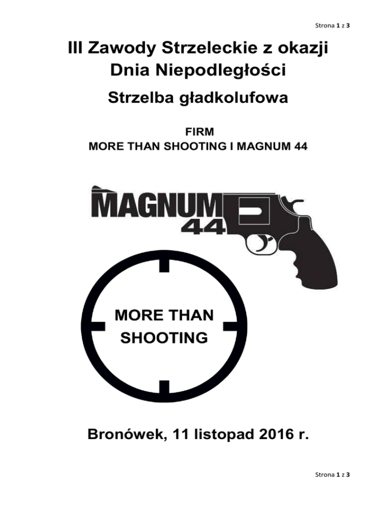 Strona 1 z 3 III Zawody Strzeleckie z okazji Dnia Niepodległości Strzelba gładkolufowa FIRM MORE THAN SHOOTING I MAGNUM 44 Bronówek, 11 listopad 2016 r. Strona 1 z 3 Strona 2 z 3 Skład sędziowski: Sędzia główny: Roman Musiał Sędzia stanowiskowy: Rafał Foryś Strona 2 z 3 Strona 3 z 3 Bronówek 11.11.2016 r. III Zawody Strzeleckie z okazji Dnia Niepodległości Lista Klasyfikacyjna Imię Nazwisko SUMA 1. Oliwia Czaban Maluczko 22 pkt. 2. Maciej Kurant 16 pkt. 3. Waldemar Świętoń 15 pkt. 4. Wiktor Wolanin 12 pkt. 5. Krzysztof Szmit 10 pkt. 6. Filip Panek 9 pkt. 7. Michał Maryszczak 9 pkt. 8. Grzegorz Załoziński 8 pkt. 9. Dominika Szmit 7 pkt. M-ce 10. Strona 3 z 3