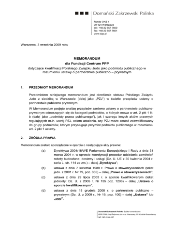 Rondo ONZ 1 00-124 Warszawa tel.: +48 22 557 7600 fax: +48 22 557 7601 www.dzp.pl Warszawa, 3 września 2009 roku MEMORANDUM dla Fundacji Centrum PPP dotyczące kwalifikacji Polskiego Związku Judo jako podmiotu publicznego w rozumieniu ustawy o partnerstwie publiczno – prywatnym 1. PRZEDMIOT MEMORANDUM Przedmiotem niniejszego memorandum jest określenie statusu Polskiego Związku Judo z siedzibą w Warszawie (dalej jako „PZJ”) w świetle przepisów ustawy o partnerstwie publiczno prywatnym. W Memorandum podjęto analizę przepisów zarówno ustawy o partnerstwie publicznoprywatnym odnoszących się do kategorii podmiotów, o których mowa w art. 2 pkt 1 lit. b (dalej jako „podmioty prawa publicznego”), jak i szeregu innych aktów prawnych regulujących m.in. ustrój PZJ, celem ustalenia, czy PZJ moŜe zostać zakwalifikowany do grupy podmiotów, którym przysługuje przymiot podmiotu publicznego w rozumieniu art. 2 pkt 1 ustawy. 2. ŹRÓDŁA PRAWA Memorandum zostało sporządzone w oparciu o następujące akty prawne: (a) Dyrektywa 2004/18/WE Parlamentu Europejskiego i Rady z dnia 31 marca 2004 r. w sprawie koordynacji procedur udzielania zamówień roboty budowlane, dostawy i usługi (Dz. U. UE z 30 kwietnia 2004 r. seria L, str. 114 ze zm.) – dalej „Dyrektywa”; (b) ustawa z dnia 7 kwietnia 1989 r. Prawo o stowarzyszeniach (tekst jedn. z 2001 r. Nr 79, poz. 855) – dalej „Prawo o stowarzyszeniach”; (c) ustawa z dnia 29 lipca 2005 r. o sporcie kwalifikowanym (tekst jednolity: Dz. U. z 2005 r. Nr 155 poz. 1298) – dalej „Ustawa o sporcie kwalifikowanym”; (d) ustawa z dnia 18 grudnia 2008 r. o partnerstwie publiczno – prywatnym (Dz. U. z 2009 r., Nr 19, poz. 100) – dalej „Ustawa” lub „ppp”. Domański Zakrzewski Palinka Spółka komandytowa KRS 27088, Sąd Rejonowy dla m.st. Warszawy, XII Wydział Gospodarczy NIP: 527-21-62-127 3. ANALIZA PRAWNA 3.1 Uwagi ogólne Zakres podmiotowy Ustawy, tj. określenie jednostek organizacyjnych, które mogą nawiązywać współpracę z podmiotem prywatnym w ramach partnerstwa publiczno – prywatnego, został uregulowany w art. 1. Zgodnie ze wskazanym przepisem, wspólna realizacja przedsięwzięcia oparta na podziale zadań i ryzyk moŜliwa jest pomiędzy podmiotem publicznym i partnerem prywatnym. Odnosząc się do zawartej w Ustawie definicji podmiotu publicznego naleŜy zauwaŜyć, Ŝe jest ona stosunkowo szeroka. Obejmuje ona zarówno jednostki sektora finansów publicznych, jak i podmioty (osoby prawne), które zostały opisane w sposób analogiczny jak kategoria podmiotów, o których mowa w art. 3 ust. 1 pkt 3 ustawy z dnia 29 stycznia 2004 r. Prawo zamówień publicznych. Podobnie kwestia ta została uregulowana w ustawie z dnia 9 stycznia 2009 r. o koncesji na roboty budowlane lub usługi. Wszystkie te akty związane są z procesem wyboru wykonawcy określonych zadań publicznych, a punkt wyjścia dla określenia ich zakresu podmiotowego stanowią przepisy dyrektywy 2004/18/WE. Zgodnie z orzecznictwem ETS definicja podmiotu prawa publicznego zawarta w art. 1 ust. 9 dyrektywy 2004/18/WE, jako pojęcie z zakresu prawa wspólnotowego, podlega autonomicznej i jednolitej w całej Wspólnocie wykładni funkcjonalnej.1 Prawo wspólnotowe nie wprowadza odrębnej regulacji dotyczącej nawiązywania współpracy między podmiotem publicznym i prywatnym w formie PPP a procedurę wyboru partnera prywatnego do realizacji zadań przybierających formę zamówienia publicznego lub koncesji poddaje właściwemu dla nich reŜimowi prawnemu. NaleŜy podkreślić, Ŝe krąg podmiotów publicznych zawarty w ustawie PPP, w tym określonych w art. 2 pkt 1 lit. b, został bezpośrednio wyznaczony przez katalog podmiotów zobowiązanych do stosowania ustawy PZP.2 W związku z tym zakres pojęciowy obu terminów naleŜy, naszym zdaniem, uznać za toŜsamy. 3.2 Podmiot prawa publicznego jako podmiot publiczny Stosownie do regulacji zawartych w Ustawie, „podmiotem publicznym ” jest m.in. osoba prawna utworzona w szczególnym celu zaspokajania potrzeb o charakterze powszechnym niemających charakteru przemysłowego ani handlowego, jeŜeli jednostki sektora finansów publicznych lub państwowe jednostki organizacyjne nieposiadające osobowości prawnej, pojedynczo lub wspólnie, bezpośrednio lub pośrednio przez inny podmiot finansują je w ponad 50% lub posiadają ponad połowę udziałów albo akcji, lub sprawują nadzór nad organem zarządzającym lub mają prawo do powoływania ponad polowy składu organu nadzorczego lub zarządzającego. Interpretacja definicji podmiotu prawa publicznego powinna się skoncentrować przede wszystkim na wykładni następujących zwrotów uŜytych przez ustawodawcę: 1 zob. orzeczenie z dnia 12 grudnia 2002 r. w sprawie C-470/99 2 Por. projekt ustawy o partnerstwie publiczno-prywatnym - druk sejmowy 1180 z dnia 20.10.2008 r. 2 3.2.2 (i) „(osoba prawna) utworzona w szczególnym celu zaspakajania potrzeb o charakterze powszechnym” (ii) „niemających charakteru przemysłowego ani handlowego” oraz (iii) zaangaŜowaniu (organizacyjnym lub finansowym) publicznych w działalność danego podmiotu. władz Podmiot utworzony w szczególnym celu zaspokajania potrzeb o charakterze powszechnym W orzecznictwie Europejskiego Trybunału Sprawiedliwości podkreśla się, Ŝe decydujące dla nadania danej jednostce organizacyjnej statusu podmiotu prawa publicznego ma określenie celu, dla realizacji którego została owa Wskazać bowiem naleŜy, Ŝe brzmienie jednostka powołana3. interpretowanego zwrotu „osoba prawna utworzona w szczególnym celu” moŜe sugerować, Ŝe istotne dla kwalifikacji danego podmiotu, jako „podmiotu publicznego” mają postanowienia przede wszystkim dokumentów załoŜycielskich (statuty). JednakŜe ETS w swoich orzeczeniach nakazuje doszukiwać się celu utworzenia danej osoby prawnej nie tylko w statuach, ale równieŜ innych dokumentach, z których moŜna byłoby odc