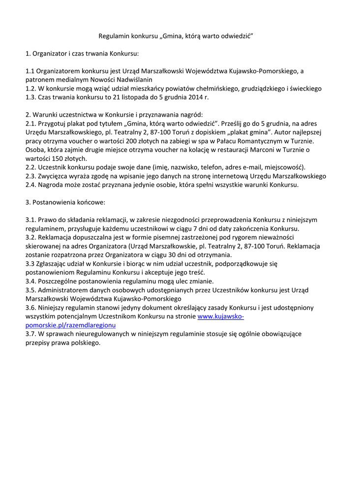 Regulamin konkursu „Gmina, którą warto odwiedzić” 1. Organizator i czas trwania Konkursu: 1.1 Organizatorem konkursu jest Urząd Marszałkowski Województwa Kujawsko-Pomorskiego, a patronem medialnym Nowości Nadwiślanin 1.2. W konkursie mogą wziąć udział mieszkańcy powiatów chełmińskiego, grudziądzkiego i świeckiego 1.3. Czas trwania konkursu to 21 listopada do 5 grudnia 2014 r. 2. Warunki uczestnictwa w Konkursie i przyznawania nagród: 2.1. Przygotuj plakat pod tytułem „Gmina, którą warto odwiedzić”. Prześlij go do 5 grudnia, na adres Urzędu Marszałkowskiego, pl. Teatralny 2, 87-100 Toruń z dopiskiem „plakat gmina”. Autor najlepszej pracy otrzyma voucher o wartości 200 złotych na zabiegi w spa w Pałacu Romantycznym w Turznie. Osoba, która zajmie drugie miejsce otrzyma voucher na kolację w restauracji Marconi w Turznie o wartości 150 złotych. 2.2. Uczestnik konkursu podaje swoje dane (imię, nazwisko, telefon, adres e-mail, miejscowość). 2.3. Zwycięzca wyraża zgodę na wpisanie jego danych na stronę internetową Urzędu Marszałkowskiego 2.4. Nagroda może zostać przyznana jedynie osobie, która spełni wszystkie warunki Konkursu. 3. Postanowienia końcowe: 3.1. Prawo do składania reklamacji, w zakresie niezgodności przeprowadzenia Konkursu z niniejszym regulaminem, przysługuje każdemu uczestnikowi w ciągu 7 dni od daty zakończenia Konkursu. 3.2. Reklamacja dopuszczalna jest w formie pisemnej zastrzeżonej pod rygorem nieważności skierowanej na adres Organizatora (Urząd Marszałkowskie, pl. Teatralny 2, 87-100 Toruń. Reklamacja zostanie rozpatrzona przez Organizatora w ciągu 30 dni od otrzymania. 3.3 Zgłaszając udział w Konkursie i biorąc w nim udział uczestnik, podporządkowuje się postanowieniom Regulaminu Konkursu i akceptuje jego treść. 3.4. Poszczególne postanowienia regulaminu mogą ulec zmianie. 3.5. Administratorem danych osobowych udostępnianych przez Uczestników konkursu jest Urząd Marszałkowski Województwa Kujawsko-Pomorskiego 3.6. Niniejszy regulamin stanowi jedyny dokument określający zasady Konkursu i jest udostępniony wszystkim potencjalnym Uczestnikom Konkursu na stronie www.kujawskopomorskie.pl/razemdlaregionu 3.7. W sprawach nieuregulowanych w niniejszym regulaminie stosuje się ogólnie obowiązujące przepisy prawa polskiego.