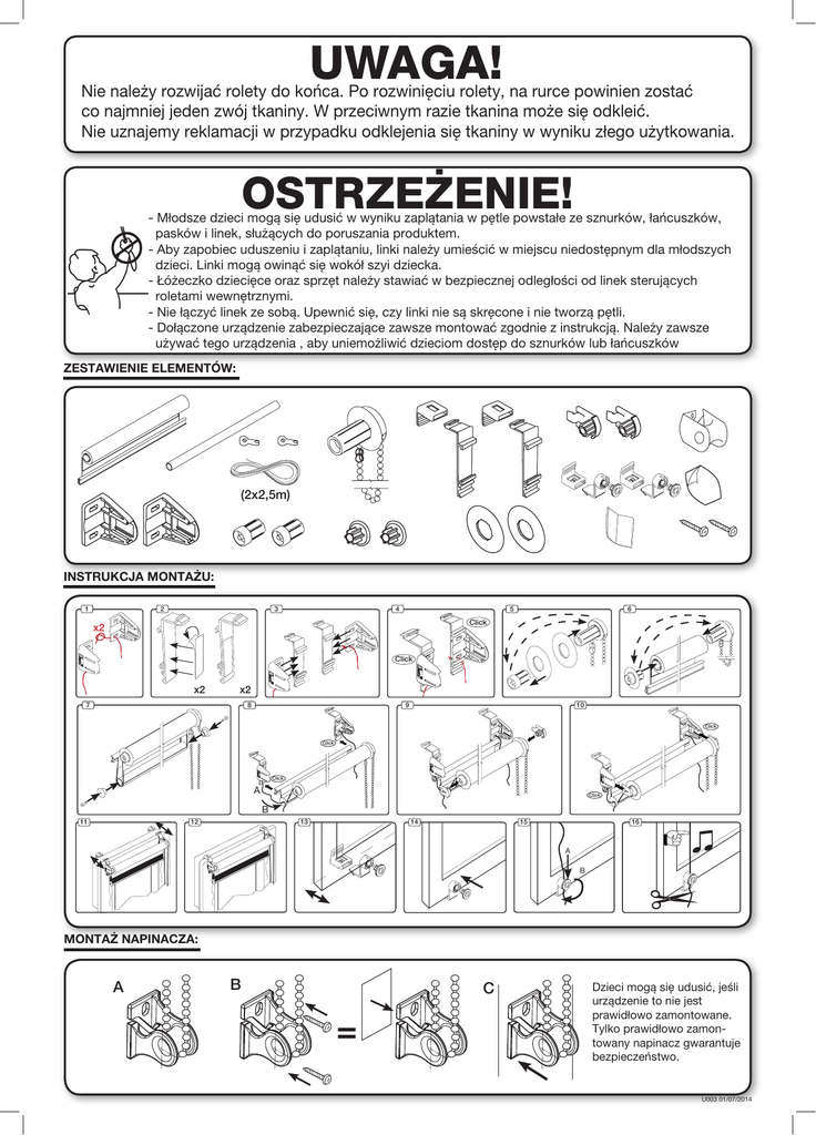 UWAGA! Nie należy rozwijać rolety do końca. Po rozwinięciu rolety, na rurce powinien zostać co najmniej jeden zwój tkaniny. W przeciwnym razie tkanina może się odkleić. Nie uznajemy reklamacji w przypadku odklejenia się tkaniny w wyniku złego użytkowania. OSTRZEŻENIE! - Młodsze dzieci mogą się udusić w wyniku zaplątania w pętle powstałe ze sznurków, łańcuszków, pasków i linek, służących do poruszania produktem. - Aby zapobiec uduszeniu i zaplątaniu, linki należy umieścić w miejscu niedostępnym dla młodszych dzieci. Linki mogą owinąć się wokół szyi dziecka. - Łóżeczko dziecięce oraz sprzęt należy stawiać w bezpiecznej odległości od linek sterujących roletami wewnętrznymi. - Nie łączyć linek ze sobą. Upewnić się, czy linki nie są skręcone i nie tworzą pętli. - Dołączone urządzenie zabezpieczające zawsze montować zgodnie z instrukcją. Należy zawsze używać tego urządzenia , aby uniemożliwić dzieciom dostęp do sznurków lub łańcuszków ZESTAWIENIE ELEMENTÓW: (2x2,5m) INSTRUKCJA MONTAŻU: 1 2 3 4 5 6 Click x2 Click x2 x2 7 8 9 10 Click Click Click A Click B 11 12 13 14 15 16 A B MONTAŻ NAPINACZA: A B C = Dzieci mogą się udusić, jeśli urządzenie to nie jest prawidłowo zamontowane. Tylko prawidłowo zamontowany napinacz gwarantuje bezpieczeństwo. U003 01/07/2014