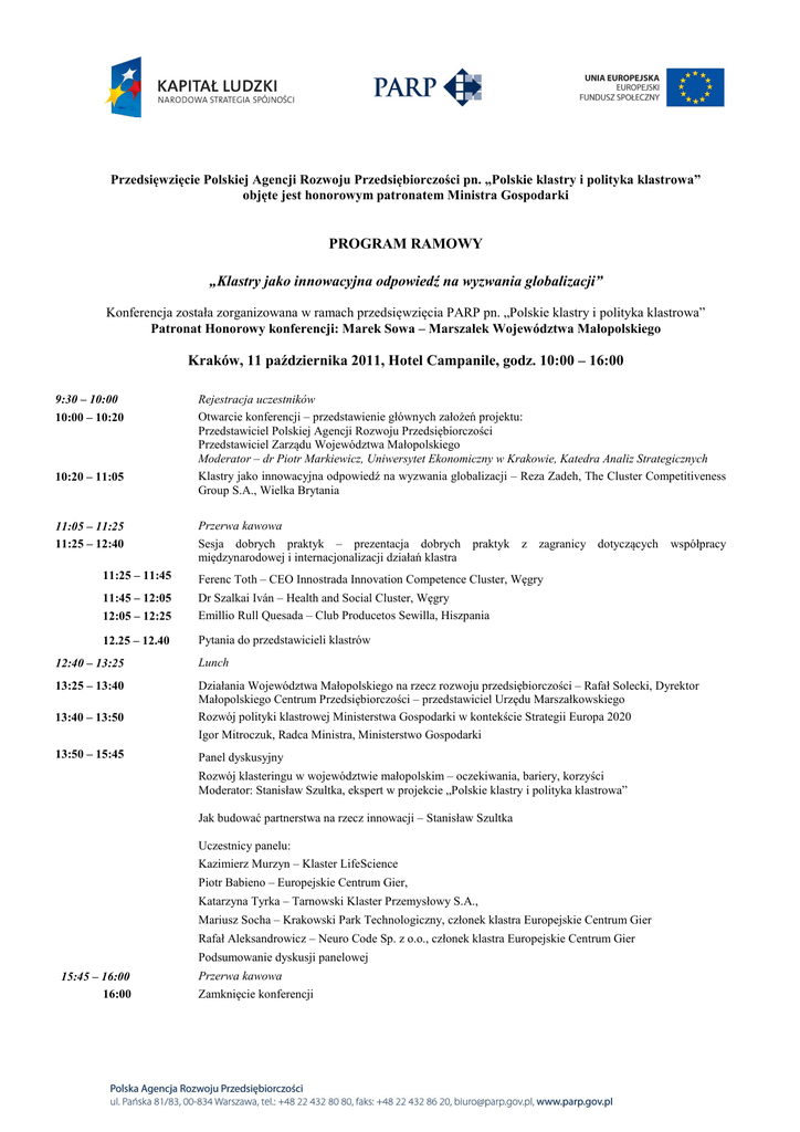 Przedsięwzięcie Polskiej Agencji Rozwoju Przedsiębiorczości pn. „Polskie klastry i polityka klastrowa” objęte jest honorowym patronatem Ministra Gospodarki PROGRAM RAMOWY „Klastry jako innowacyjna odpowiedź na wyzwania globalizacji” Konferencja została zorganizowana w ramach przedsięwzięcia PARP pn. „Polskie klastry i polityka klastrowa” Patronat Honorowy konferencji: Marek Sowa – Marszałek Województwa Małopolskiego Kraków, 11 października 2011, Hotel Campanile, godz. 10:00 – 16:00 9:30 – 10:00 10:00 – 10:20 10:20 – 11:05 11:05 – 11:25 11:25 – 12:40 Rejestracja uczestników Otwarcie konferencji – przedstawienie głównych założeń projektu: Przedstawiciel Polskiej Agencji Rozwoju Przedsiębiorczości Przedstawiciel Zarządu Województwa Małopolskiego Moderator – dr Piotr Markiewicz, Uniwersytet Ekonomiczny w Krakowie, Katedra Analiz Strategicznych Klastry jako innowacyjna odpowiedź na wyzwania globalizacji – Reza Zadeh, The Cluster Competitiveness Group S.A., Wielka Brytania Przerwa kawowa Sesja dobrych praktyk – prezentacja dobrych praktyk z zagranicy dotyczących międzynarodowej i internacjonalizacji działań klastra 11:25 – 11:45 Ferenc Toth – CEO Innostrada Innovation Competence Cluster, Węgry 11:45 – 12:05 12:05 – 12:25 Dr Szalkai Iván – Health and Social Cluster, Węgry Emillio Rull Quesada – Club Producetos Sewilla, Hiszpania 12.25 – 12.40 Pytania do przedstawicieli klastrów współpracy 12:40 – 13:25 Lunch 13:25 – 13:40 Działania Województwa Małopolskiego na rzecz rozwoju przedsiębiorczości – Rafał Solecki, Dyrektor Małopolskiego Centrum Przedsiębiorczości – przedstawiciel Urzędu Marszałkowskiego Rozwój polityki klastrowej Ministerstwa Gospodarki w kontekście Strategii Europa 2020 Igor Mitroczuk, Radca Ministra, Ministerstwo Gospodarki 13:40 – 13:50 13:50 – 15:45 Panel dyskusyjny Rozwój klasteringu w województwie małopolskim – oczekiwania, bariery, korzyści Moderator: Stanisław Szultka, ekspert w projekcie „Polskie klastry i polityka klastrowa” Jak budować partnerstwa na rzecz innowacji – Stanisław Szultka Uczestnicy panelu: Kazimierz Murzyn – Klaster LifeScience Piotr Babieno – Europejskie Centrum Gier, Katarzyna Tyrka – Tarnowski Klaster Przemysłowy S.A., Mariusz Socha – Krakowski Park Technologiczny, członek klastra Europejskie Centrum Gier Rafał Aleksandrowicz – Neuro Code Sp. z o.o., członek klastra Europejskie Centrum Gier Podsumowanie dyskusji panelowej 15:45 – 16:00 16:00 Przerwa kawowa Zamknięcie konferencji Konferencja jest współfinansowana przez Unię Europejską ze środków Europejskiego Funduszu Społecznego w ramach projektu systemowego PARP „Rozwój zasobów ludzkich poprzez promowanie wiedzy, transfer i upowszechnianie innowacji” z Programu Operacyjnego Kapitał Ludzki, poddziałanie 2.1.3. Patronat Honorowy konferencji: Marek Sowa – Marszałek Województwa Małopolskiego Organizatorem konferencji jest Polska Agencja Rozwoju Przedsiębiorczości we współpracy z Urzędem Marszałkowskim Województwa Małopolskiego. Miejsce spotkania: Hotel Campanile ul. Św. Tomasza 34 31-023 Kraków Konferencja organizowana jest w ramach przedsięwzięcia „Polskie klastry i polityka klastrowa”, którego głównym celem jest wzmocnienie polskich klastrów, podniesienie ich konkurencyjności i zdolności innowacyjnej poprzez rozwój kapitału ludzkiego oraz poprzez podniesienie efektywności kształtowania polityki klastrowej. W trakcie konferencji dystrybuowane będą darmowe katalogi prezentujące klastry w Małopolsce. 12 października 2011 na Małym Rynku w Krakowie w ramach Małopolskiego Festiwalu Innowacji odbędzie się wystawa klastrów, na której klastry z regionu zaprezentują swoją działalność. Lista wystawców: 1. 2. 3. 4. 5. Klaster Life Science Stowarzyszenie Multimediów i Systemów Informacyjnych Multiklaster MedCluster Tarnowski Klaster Przemysłowy S.A. Europejski Klaster Gier Źródło: http://maps.google.pl/ Organizator spotkania zapewnia tłumaczenie symultaniczne, poczęstunek w trakcie przerw kawowych oraz lunch. Rejestracja: http://www.ecorys.pl/klastry/ Prośba o potwierdzenie udziału/Dodatkowe informacje: tel. : (022) 339 45 54 e-mail: [email protected] Zapraszamy również do odwiedzenia strony: http://www.pi.gov.pl/klastry/chapter_95353.asp