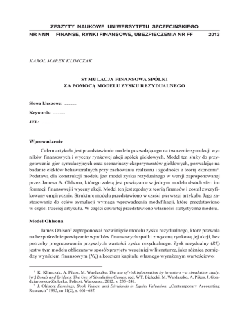ZESZYTY NAUKOWE UNIWERSYTETU SZCZECIŃSKIEGO NR NNN FINANSE, RYNKI FINANSOWE, UBEZPIECZENIA NR FF 2013 Karol Marek Klimczak Symulacja finansowa spółki za pomocą modelu zysku rezydualnego Słowa kluczowe: ............ Keywords: ............ JEL: ............ Wprowadzenie Celem artykułu jest przedstawienie modelu pozwalającego na tworzenie symulacji wyników finansowych i wyceny rynkowej akcji spółek giełdowych. Model ten służy do przygotowania gier symulacyjnych oraz scenariuszy eksperymentów giełdowych, pozwalając na badanie efektów behawioralnych przy zachowaniu realizmu i zgodności z teorią ekonomii. Podstawą dla konstrukcji modelu jest model zysku rezydualnego w wersji zaproponowanej przez Jamesa A. Ohlsona, którego zaletą jest powiązanie w jednym modelu dwóch sfer: informacji finansowej i wyceny akcji. Model ten jest zgodny z teorią finansów i został zweryfikowany empirycznie. Strukturę modelu przedstawiono w części pierwszej artykułu. Jego zastosowanie do celów symulacji wymaga wprowadzenia modyfikacji, które przedstawiono w części trzeciej artykułu. W części czwartej przedstawiono własności statystyczne modelu. Model Ohlsona James Ohlson zaproponował rozwinięcie modelu zysku rezydualnego, które pozwala na bezpośrednie powiązanie wyników finansowych spółki z wyceną rynkową jej akcji, bez potrzeby prognozowania przyszłych wartości zysku rezydualnego. Zysk rezydualny (RIt) jest w tym modelu obliczany w sposób przyjęty wcześniej w literaturze, jako różnica pomiędzy wynikiem finansowym (NIt) a kosztem kapitału własnego wyrażonym wartościowo: K. Klimczak, A. Pikos, M. Wardaszko: The use of risk information by investors – a simulation study, [w:] Bonds and Bridges: The Use of Simulation Games, red. W.T. Bielecki, M. Wardaszko, A. Pikos, J. Gondziarowska-Ziołecka, Poltext, Warszawa, 2012, s. 235–241. J. Ohlson: Earnings, Book Values, and Dividends in Equity Valuation, „Contemporary Accounting Research” 1995, nr 11(2), s. 661–687. Karol Marek Klimczak 5, W 1, W UH u %9W 52(W UH u %9W W przedstawionej formie, znak zysku rezydualnego świadczy o budowie (+) lub niszczeniu (–) wartości przez spółkę w danym okresie. Wartość spółki zależy więc od oczekiwanych wartości zysku rezydualnego w przyszłych okresach. Zdyskontowana suma tych wartości stanowi premię ponad wartość bieżącą aktywów netto spółki. Aktywa netto (BVt) są w tym modelu definiowane jako suma aktywów spółki wycenionych do wartości godziwej. Model wyceny kapitału własnego spółki (MVEt) za pomocą zysku rezydualnego przyjmuje następującą formę: f ( 5, W 09(W %9W ¦ L U L H Ohlson zastąpił prognozy zysku rezydualnego przyjęciem założenia o autoregresyjnej strukturze zysku rezydualnego. Przyjął, że zysk rezydualny charakteryzuje się stopniowym zanikaniem, co powoduje że asymptotycznie jego wartość dąży do zera. Założenie to jest zgodne z przyjętymi w ekonomii prawami funkcjonowania rynków konkurencyjnych, przewidującymi zanik nadzwyczajnych rent. Założeniu temu przeczy natomiast praktyka identyfikacji aktywów według standardów rachunkowości, które zabraniają uwzględniania w wartości netto części aktywów niematerialnych oraz pozwalają na wycenę większości aktywów materialnych według wartości historycznej. W rezultacie suma aktywów netto jest stale zaniżona relatywnie do ich wartości bieżącej, co powoduje utrzymanie się zysku rezydualnego na poziomie wyższym od zera. Forma matematyczna modelu procesu autoregresyjnego zysku rezydualnego jest następująca: 5, W Z 5, W Y W H W YW JYW H W gdzie symbolami ω i γ oznaczono parametry autoregresyjne zawierające się w przedziale od zera do jedności, a symbolem ε oznaczono zmienne losowe (zakłócenia) o średniej zero. Na uwagę zasługuje wprowadzenie przez Ohlsona dodatkowej zmiennej vt, która reprezentuje dodatkowe informacje, inne niż zysk rezydualny, dostępne w okresie t, istotne dla prognozowania zysku rezydualnego w okresie t + 1. Twórca modelu przyjął więc, że zysk rezydualny zawiera składnik będący odpowiednikiem szoku, który jest znany z wyprzedzeniem jednego okresu. Przyjęcie tych założeń pozwala na uzyskanie zamkniętej formy modelu wyceny: UH Z 09(W %9W 5,W YW U Z U H H Z UH J Jak widać, model Ohlsona wymaga pomiaru trzech zmiennych: zysku rezydualnego, sumy aktywów netto i szoku w zysku rezydualnym, oczekiwanego w okresie następnym. M. Runsten: The association between accounting information and stock prices: model development and empirical tests based on Swedish data, Stockholm School of Economics, Sztokholm 1998. Symulacja finansowa spółki za pomocą modelu zysku rezydualnego Model wymaga oszacowania wartości trzech parametrów, z założenia stałych w czasie, lecz zróżnicowanych w przekroju: współczynnika autoregresji zysku rezydualnego, współczynnika autoregresji szoku w zysku rezydualnym oraz kosztu kapitału własnego. Dla uproszczenia model ten przedstawia się często za pomocą dwóch parametrów, ponieważ wszystkie parametry są stałe w czasie: 09(W %9W D5,W D YW Model Ohlsona został pozytywnie zweryfikowany w badaniach empirycznych, które wskazały, że osiąga on stopień dopasowania podobny do alternatywnych modeli. Wyższy poziom dopasowania można osiągnąć za pomocą trafnego prognozowania przyszłych wartości zysku rezydualnego, lecz wówczas utracona zostaje główna zaleta modelu – jego prostota. W późniejszej publikacji model ten został zresztą rozszerzony, aby uwzględnić zróżnicowanie aktywów na finansowe i operacyjne. Model symulacyjny Tworząc model symulacyjny ustalono, że parametry modelu Ohlsona będą miały charakter egzogeniczny. Dzięki temu osoba stosująca model może zdecydować o tempie zanikania zysku rezydualnego oraz o poziomie ryzyka w danym scenariuszu lub portfelu scenariuszy. Egzogeniczne są także wartości początkowe aktywów netto i zys