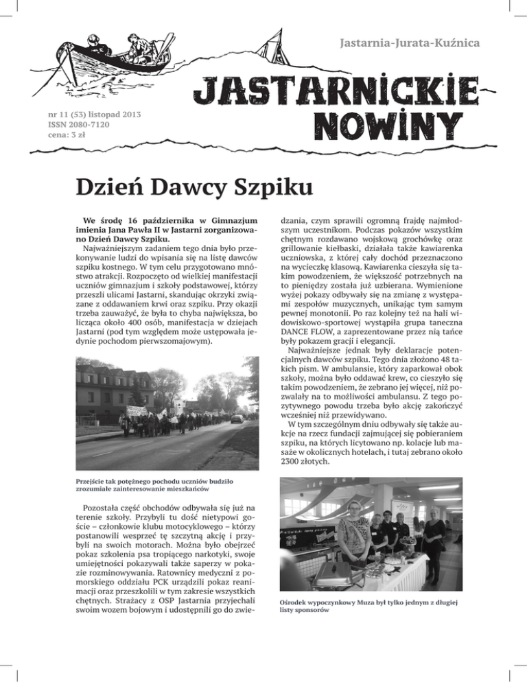 Dzień Dawcy Szpiku We środę 16 października w Gimnazjum imienia Jana Pawła II w Jastarni zorganizowano Dzień Dawcy Szpiku. Najważniejszym zadaniem tego dnia było przekonywanie ludzi do wpisania się na listę dawców szpiku kostnego. W tym celu przygotowano mnóstwo atrakcji. Rozpoczęto od wielkiej manifestacji uczniów gimnazjum i szkoły podstawowej, którzy przeszli ulicami Jastarni, skandując okrzyki związane z oddawaniem krwi oraz szpiku. Przy okazji trzeba zauważyć, że była to chyba największa, bo licząca około 400 osób, manifestacja w dziejach Jastarni (pod tym względem może ustępowała jedynie pochodom pierwszomajowym). dzania, czym sprawili ogromną frajdę najmłodszym uczestnikom. Podczas pokazów wszystkim chętnym rozdawano wojskową grochówkę oraz grillowanie kiełbaski, działała także kawiarenka uczniowska, z której cały dochód przeznaczono na wycieczkę klasową. Kawiarenka cieszyła się takim powodzeniem, że większość potrzebnych na to pieniędzy została już uzbierana. Wymienione wyżej pokazy odbywały się na zmianę z występami zespołów muzycznych, unikając tym samym pewnej monotonii. Po raz kolejny też na hali widowiskowo-sportowej wystąpiła grupa taneczna DANCE FLOW, a zaprezentowane przez nią tańce były pokazem gracji i elegancji. Najważniejsze jednak były deklaracje potencjalnych dawców szpiku. Tego dnia złożono 48 takich pism. W ambulansie, który zaparkował obok szkoły, można było oddawać krew, co cieszyło się takim powodzeniem, że zebrano jej więcej, niż pozwalały na to możliwości ambulansu. Z tego pozytywnego powodu trzeba było akcję zakończyć wcześniej niż przewidywano. W tym szczególnym dniu odbywały się także aukcje na rzecz fundacji zajmującej się pobieraniem szpiku, na których licytowano np. kolacje lub masaże w okolicznych hotelach, i tutaj zebrano około 2300 złotych. Przejście tak potężnego pochodu uczniów budziło zrozumiałe zainteresowanie mieszkańców Pozostała część obchodów odbywała się już na terenie szkoły. Przybyli tu dość nietypowi goście – członkowie klubu motocyklowego – którzy postanowili wesprzeć tę szczytną akcję i przybyli na swoich motorach. Można było obejrzeć pokaz szkolenia psa tropiącego narkotyki, swoje umiejętności pokazywali także saperzy w pokazie rozminowywania. Ratownicy medyczni z pomorskiego oddziału PCK urządzili pokaz reanimacji oraz przeszkolili w tym zakresie wszystkich chętnych. Strażacy z OSP Jastarnia przyjechali swoim wozem bojowym i udostępnili go do zwie- Ośrodek wypoczynkowy Muza był tylko jednym z długiej listy sponsorów Nagromadzenie różnych atrakcji tego dnia mogło zadowolić nawet najbardziej narzekających na to, że w Jastarni poza sezonem nic się nie dzieje. Jednak aby tego dokonać, potrzebni byli sponsorzy. Organizatorzy imprezy, przede wszystkim dyrekcja i grono pedagogiczne Gimnazjum, zadbali o to, a lista pozyskanych przez nich spon- sorów całej imprezy musi budzić podziw, jest nawet zbyt długa, aby ją tu przytoczyć. – Wszystkim sponsorom i ludziom, którzy wnieśli swój wkład w organizację tej imprezy, jak najserdeczniej za to dziękuję – mówiła Ewa Kwiecińska, dyrektorka Gimnazjum. – Sukces tej imprezy jest także Waszą zasługą – dodała. Święto Szkoły W poniedziałek 30 września w Szkole Podstawowej w Jastarni obchodzono Święto Szkoły. Dla uczniów klas pierwszych był to niezapomniany dzień, zostali bowiem paso- wani na pełnoprawnych uczniów tej szkoły. Dla starszych uczniów zorganizowano turniej wiedzy o patronie szkoły, czyli o Józefie Wybickim. Pasowanie na ucznia było dla pierwszoklasistów ogromnym przeżyciem Dzień Edukacji Narodowej W poniedziałek 14 października w obydwu naszych szkołach: Szkole Podstawowej i Gimnazjum, obchodzono Święto Edukacji Narodowej, zwane dawniej Dniem Nauczyciela. Uroczystości tego dnia rozpoczęły się Mszą świętą odprawioną w miejscowym kościele, następnie każda ze szkół miała własną uroczystość: Szkoła Podstawowa – apel, Gimnazjum – akademię. Z okazji Dnia Edukacji przyznano nagrody dyrektora szkoły oraz nagrodę burmistrza. W podstawówce nagrodę burmistrza otrzymała Hanna Konkol, nagrody dyrektora szkoły przyznano zaś: Leszkowi Hermannowi, Robertowi Beniowskiemu, Michało- 2 Jastarnickie Nowiny wi Lessnau, Marcie Lessnau-Kaczyńskiej, Monice Konkol, Edycie Fladze i Ewie Michnowskiej. Spośród nauczycieli, pracowników administracji i obsługi Gimnazjum nagrodę burmistrza wręczono Ewie Kwiecińskiej, nagrodę dyrektora otrzymali: Bożena Urbanowicz, Anna Trytek, Łukasz Gronalewski, Anna Foltyńska, Danuta Tretyn i Monika Konkel. W Gimnazjum odbyło się także pasowanie uczniów pierwszych klas na gimnazjalistów. Tutaj przysięgę na sztandar szkoły złożyło 47 uczniów. Chociaż święto to zmieniło nazwę, zwyczaj wręczania kwiatów pozostał, i tego dnia nauczyciele i pracownicy obu szkół zostali nimi dosłownie zasypani. Uczniowie pierwszych klas Gimnazjum składają ślubowanie na sztandar szkoły Bałtykarium Dla wszystkich mieszkańców Jastarni normalną koleją rzeczy wydaje się posezonowe zamykanie różnych działalności gospodarczych czynnych podczas lata. Dlatego też zrozumiałe zdumienie budzi, jeśli taka działalność prowadzona jest dalej. Z takim przypadkiem mamy właśnie do czynienia w Juracie, gdzie od lipca w budynku dawnej szkoły działa Bałtykarium. Nie tylko nie zawiesiło ono swojej działalności do następnego sezonu letniego, ale nawet uatrakcyjnia swoją kolekcję, sprowadzając coraz to nowe okazy. Całą jego ofertę można podzielić na dwa podstawowe działy: akwarystykę i terrarystykę. W części akwarystycznej eksponowane są przede wszystkim ryby zamieszkujące Bałtyk, chociaż są tam też akwaria prezentujące życie rafy koralowej. Wiadomo, że do żadnego akwarium nie można wkładać rąk, jednak tutaj
