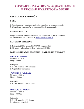 OTWARTE ZAWODY W AQUATHLONIE O PUCHAR DYREKTORA MOSiR REGULAMIN ZAWODÓW I. CEL 1. Popularyzacja i przedstawienie tej dyscypliny w naszym regionie. 2. Wyłonienie zwycięzców w poszczególnych kategoriach. II. ORGANIZATOR Miejski Ośrodek Sportu i Rekreacji, ul. Kopernika 38, 06-500 Mława, tel. 236551571, fax. 236551579, www.mosir.mlawa.pl III. TERMIN I MIEJSCE 1. 1 sierpnia 2009r. godz. 10:00 (9:00 rozgrzewka) 2. Pływanie – pływalnia 2. Bieg – stadion MOSiR IV. KLASYFIKACJE, DYSTANSE I KATEGORIE WIEKOWE • WYŚCIG I (dzieci) Pływanie – 150 m Bieg – 800 m Kategorie: 1. K i M, rocznik: 1995 i młodsi 2. Najmłodszy zawodnik • WYŚCIG II (młodzież) Pływanie – 300 m Bieg – 1500 m Kategorie: 1. K i M, rocznik: 1992 – 1994 • WYŚCIG III (OPEN) Pływanie – 600 m Bieg – 3000 m Kategorie: 1. K i M, rocznik: 1991 i starsi 2. Najstarszy zawodnik V. NAGRODY 1. Zawodnicy otrzymują dyplomy, za zajęcie miejsc I –VI w poszczególnych kategoriach wiekowych 2. Nagrody rzeczowe, otrzymują zawodnicy (K i M) w wyścigu OPEN za zajęcie miejsc I-III 3. Najmłodszy i najstarszy zawodnik otrzymuje puchar. VI. WARUNKI UCZESTNICTWA 1. Nie pobiera się wpisowego za uczestnictwo w zawodach. 2. Zawody mają formę otwartą, uczestnikami zawodów mogą być wszyscy chętni, którzy zgłoszą się do biura zawodów i nie mają przeciwwskazań lekarskich. 3. Do zawodów dopuszczone zostaną wyłącznie osoby, które złożą zaświadczenie lekarskie o braku przeciwwskazań do udziału w zawodach lub, które złożą podpisane własnoręcznie, a w przypadku osób niepełnoletnich przez przedstawiciela ustawowego, oświadczenie o zdolności do udziału w zawodach. W przypadku zgłoszeń grupowych (np. szkoły, stowarzyszenia) za sprawdzenie badań lekarskich lub przedmiotowych oświadczeń odpowiedzialność ponoszą kierownicy jednostek organizacyjnych zgłaszających udział danej grupy w zawodach. 4. Zawodnicy startują na własną odpowiedzialność. 5. Zawodnicy są zobligowani do przedstawienia dokumentu ze zdjęciem, potwierdzającego tożsamości. 6. O przynależności do kategorii wiekowej decyduje rok urodzenia. 7. Zawodnicy muszą posiadać sprzęt pływacki (strój pływacki) oraz strój biegowy (niedozwolone jest bieganie bez koszulki). VII. ZGŁOSZENIA Zgłoszenia do zawodów proszę przekazywać : do sekretariatu MOSiR na adres e-mail: [email protected] osobiście u gł. specjalisty d.s. pływalni lub w dniu zawodów Zgłoszenie powinno zawierać imię i nazwisko oraz rok urodzenia. Dodatkowe informacje www.mosir.mlawa.pl lub pod nr tel. 236551577 VIII. POSTANOWIENIA KOŃCOWE 1. Organizator zapewnia zabezpieczenie medyczne oraz przebieralnię. 2. Organizator zastrzega sobie prawo interpretacji oraz zmian niniejszego regulaminu. 3. Zawody zostaną przeprowadzone według regulaminu Polskiego Związku Triathlonu. 4. Wyniki zostaną umieszczone na stronie internetowej MOSiR www.mosir.mlawa.pl 5. Organizator zastrzega sobie prawo do odwołania zawodów lub zmiany ich terminu. UWAGA! Wszyscy uczestnicy zobowiązani są do zapoznania się z regulaminem OTWARTYCH ZAWODÓW W AQUATHLONIE oraz jego przestrzegania.