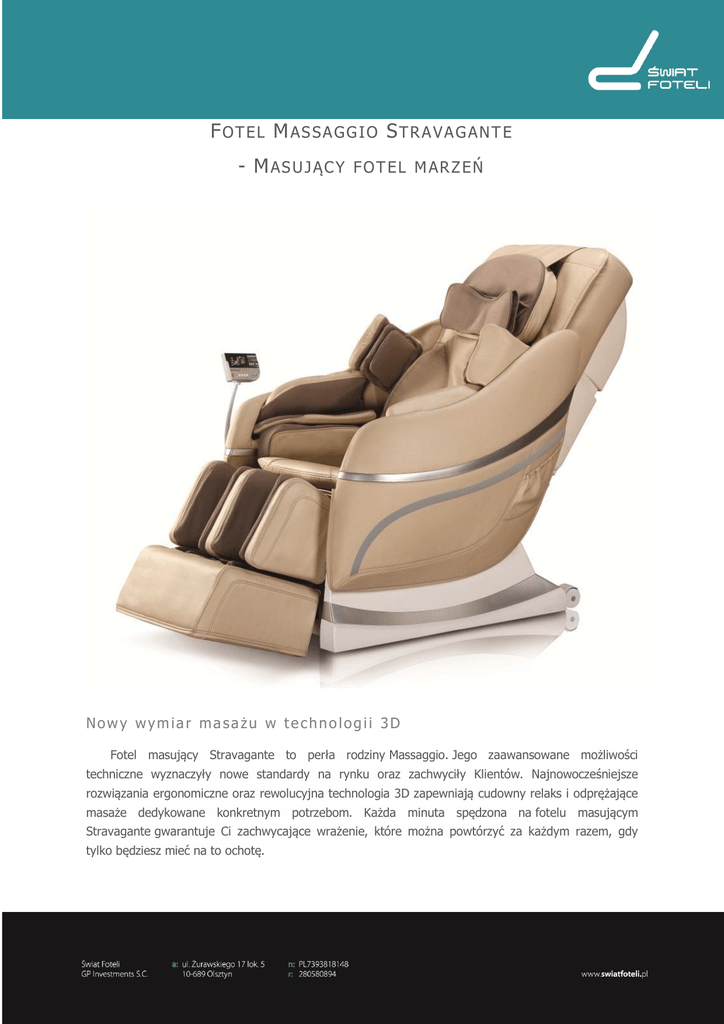 FOTEL M ASSAGGIO STRAVAGANT E - MASUJĄCY FOT EL M ARZEŃ Nowy wymiar masażu w technolog ii 3D Fotel masujący Stravagante to perła rodziny Massaggio. Jego zaawansowane możliwości techniczne wyznaczyły nowe standardy na rynku oraz zachwyciły Klientów. Najnowocześniejsze rozwiązania ergonomiczne oraz rewolucyjna technologia 3D zapewniają cudowny relaks i odprężające masaże dedykowane konkretnym potrzebom. Każda minuta spędzona na fotelu masującym Stravagante gwarantuje Ci zachwycające wrażenie, które można powtórzyć za każdym razem, gdy tylko będziesz mieć na to ochotę. Funkcja rozciąg ania całego ciała Fotel Stravagante jako jeden z nielicznych modeli na rynku, dzięki aktywnym poduszkom powietrznym zlokalizowanych w ramionach, dosłownie i w przenośni obejmie Cię prawdziwą przyjemnością oraz rozciągnie Twoje ciało likwidując wszystkie napięcia mięśni! Idealna ergonomia Fotel masujący Stravagante idealnie dopasuje się do Twojego wzrostu i kształtów ciała, dzięki czemu każdy masaż będzie maksymalnie efektywny. Nasz fotel precyzyjnie zeskanuje linię Twojego kręgosłupa oraz określi mikro punkty, które wymagają najbardziej intensywnego masażu. Masaż pleców w syst emie 3D 4 specjalne rolki sterowane przez innowacyjny system 3D oraz możliwość regulacji oparcia i podnóżków o 180 zapewni Ci optymalną pozycję i masaż pleców na najwyższym poziomie. Ekskluzywny masaż stóp Fotel Stravagante wyposażony jest ponadto w rolki masujące w podnóżkach, które wykonają dla Ciebie ekskluzywny masaż stóp, który cudownie Cię odpręży, poprawi humor i krążenie krwi w Twoim organizmie. Profesjonalne stud io masażu FotelStravagante wykonuje masaż całościowy i częściowy pleców, ramion oraz stóp w wielu indywidualnych konfiguracjach, które wybierzesz za pomocą funkcjonalnego pilota. 4 tryby relaxu w wersji Stravagante Zaawansowane możliwości fotela masującego umożliwiają Ci wybór jednej z czterech funkcji, na którą akurat masz ochotę: comfort - relaksuje, rozluźnia całe ciało, ease - poprawia cyrkulacje krwi, ache cure - głęboki masaż eliminujący bóle mięśni, fatigue recover - eliminuje zmęczenie organizmu po wysiłku fizycznym. 5 poziomów przyjemności Fotel Stravagante wykonuje masaż aż na pięciu poziomach prędkości (wszystkie typy masażu manualnego) oraz pięciu szerokościach (masaż Shiatsu & oklepywanie). To nie wszystko - masażer ramion w kształcie litery "L" za pomocą 26 poduszek wykonuje masaż pneumatyczny na różnych poziomach intensywności. Multimed ialny fot el masujący Fotel masujący Stravagante posiada wbudowany odtwarzacz muzyki mp3 i słuchawki, dzięki czemu podczas masażu możesz słuchać muzyki odtwarzanej bezpośrednio z dysku USB. Wyświetlacz VFD na bieżąco będzie informował Cię o wszystkich dostępnych funkcjach oraz aktualnie wykonywanym masażu. Fotel w milimetrach Cena: 11 900,00 zł Więcej informacji na www.światfoteli.pl lub u przedstawiciela.