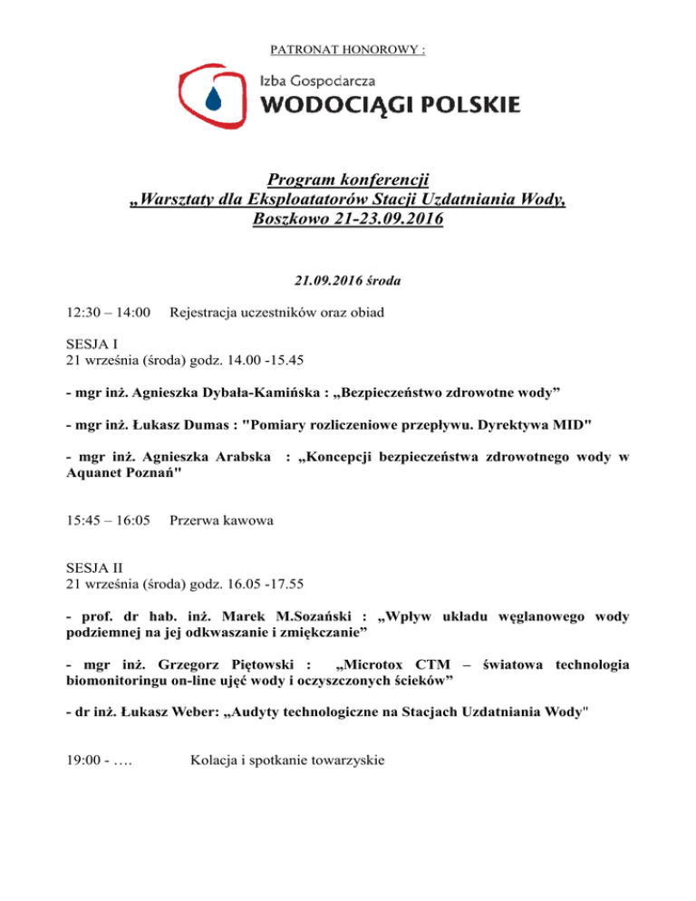 PATRONAT HONOROWY : Program konferencji „Warsztaty dla Eksploatatorów Stacji Uzdatniania Wody, Boszkowo 21-23.09.2016 21.09.2016 środa 12:30 – 14:00 Rejestracja uczestników oraz obiad SESJA I 14.0 -15.45 21 września (środa)) godz. 14.00 - mgr inż. Agnieszka Dybała--Kamińska : „Bezpieczeństwo stwo zdrowotne wody wody” - mgr inż. Łukasz Dumas : "Pomiary rozliczeniowe przepływu. Dyrektywa MID" - mgr inż.. Agnieszka Arabska : „Koncepcji bezpieczeństwa stwa zdrowotnego wody w Aquanet Poznań" 15:45 – 16:05 Przerwa rzerwa kawowa SESJA II 21 września (środa)) godz. 16.05 -17.55 - prof. dr hab. inż. ż. Marek M.Soza M.Sozański ski : „Wpływ układu wę węglanowego wody podziemnej na jej odkwaszanie i zmiękczanie” zmi - mgr inż.. Grzegorz Piętowski : „Microtox CTM – światowa technologia biomonitoringu on-line ujęć ęć wody i oczyszczonych ścieków” - dr inż. Łukasz Weber: „Audyty technologiczne na Stacjach Uzdatniania Wody" Wody 19:00 - …. Kolacja i spotkanie towarzyskie 22.09.2016 czwartek SESJA III 22 września (czwartek) godz. 9.30 -11.10 - dr Tomasz Górka: „Wytyczne dotyczące odbioru technicznego nowych studni głębinowych w kontekście jakości ujmowanej wody” - mgr inż. Marek zróżnicowanych” Sarbinowski : „Projektowanie zestawów pompowych - mgr inż. Maciej Tomczak, mgr inż. Zbigniew Brzeziński : „Nowoczesne, wysoko specjalizowane usługi w zakresie kompleksowego wykonawstwa obiektów gospodarki wodno-ściekowej na przykładzie SUW Zaborowo” - mgr inż. Sylwia Weber: „Układy funkcjonalne oraz rozwiązania architektoniczne w budowie SUW" 11:10 – 11:30 Przerwa na kawę SESJA IV 22 września (czwartek) godz. 11.30 -13.00 - mgr inż. Tomasz Biszof : „ Doświadczenia z eksploatacji ujęć wód podziemnych i stacji uzdatniania wody w MWiK sp. z o.o. w Chodzieży" - mgr inż. Piotr Żuk, mgr inż. Maciej Cichy : „Nowości w projektowaniu dna otwartych filtrów pospiesznych” - mgr inż. Łukasz Lenkiewicz : „Technika napędowa jako jedno z narzędzi do realizacji celów Unii Europejskiej w zakresie promowania rozwiązań przyjaznych środowisku.” - mgr inż. Iwona Lacocka-Gomuła : „Porównanie technologii na podstawie badań pilotowych prowadzonych na SUW Wiśniowa (nanofiltracja, ozon i filtry węglowe) 13:00 – 15:00 Przerwa obiadowa SESJA V 22 września (czwartek) godz. 15.00 -16.30 - mgr inż. Sławomir Monarcha, dr inż. Łukasz Weber, mgr inż. Karol Szambelańczyk : „Analiza procesu napowietrzania wody i desorpcji dwutlenku węgla, na wybranym przykładzie". - Mgr inż. Wojciech Kucner : „Kiedy zbiornik przecieka – teoretyczne i praktyczne aspekty stosowania techniki iniekcyjnej” - mgr inż. Iwona Lacocka-Gomuła : „Równowaga węglanowo-wapniowa na przykładzie doświadczeń z SUW Gruszczyn. Dalsze rezultaty z prowadzonych badań w skali pilotowej.” 16:30 – 16:50 Przerwa na kawę SESJA VI 22 września (czwartek) godz. 16.50 -17.50 - dr inż. Łukasz Weber: „Techniki membranowe w uzdatnianiu wody do celów komunalnych - krok po kroku. Ultrafiltracja." 19:00 - … Kolacja koleżeńska 23.09.2016 Piątek 07:00 – 08:30 Śniadanie 08:30 – 13:00 wyjazd autokarami - wycieczka na SUW Zaborowo. Wyjazd godz. 8.30. Deklarację chęci wyjazdu na wycieczkę proszę złożyć w sekretariacie warsztatów w dniu 21.09.2016r Tradycyjnie w ostatni dzień warsztatów przewidziana jest wycieczka technologiczna. Tym razem odwiedzimy MPWIK Leszno, w trakcie której będzie zwiedzana Stacja Uzdatniania Wody w Zaborowie. Ten zmodernizowany w 2013 roku obiekt jest bardzo ciekawy z kilku względów: po pierwsze z uwagi na adaptację i rewitalizację starej SUW - jej odtworzenie architektoniczne i zabudowanie w istniejącym budynku nowej technologii uzdatniania wody opartej o napowietrzanie otwarte, filtrację dwustopniową, dezynfekcję podchlorynem i UV. Ponadto w trakcie prac budowlanych odkryte zostały ruiny starego odżelaziacza z początku XX wieku, które zostały przystosowane do zwiedzania (galeria rur oraz komora odżelaziacza). Projekt przewidywał również adaptację starej chlorowni na salkę konferencyjną, która jest szeroko wykorzystywana m.in. do celów edukacyjnych dzieci i młodzieży w zakresie ochrony środowiska Ok. godz. 13:00 powrót oraz obiad Uwaga: Organizatorzy zastrzegają prawo do ewentualnych zmian poniższego planu. LISTA WYSTAWEK FIRM NA KONFERENCJI „WARSZTATY DLA EKSPLOATATORÓW SUW”, BOSZKOWO 21-23.09.2016 MIEJSCOWOŚĆ STARGARD SZCZECIŃSKI FIRMA ASTOR-INFEL GDAŃSK EATON ELECTRIC WROCŁAW Endress + Hauser LESZNO Leszczyńska Fabryka Pomp POZNAŃ PROTE Technologie dla Środowiska JAROCIN PTHU Hydro-Marko Maria Pluta WARSZAWA TIGRET Sp. z o.o. JÓZEFOSŁAW Wydawnictwo SeidelPrzywecki Sp. z o.o.