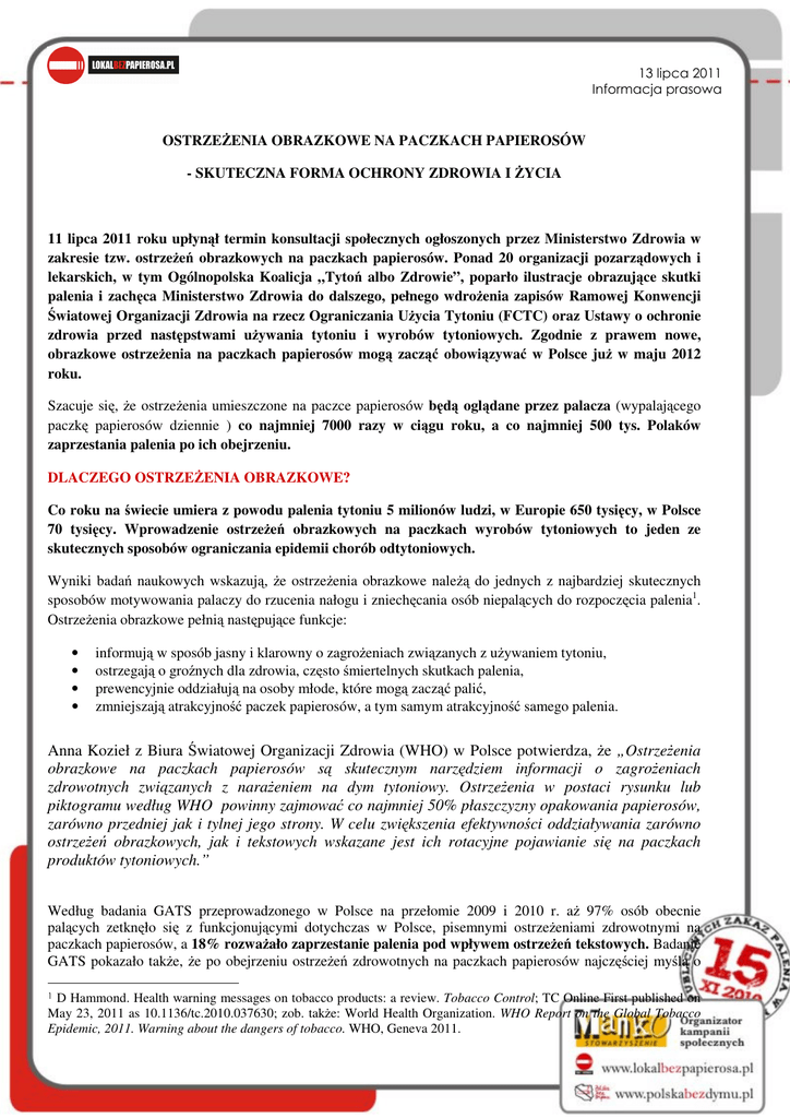 13 lipca 2011 Informacja prasowa OSTRZEŻENIA OBRAZKOWE NA PACZKACH PAPIEROSÓW - SKUTECZNA FORMA OCHRONY ZDROWIA I ŻYCIA 11 lipca 2011 roku upłynął termin konsultacji społecznych ogłoszonych przez Ministerstwo Zdrowia w zakresie tzw. ostrzeżeń obrazkowych na paczkach papierosów. Ponad 20 organizacji pozarządowych i lekarskich, w tym Ogólnopolska Koalicja „Tytoń albo Zdrowie”, poparło ilustracje obrazujące skutki palenia i zachęca Ministerstwo Zdrowia do dalszego, pełnego wdrożenia zapisów Ramowej Konwencji Światowej Organizacji Zdrowia na rzecz Ograniczania Użycia Tytoniu (FCTC) oraz Ustawy o ochronie zdrowia przed następstwami używania tytoniu i wyrobów tytoniowych. Zgodnie z prawem nowe, obrazkowe ostrzeżenia na paczkach papierosów mogą zacząć obowiązywać w Polsce już w maju 2012 roku. Szacuje się, że ostrzeżenia umieszczone na paczce papierosów będą oglądane przez palacza (wypalającego paczkę papierosów dziennie ) co najmniej 7000 razy w ciągu roku, a co najmniej 500 tys. Polaków zaprzestania palenia po ich obejrzeniu. DLACZEGO OSTRZEŻENIA OBRAZKOWE? Co roku na świecie umiera z powodu palenia tytoniu 5 milionów ludzi, w Europie 650 tysięcy, w Polsce 70 tysięcy. Wprowadzenie ostrzeżeń obrazkowych na paczkach wyrobów tytoniowych to jeden ze skutecznych sposobów ograniczania epidemii chorób odtytoniowych. Wyniki badań naukowych wskazują, że ostrzeżenia obrazkowe należą do jednych z najbardziej skutecznych sposobów motywowania palaczy do rzucenia nałogu i zniechęcania osób niepalących do rozpoczęcia palenia1. Ostrzeżenia obrazkowe pełnią następujące funkcje: • • • • informują w sposób jasny i klarowny o zagrożeniach związanych z używaniem tytoniu, ostrzegają o groźnych dla zdrowia, często śmiertelnych skutkach palenia, prewencyjnie oddziałują na osoby młode, które mogą zacząć palić, zmniejszają atrakcyjność paczek papierosów, a tym samym atrakcyjność samego palenia. Anna Kozieł z Biura Światowej Organizacji Zdrowia (WHO) w Polsce potwierdza, że „Ostrzeżenia obrazkowe na paczkach papierosów są skutecznym narzędziem informacji o zagrożeniach zdrowotnych związanych z narażeniem na dym tytoniowy. Ostrzeżenia w postaci rysunku lub piktogramu według WHO powinny zajmować co najmniej 50% płaszczyzny opakowania papierosów, zarówno przedniej jak i tylnej jego strony. W celu zwiększenia efektywności oddziaływania zarówno ostrzeżeń obrazkowych, jak i tekstowych wskazane jest ich rotacyjne pojawianie się na paczkach produktów tytoniowych.” Według badania GATS przeprowadzonego w Polsce na przełomie 2009 i 2010 r. aż 97% osób obecnie palących zetknęło się z funkcjonującymi dotychczas w Polsce, pisemnymi ostrzeżeniami zdrowotnymi na paczkach papierosów, a 18% rozważało zaprzestanie palenia pod wpływem ostrzeżeń tekstowych. Badanie GATS pokazało także, że po obejrzeniu ostrzeżeń zdrowotnych na paczkach papierosów najczęściej myślą o 1 D Hammond. Health warning messages on tobacco products: a review. Tobacco Control; TC Online First published on May 23, 2011 as 10.1136/tc.2010.037630; zob. także: World Health Organization. WHO Report on the Global Tobacco Epidemic, 2011. Warning about the dangers of tobacco. WHO, Geneva 2011. zaprzestaniu palenia osoby mniej wykształcone czyli te, które w Polsce najczęściej palą tytoń. Odsetek osób rozważających zaprzestanie palenia pod wpływem ww. ostrzeżeń jest 2-krotnie większy wśród palących z wykształceniem podstawowym (24%) niż wyższym (12%). Wyniki badania GATS przeprowadzonego w krajach, w których funkcjonują ostrzeżenia obrazkowe na paczkach papierosów wskazują, że odsetek palaczy chcących rzucić palenie po obejrzeniu ilustracji zdrowotnych następstw palenia jest znacznie wyższy niż w Polsce, gdzie obowiązują ciągle ostrzeżenia tekstowe. Np.: w Brazylii jest to aż 65% palących. W Australii po wprowadzeniu ostrzeżeń obrazkowych liczba osób dzwoniących na infolinię po poradę jak zaprzestać palenia na przestrzeni dwóch lat uległa podwojeniu!2 Ostrzeżenia obrazkowe zmniejszają wpływ marketingu tytoniowego zarówno na decyzje osób obecnie palących, jak i potencjalnych palaczy, zwłaszcza dzieci i młodzieży. Według WHO ostrzeżenia graficzne zmniejszają liczbę sięgających po papierosa młodych ludzi, a także wzmacniają decyzje palaczy dotyczące rzucenia nałogu lub do rzadszego palenia w domu i przy dzieciach, by nie narażać otoczenia na skutki biernego palenia.3 W Kanadzie, która jako jeden z pierwszych krajów wprowadziła oznaczenia obrazkowe, 84% palących postrzega je jako skuteczną informację zdrowotną, a ponad 90% osób młodych uznało, że ostrzeżenia graficzne dostarczyły im istotnych informacji na temat skutków zdrowotnych palenia, były celne i zmniejszyły atrakcyjność palenia. Psycholog społeczny prof. dr hab. Zbigniew Nęcki podkreśla, że „Wizualne formy działania (obraz) są wielokrotnie silniejsze w oddziaływaniu niż formy słowne. Aktywizują silniejsze emocje i są zdecydowanie jednoznaczne. W apelach tworzonych słowem zawsze jest niedopowiedzenie, a w apelach obrazkowych jest całkowita jednoznaczność przekazu. Obrazy są też znacznie bardziej interesujące, przyciągają uwagę - słowa są atrakcją znacznie mniejszą a więc mają znacznie mniejsze szanse na przeczytanie. Obraz ogląda się chętnie.” Ocenę psychologa potwierdza również Magdalena Petryniak, koordynator antytytoniowych kampanii społecznych Lokal bez Papierosa.pl i Polska bez dymu. „Warto pamiętać, że ostrzeżenia obrazkowe to doskonała reklama społeczna, w tym przypadku o charakterze zdrowotnym. Wykorzystując nośnik opakowania i komunikaty zdrowotne, stale i bezpłatnie oddziałują na konsumentów. Najlepsze reklamy to te oparte na sugestywnych obrazach, wzbudzające emocje, zachęcające do myślenia i zatrzymania uwagi. Obra