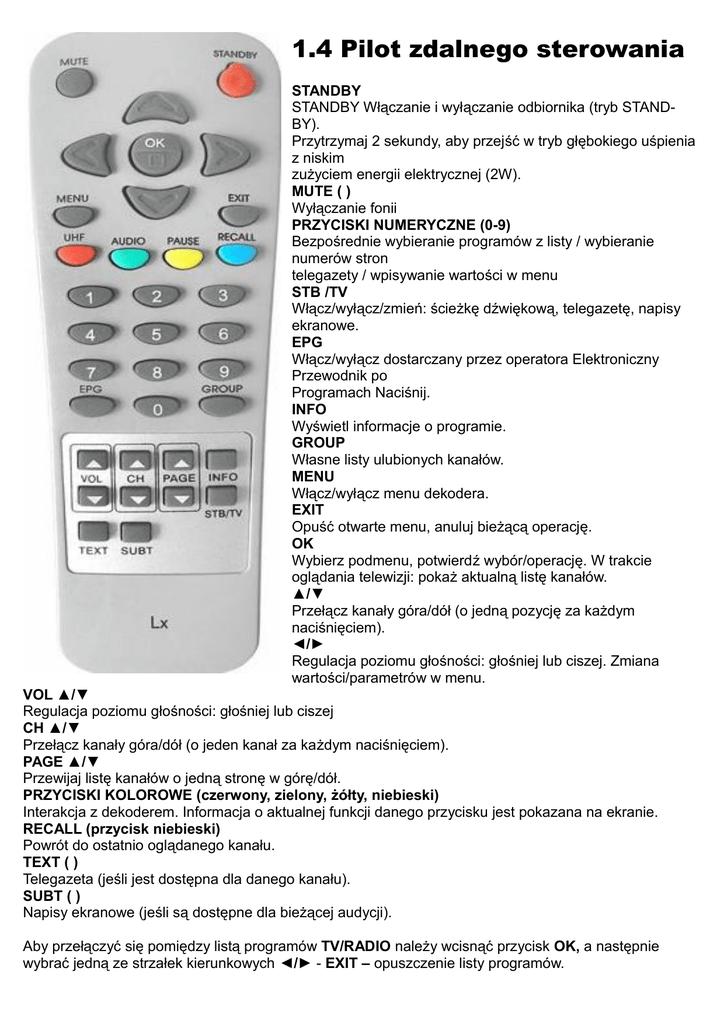 1.4 Pilot zdalnego sterowania STANDBY STANDBY Włączanie i wyłączanie odbiornika (tryb STANDBY). Przytrzymaj 2 sekundy, aby przejść w tryb głębokiego uśpienia z niskim zużyciem energii elektrycznej (2W). MUTE ( ) Wyłączanie fonii PRZYCISKI NUMERYCZNE (0-9) Bezpośrednie wybieranie programów z listy / wybieranie numerów stron telegazety / wpisywanie wartości w menu STB /TV Włącz/wyłącz/zmień: ścieżkę dźwiękową, telegazetę, napisy ekranowe. EPG Włącz/wyłącz dostarczany przez operatora Elektroniczny Przewodnik po Programach Naciśnij. INFO Wyświetl informacje o programie. GROUP Własne listy ulubionych kanałów. MENU Włącz/wyłącz menu dekodera. EXIT Opuść otwarte menu, anuluj bieżącą operację. OK Wybierz podmenu, potwierdź wybór/operację. W trakcie oglądania telewizji: pokaż aktualną listę kanałów. ▲/▼ Przełącz kanały góra/dół (o jedną pozycję za każdym naciśnięciem). ◄/► Regulacja poziomu głośności: głośniej lub ciszej. Zmiana wartości/parametrów w menu. VOL ▲/▼ Regulacja poziomu głośności: głośniej lub ciszej CH ▲/▼ Przełącz kanały góra/dół (o jeden kanał za każdym naciśnięciem). PAGE ▲/▼ Przewijaj listę kanałów o jedną stronę w górę/dół. PRZYCISKI KOLOROWE (czerwony, zielony, żółty, niebieski) Interakcja z dekoderem. Informacja o aktualnej funkcji danego przycisku jest pokazana na ekranie. RECALL (przycisk niebieski) Powrót do ostatnio oglądanego kanału. TEXT ( ) Telegazeta (jeśli jest dostępna dla danego kanału). SUBT ( ) Napisy ekranowe (jeśli są dostępne dla bieżącej audycji). Aby przełączyć się pomiędzy listą programów TV/RADIO należy wcisnąć przycisk OK, a następnie wybrać jedną ze strzałek kierunkowych ◄/► - EXIT – opuszczenie listy programów.