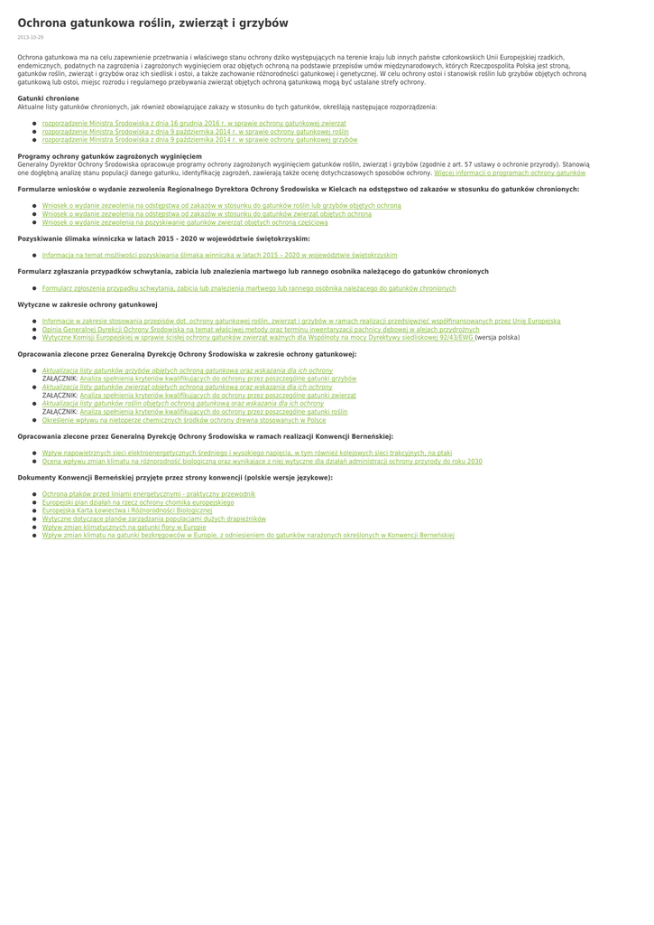 Ochrona gatunkowa roślin, zwierząt i grzybów 2013-10-29 Ochrona gatunkowa ma na celu zapewnienie przetrwania i właściwego stanu ochrony dziko występujących na terenie kraju lub innych państw członkowskich Unii Europejskiej rzadkich, endemicznych, podatnych na zagrożenia i zagrożonych wyginięciem oraz objętych ochroną na podstawie przepisów umów międzynarodowych, których Rzeczpospolita Polska jest stroną, gatunków roślin, zwierząt i grzybów oraz ich siedlisk i ostoi, a także zachowanie różnorodności gatunkowej i genetycznej. W celu ochrony ostoi i stanowisk roślin lub grzybów objętych ochroną gatunkową lub ostoi, miejsc rozrodu i regularnego przebywania zwierząt objętych ochroną gatunkową mogą być ustalane strefy ochrony. Gatunki chronione Aktualne listy gatunków chronionych, jak również obowiązujące zakazy w stosunku do tych gatunków, określają następujące rozporządzenia: rozporządzenie Ministra Środowiska z dnia 16 grudnia 2016 r. w sprawie ochrony gatunkowej zwierząt rozporządzenie Ministra Środowiska z dnia 9 października 2014 r. w sprawie ochrony gatunkowej roślin rozporządzenie Ministra Środowiska z dnia 9 października 2014 r. w sprawie ochrony gatunkowej grzybów Programy ochrony gatunków zagrożonych wyginięciem Generalny Dyrektor Ochrony Środowiska opracowuje programy ochrony zagrożonych wyginięciem gatunków roślin, zwierząt i grzybów (zgodnie z art. 57 ustawy o ochronie przyrody). Stanowią one dogłębną analizę stanu populacji danego gatunku, identyfikację zagrożeń, zawierają także ocenę dotychczasowych sposobów ochrony. Więcej informacji o programach ochrony gatunków Formularze wniosków o wydanie zezwolenia Regionalnego Dyrektora Ochrony Środowiska w Kielcach na odstępstwo od zakazów w stosunku do gatunków chronionych: Wniosek o wydanie zezwolenia na odstępstwa od zakazów w stosunku do gatunków roślin lub grzybów objętych ochroną Wniosek o wydanie zezwolenia na odstępstwa od zakazów w stosunku do gatunków zwierząt objętych ochroną Wniosek o wydanie zezwolenia na pozyskiwanie gatunków zwierząt objętych ochroną częściową Pozyskiwanie ślimaka winniczka w latach 2015 - 2020 w województwie świętokrzyskim: Informacja na temat możliwości pozyskiwania ślimaka winniczka w latach 2015 – 2020 w województwie świętokrzyskim Formularz zgłaszania przypadków schwytania, zabicia lub znalezienia martwego lub rannego osobnika należącego do gatunków chronionych Formularz zgłoszenia przypadku schwytania, zabicia lub znalezienia martwego lub rannego osobnika należącego do gatunków chronionych Wytyczne w zakresie ochrony gatunkowej Informacje w zakresie stosowania przepisów dot. ochrony gatunkowej roślin, zwierząt i grzybów w ramach realizacji przedsięwzięć współfinansowanych przez Unię Europejską Opinia Generalnej Dyrekcji Ochrony Środowiska na temat właściwej metody oraz terminu inwentaryzacji pachnicy dębowej w alejach przydrożnych Wytyczne Komisji Europejskiej w sprawie ścisłej ochrony gatunków zwierząt ważnych dla Wspólnoty na mocy Dyrektywy siedliskowej 92/43/EWG (wersja polska) Opracowania zlecone przez Generalną Dyrekcję Ochrony Środowiska w zakresie ochrony gatunkowej: Aktualizacja listy gatunków grzybów objętych ochroną gatunkową oraz wskazania dla ich ochrony ZAŁĄCZNIK: Analiza spełnienia kryteriów kwalifikujących do ochrony przez poszczególne gatunki grzybów Aktualizacja listy gatunków zwierząt objętych ochroną gatunkową oraz wskazania dla ich ochrony ZAŁĄCZNIK: Analiza spełnienia kryteriów kwalifikujących do ochrony przez poszczególne gatunki zwierząt Aktualizacja listy gatunków roślin objętych ochroną gatunkową oraz wskazania dla ich ochrony ZAŁĄCZNIK: Analiza spełnienia kryteriów kwalifikujących do ochrony przez poszczególne gatunki roślin Określenie wpływu na nietoperze chemicznych środków ochrony drewna stosowanych w Polsce Opracowania zlecone przez Generalną Dyrekcję Ochrony Środowiska w ramach realizacji Konwencji Berneńskiej: Wpływ napowietrznych sieci elektroenergetycznych średniego i wysokiego napięcia, w tym również kolejowych sieci trakcyjnych, na ptaki Ocena wpływu zmian klimatu na różnorodność biologiczną oraz wynikające z niej wytyczne dla działań administracji ochrony przyrody do roku 2030 Dokumenty Konwencji Berneńskiej przyjęte przez strony konwencji (polskie wersje językowe): Ochrona ptaków przed liniami energetycznymi - praktyczny przewodnik Europejski plan działań na rzecz ochrony chomika europejskiego Europejska Karta Łowiectwa i Różnorodności Biologicznej Wytyczne dotyczące planów zarządzania populacjami dużych drapieżników Wpływ zmian klimatycznych na gatunki flory w Europie Wpływ zmian klimatu na gatunki bezkręgowców w Europie, z odniesieniem do gatunków narażonych określonych w Konwencji Berneńskiej