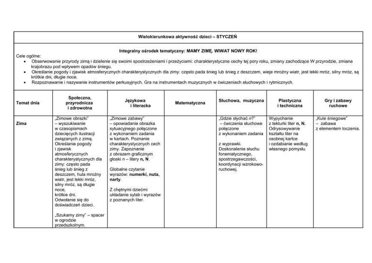 Wielokierunkowa aktywność dzieci – STYCZEŃ Integralny ośrodek tematyczny: MAMY ZIMĘ. WIWAT NOWY ROK! Cele ogólne: Obserwowanie przyrody zimą i dzielenie się swoimi spostrzeżeniami i przeżyciami: charakterystyczne cechy tej pory roku, zmiany zachodzące W przyrodzie, zmiana krajobrazu pod wpływem opadów śniegu. Określanie pogody i zjawisk atmosferycznych charakterystycznych dla zimy: często pada śnieg lub śnieg z deszczem, wieje mroźny wiatr, jest lekki mróz, silny mróz, są krótkie dni, długie noce. Rozpoznawanie i nazywanie instrumentów perkusyjnych. Gra na instrumentach muzycznych w ćwiczeniach słuchowych i rytmicznych. Temat dnia Zima Społeczna, przyrodnicza i zdrowotna „Zimowe obrazki” – wyszukiwanie w czasopismach dziecięcych ilustracji związanych z zimą. Określanie pogody i zjawisk atmosferycznych charakterystycznych dla zimy: często pada śnieg lub śnieg z deszczem, hula mroźny wiatr, jest lekki mróz, silny mróz, są długie noce, krótkie dni. Odwołanie się do doświadczeń dzieci. „Szukamy zimy” – spacer w ogrodzie przedszkolnym. Językowa i literacka „Zimowe zabawy” – opowiadanie obrazka sytuacyjnego połączone z wykonaniem zadania w kartach. Poznanie charakterystycznych cech zimy. Zapoznanie z obrazem graficznym głoski n – litery n, N. Globalne czytanie wyrazów: numerki, nuta, narty. Z chętnymi dziećmi układanie sylab i wyrazów z poznanych liter. Matematyczna Słuchowa, muzyczna „Gdzie słychać n?” – ćwiczenia słuchowe połączone z wykonaniem zadania z wyprawki. Doskonalenie słuchu fonematycznego, spostrzegawczości, koordynacji wzrokoworuchowej. Plastyczna i techniczna Wypychanie z tekturki liter n, N. Odrysowywanie kształtu liter na osobnej kartce i ozdabianie według własnego pomysłu. Gry i zabawy ruchowe „Kule śniegowe” – zabawa z elementem toczenia. Obserwowanie otoczenia, zwracanie uwagi na zjawiska zachodzące w przyrodzie. Podstawa programowa K3 s. 2, 3 W3 s. 1 W3 s. 3 Ad 3Wspomaganie Ad 3Wspomaganie rozwoju mowy oraz innych umiejętności komunikacyjnych dzieci rozwoju mowy oraz innych umiejętności komunikacyjnych dzieci Ad 14Kształtowanie Ad 14Kształtowanie Ad 5Wychowanie Ad 11Pomaganie Ad 14Kształtowanie gotowości do nauki czytania i pisania gotowości do nauki czytania i pisania dzieciom w rozumieniu istoty zjawisk atmosferycznych i w unikaniu zagrożeń, Ad 14Kształtowanie gotowości do nauki czytania i pisania, gotowości do nauki czytania i pisania, zdrowotne i kształtowanie sprawności fizycznej dzieci W krainie śniegu i lodu „Zima” – zabawa dydaktyczna. Utrwalanie wiadomości dotyczących zimy. Wdrażanie do spokojnego oczekiwania na swoją kolej. Słuchanie wiersza Tomasza Jabłońskiego Eskimos. Wskazanie na globusie Antarktydy i Arktyki. Poznanie podstawowych cech klimatu polarnego. Poznanie sposobu życia Eskimosów. W ogrodzie zapoznanie ze sposobem odśnieżania: zamiatanie miotłą i zgarnianie śniegu specjalną łopatą. Próby samodzielnego odśnieżania. „Zwierzęta polarne” – praca z obrazkiem połączona z wykonaniem zadania w kartach. Poznanie zwierząt żyjących w klimacie polarnym. Kolorowanie zwierząt żyjących w krajach polarnych. Nalepianie nazw zwierząt według wzoru pod dużymi postaciami zwierząt. Liczenie zwierząt i określanie, ile ich jest. „Pingwinek” – zabawa ze śpiewem. „Eskimos” – wydzieranka z kolorowego papieru. Poznanie wyglądu Eskimosa. Doskonalenie sprawności manualnych. „Wyprawa do krainy polarnej” – zabawa ruchowa. Ad 8Wychowanie Ad 9, Ad 14Kształtowanie Ad 5Wychowanie Globalne czytanie wyrazów: pingwin, mors, lis polarny, foka, Eskimos. K3 s. 1 Podstawa programowa Ad 3Wspomaganie rozwoju mowy oraz innych umiejętności komunikacyjnych dzieci , Ad 11Pomaganie dzieciom w rozumieniu istoty zjawisk atmosferycznych i Ad 3 Wspomaganie rozwoju mowy oraz innych umiejętności komunikacyjnych dzieci, Ad 12Wychowanie dla poszanowania roślin i zwierząt, Ad 14Kształtowanie gotowości do nauki przez sztukę – muzyka: różne formy aktywności muzycznoruchowej gotowości do nauki czytania i pisania, zdrowotne i kształtowanie sprawności fizycznej dzieci, Nowy Rok w unikaniu zagrożeń, czytania i pisania, Nowy Rok– słuchanie wiersza Doroty Gellner. Posługiwanie się nazwami pór roku. Określanie charakterystycznych dla nich zjawisk atmosferycznych. „Cztery pory roku” – praca z obrazkiem. Opowiadanie treści obrazka. Budowanie wypowiedzi wielozdaniowej. Czytanie podpisu do obrazka 4 pory roku. Wprowadzenie korzystania z miotełek do czyszczenia ubrań i butów ze śniegu. Wdrażanie do dbania o porządek w przedszkolu. Globalne czytanie wyrazów: mors, foka, pingwin, renifer, Eskimos. „Pory roku” – zabawa dydaktyczna. Określanie symboli pór roku: wiosna – kwiat, lato – słońce, jesień – liść jesienny, zima – płatek śniegu. Ustalenie stałego następstwa pór roku. Wdrażanie do przestrzegania reguł zabawy. „Obrazek i wyraz” – zabawa dydaktyczna. Doskonalenie analizy i syntezy słuchowej wyrazów. Wykonanie zadania – wyprawka. Wyszukiwanie na obrazkach 6 różnic i zaznaczanie ich czerwoną kropką na dolnym obrazku. Ozdabianie ramek flamastrami. „Pory roku” – zabawa orientacyjnoporządkowa. „Pory roku” – malowanie farbami plakatowymi na dużych arkuszach szarego papieru (praca w zespołach). Odzwierciedlanie w formie plastycznej własnych spostrzeżeń. Zgodna współpraca w zespole. W3 s. 2 Podstawa programowa Ad 2Kształtowanie Ad 11Pomaganie Ad 13Wspomaganie Ad 14Kształtowanie Ad 14Kształtowanie Ad 5Wychowanie czynności samoobsługowych, nawyków higienicznych i kulturalnych. Wdrażanie dzieci do utrzymywania ładu i porządku, dzieciom w rozumieniu istoty zjawisk atmosferycznych i w unikaniu zagrożeń, rozwoju intelektualnego dzieci wraz z edukacją matematyczną, Ad 14Kształtowanie gotowości do nauki czytania i pisania, gotowości do 