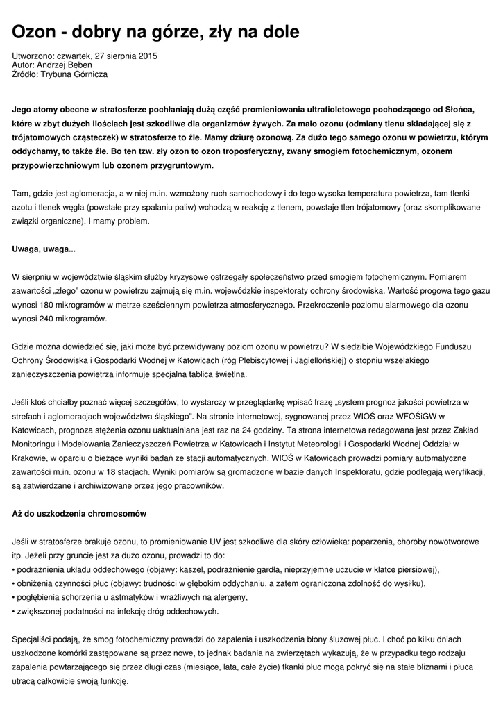 Ozon - dobry na górze, zły na dole Utworzono: czwartek, 27 sierpnia 2015 Autor: Andrzej Bęben Źródło: Trybuna Górnicza Jego atomy obecne w stratosferze pochłaniają dużą część promieniowania ultrafioletowego pochodzącego od Słońca, które w zbyt dużych ilościach jest szkodliwe dla organizmów żywych. Za mało ozonu (odmiany tlenu składającej się z trójatomowych cząsteczek) w stratosferze to źle. Mamy dziurę ozonową. Za dużo tego samego ozonu w powietrzu, którym oddychamy, to także źle. Bo ten tzw. zły ozon to ozon troposferyczny, zwany smogiem fotochemicznym, ozonem przypowierzchniowym lub ozonem przygruntowym. Tam, gdzie jest aglomeracja, a w niej m.in. wzmożony ruch samochodowy i do tego wysoka temperatura powietrza, tam tlenki azotu i tlenek węgla (powstałe przy spalaniu paliw) wchodzą w reakcję z tlenem, powstaje tlen trójatomowy (oraz skomplikowane związki organiczne). I mamy problem. Uwaga, uwaga... W sierpniu w województwie śląskim służby kryzysowe ostrzegały społeczeństwo przed smogiem fotochemicznym. Pomiarem zawartości „złego” ozonu w powietrzu zajmują się m.in. wojewódzkie inspektoraty ochrony środowiska. Wartość progowa tego gazu wynosi 180 mikrogramów w metrze sześciennym powietrza atmosferycznego. Przekroczenie poziomu alarmowego dla ozonu wynosi 240 mikrogramów. Gdzie można dowiedzieć się, jaki może być przewidywany poziom ozonu w powietrzu? W siedzibie Wojewódzkiego Funduszu Ochrony Środowiska i Gospodarki Wodnej w Katowicach (róg Plebiscytowej i Jagiellońskiej) o stopniu wszelakiego zanieczyszczenia powietrza informuje specjalna tablica świetlna. Jeśli ktoś chciałby poznać więcej szczegółów, to wystarczy w przeglądarkę wpisać frazę „system prognoz jakości powietrza w strefach i aglomeracjach województwa śląskiego”. Na stronie internetowej, sygnowanej przez WIOŚ oraz WFOŚiGW w Katowicach, prognoza stężenia ozonu uaktualniana jest raz na 24 godziny. Ta strona internetowa redagowana jest przez Zakład Monitoringu i Modelowania Zanieczyszczeń Powietrza w Katowicach i Instytut Meteorologii i Gospodarki Wodnej Oddział w Krakowie, w oparciu o bieżące wyniki badań ze stacji automatycznych. WIOŚ w Katowicach prowadzi pomiary automatyczne zawartości m.in. ozonu w 18 stacjach. Wyniki pomiarów są gromadzone w bazie danych Inspektoratu, gdzie podlegają weryfikacji, są zatwierdzane i archiwizowane przez jego pracowników. Aż do uszkodzenia chromosomów Jeśli w stratosferze brakuje ozonu, to promieniowanie UV jest szkodliwe dla skóry człowieka: poparzenia, choroby nowotworowe itp. Jeżeli przy gruncie jest za dużo ozonu, prowadzi to do: • podrażnienia układu oddechowego (objawy: kaszel, podrażnienie gardła, nieprzyjemne uczucie w klatce piersiowej), • obniżenia czynności płuc (objawy: trudności w głębokim oddychaniu, a zatem ograniczona zdolność do wysiłku), • pogłębienia schorzenia u astmatyków i wrażliwych na alergeny, • zwiększonej podatności na infekcję dróg oddechowych. Specjaliści podają, że smog fotochemiczny prowadzi do zapalenia i uszkodzenia błony śluzowej płuc. I choć po kilku dniach uszkodzone komórki zastępowane są przez nowe, to jednak badania na zwierzętach wykazują, że w przypadku tego rodzaju zapalenia powtarzającego się przez długi czas (miesiące, lata, całe życie) tkanki płuc mogą pokryć się na stałe bliznami i płuca utracą całkowicie swoją funkcję. Jaka zawartość ozonu w atmosferze powoduje określone dysfunkcje organizmu? W stężeniu 40 mikrogramach w metrze sześciennym powietrza zapach ozonu jest już wyczuwalny. Przy 100 mikrogramach można odczuwać ból głowy i podrażnienie oczu. 110 prowadzi do podrażnienia dróg oddechowych i obniżenia wydajności (ośrodki badawcze w USA oszacowały, że takie stężenie ozonu może doprowadzić do pięcioprocentowego spadku wydajności w pracy). 160 skutkować może zapaleniem dróg oddechowych. Przy 180 trzeba informować społeczeństwo o ryzyku wystąpienia przekroczeń poziomów. Przy 200 pojawiają się problemy z oddychaniem. 240 mikrogramów w metrze sześciennym powietrza atmosferycznego to już poziom alarmowy. Przy 260 jest możliwość wystąpienia ataków astmy. Powyżej 400 dochodzi do obniżonej wydolności oraz trwałego zniszczenia komórek. Powyżej 1000 ozonu oznacza uszkodzenie chromosomów. Nie należy zapominać, że ozon przygruntowy nie jest jedynym składnikiem zanieczyszczenia powietrza, powstałego wskutek m.in. skoncentrowanego ruchu samochodowego. Smog tworzą także pyły zawieszone, tlenki węgla, tlenki azotu, tlenki siarki itd. Na pocieszenie zostaje to, iż smog fotochemiczny pojawia się tylko upalnym latem. Zimą będziemy mierzyć się ze zwykłym smogiem. Chyba że zima będzie mroźna, bo zwykły smog mrozu nie lubi.
