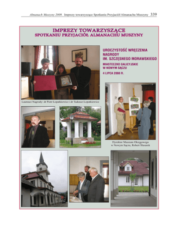 Almanach Muszyny 2009. Imprezy towarzyszące Spotkaniu Przyjaciół Almanachu Muszyny 339 IMPREZY TOWARZYSZĄCE SPOTKANIU PRZYJACIÓŁ ALMANACHU MUSZYNY UROCZYSTOŚĆ WRĘCZENIA NAGRODY IM. SZCZĘSNEGO MORAWSKIEGO MIASTECZKO GALICYJSKIE W NOWYM SĄCZU 4 LIPCA 2008 R. Laureaci Nagrody: dr Piotr Łopatkiewicz i dr Tadeusz Łopatkiewicz Dyrektor Muzeum Okręgowego w Nowym Sączu, Robert Ślusarek 340 Imprezy towarzyszące Spotkaniu Przyjaciół Almanachu Muszyny WERNISAŻ WYSTAWY „KRYNICA, MUSZYNA, ŻEGIESTÓW NA DAWNEJ POCZTÓWCE“ BIBLIOTEKA IM J. SZUJSKIEGO W NOWYM SĄCZU 3 LIPCA 2008 R. WERNISAŻ POKONKURSOWEJ WYSTAWY FOTOGRAFICZNEJ „DETAL ARCHITEKTONICZNY STAREJ LUBOWLI“ GALERIA W PIJALNI ZDROJU GŁÓWNEGO W KRYNICY 5 LIPCA 2008 R. Fot. J. Jarończyk, B. Kruk Almanach Muszyny 2009. Imprezy towarzyszące Spotkaniu Przyjaciół Almanachu Muszyny 341 „POETYCKI KONCERT NA CZTERY RĘCE“ SPOTKANIE Z ADAMEM ZIEMIANINEM I PAWŁEM SZELIGĄ BIBLIOTEKA PUBLICZNA W MUSZYNIE 5 LIPCA 2008 R. WERNISAŻ WYSTAWY „MÓJ PIERWSZY DOJRZAŁY OBRAZ“ MUZEUM PAŃSTWA MUSZYŃSKIEGO 5 LIPCA 2008 R. Fot. B. Kruk, T. Łopatkiewicz, S. Murzyn