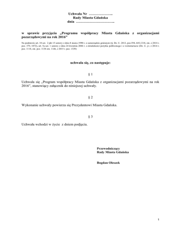 Uchwała Nr ……………….. Rady Miasta Gdańska dnia ………………………….. w sprawie przyjęcia „Programu współpracy Miasta Gdańska z organizacjami pozarządowymi na rok 2016” Na podstawie art. 18 ust. 2 pkt 15 ustawy z dnia 8 marca 1990 r. o samorządzie gminnym (tj. Dz. U. 2013, poz.594, 645,1318, zm. z 2014 r. poz. 379, 1072), art. 5a ust. 1 ustawy z dnia 24 kwietnia 2004 r. o działalności pożytku publicznego i o wolontariacie (Dz. U. j.t. z 2014 r. poz. 1118, zm. poz. 1138 zm. 1146, z 2015 r. poz. 1339) uchwala się, co następuje: §1 Uchwala się „Program współpracy Miasta Gdańska z organizacjami pozarządowymi na rok 2016”, stanowiący załącznik do niniejszej uchwały. §2 Wykonanie uchwały powierza się Prezydentowi Miasta Gdańska. §3 Uchwała wchodzi w życie z dniem podjęcia. Przewodniczący Rady Miasta Gdańska Bogdan Oleszek 1 Załącznik do Uchwały RMG Nr …………………. z dnia …………………………….. PROGRAM WSPÓŁPRACY MIASTA GDAŃSKA Z ORGANIZACJAMI POZARZĄDOWYMI NA 2016 ROK Rozdział I Postanowienia ogólne §1 1. Ilekroć w niniejszym „Programie współpracy Miasta Gdańska z organizacjami pozarządowymi na rok 2016”, zwanym dalej „Programem”, jest mowa o: 1) Prezydencie - należy przez to rozumieć Prezydenta Miasta Gdańska; 2) ustawie - należy przez to rozumieć ustawę z dnia 24 kwietnia 2003 r. o działalności pożytku publicznego i o wolontariacie (Dz. U. t.j. z 2014 r. poz. 1118 ze zm.); 3) ustawie o rehabilitacji - należy przez to rozumieć ustawę z dnia 27 sierpnia 1997 r. o rehabilitacji zawodowej i społecznej oraz zatrudnieniu osób niepełnosprawnych (2011r. Nr 127, poz.721 z późn. zm.); 4) organizacjach - rozumie się przez to organizacje pozarządowe oraz podmioty, o których mowa w art. 3 ust. 3 ustawy; 5) Programie wieloletnim - należy przez to rozumieć aktualny Wieloletni Program Współpracy Miasta Gdańska z organizacjami pozarządowymi, 6) Gdańskiej Radzie Organizacji Pozarządowych - należy przez to rozumieć podmiot, który reprezentuje gdańskie organizacje i jest wyłoniony podczas ich plenarnego spotkania przy udziale przedstawiciela Prezydenta Miasta Gdańska; 7) konkursie ofert - należy przez to rozumieć otwarty konkurs ofert na realizację zadań publicznych, ogłaszany zgodnie z art.13 ustawy, w którym uczestniczą organizacje i inne podmioty; 8) wydziale lub jednostce - należy przez to rozumieć podstawową jednostkę organizacyjną w strukturze Urzędu lub jednostkę organizacyjną Miasta. 9) trybie pozakonkursowym – należy przez to rozumieć tryb zlecania zadań publicznych poza konkursem, określonym w art.19a ustawy. 10) PFRON - należy przez to rozumieć Państwowy Fundusz Rehabilitacji Osób Niepełnosprawnych. 11) projekcie – należy przez to rozumieć działania realizowane w oparciu o zawartą umowę w ramach zadania publicznego. W ramach jednego zadania publicznego może być realizowanych wiele projektów. Rozdział II Cele główne i szczegółowe współpracy §2 1. Celem głównym współpracy Miasta Gdańska z organizacjami na rok 2016 jest kreowanie aktywności obywatelskiej, współodpowiedzialności, samoorganizacji oraz włączenia społecznego poprzez rozwój lokalnej współpracy. 2 2. Cele szczegółowe programu to: 1) wzmocnienie zaangażowania lokalnych organizacji w procesy projektowania lokalnego rozwoju i podejmowania decyzji oraz wzmocnienie ich potencjału, 2) zwiększenie udziału organizacji w realizację polityk publicznych, 3) wsparcie rozwoju lokalnej współpracy, 4) rozwój potencjału wolontariackiego oraz aktywności prospołecznej, 5) kształtowanie prozdrowotnych postaw mieszkańców i propagowanie zdrowego stylu życia, 6) rozwój integracji w dzielnicach, 7) budowa kompleksowego systemu wsparcia mieszkańców. Rozdział III Zasady współpracy §3 Współpraca Miasta Gdańska z organizacjami odbywa się na zasadach: pomocniczości, suwerenności stron, partnerstwa, efektywności, uczciwej konkurencji oraz jawności. Rozdział IV Formy współpracy §4 1. Współpraca Miasta Gdańska z organizacjami odbywać się będzie głównie w formie: 1) finansowej: a) zlecania organizacjom realizacji zadań finansowanych ze środków publicznych w tym, ze środków PFRON, na zasadach określonych w ustawie oraz w trybach określonych w odrębnych przepisach prawa, b) udzielania dotacji na realizację projektów finansowanych z innych źródeł, c) udzielania pożyczek, gwarancji i zabezpieczeń, 2) pozafinansowej: a) wzajemnego informowania o planowanych kierunkach działalności, b) budowania partnerstw w celu realizacji wspólnych projektów i inicjatyw lokalnych, c) współdziałania w pozyskiwaniu środków finansowych z innych źródeł, w szczególności z funduszy Unii Europejskiej, d) udzielania pomocy w nawiązywaniu współpracy regionalnej, ponadregionalnej i międzynarodowej, e) udostępniania sal, pomieszczeń i sprzętu technicznego w celu realizacji zadań statutowych organizacji, f) udostępniania na preferencyjnych zasadach lokali i budynków komunalnych, g) popularyzacji działalności organizacji w mediach i na stronach internetowych Miasta www.gdansk.pl, www.um.gdansk.pl , h) społecznych konsultacji projektów aktów normatywnych i dokumentów o charakterze programowym i strategicznym na zasadach określonych w Programie Wieloletnim, i) działalności Gdańskiej Rady Działalności Pożytku Publicznego, innych rad społecznych o charakterze doradczo – opiniotwórczym oraz wspólnych zespołów o charakterze doradczym i inicjatywnym, j) promocji i wspierania rozwoju podmiotów ekonomii społecznej, 3 k) współpracy międzysektorowej w ramach realizacji celów szczegółowych programów operacyjnych Miasta Gdańska. 2. Szczegółowy tryb powoływania, organizacji oraz działania Gdańskiej Rady Działalności Pożytku Publicznego oraz sposób tworzenia programu i przebiegu konsultacji określa Progra