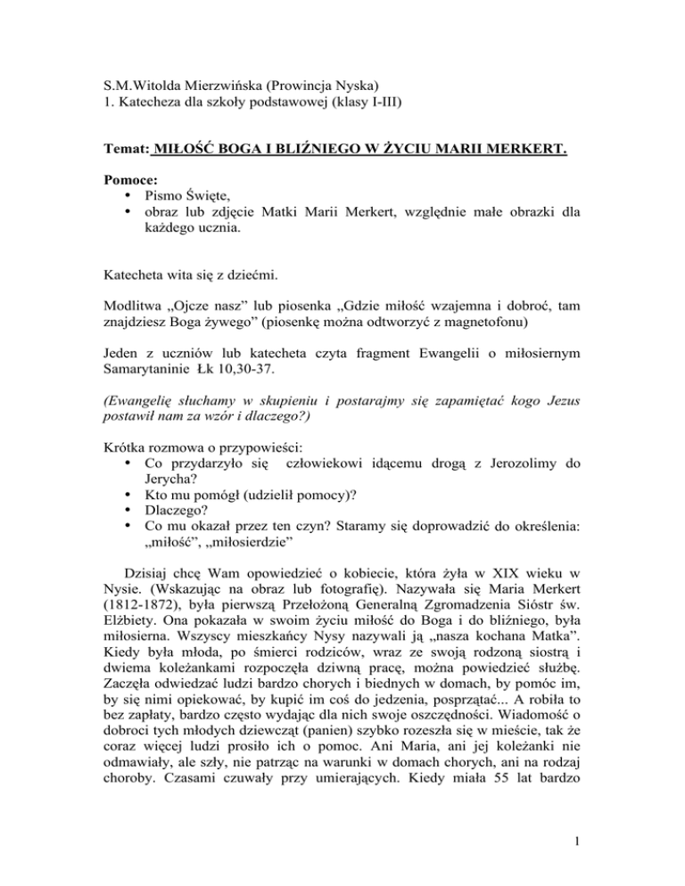 S.M.Witolda Mierzwiska (Prowincja Nyska) 1. Katecheza dla szkoy podstawowej (klasy I-III) Temat: MIO BOGA I BLINIEGO W YCIU MARII MERKERT. Pomoce: • Pismo wite, • obraz lub zdjcie Matki Marii Merkert, wzgldnie mae obrazki dla kadego ucznia. Katecheta wita si z dziemi. Modlitwa „Ojcze nasz” lub piosenka „Gdzie mio wzajemna i dobro, tam znajdziesz Boga ywego” (piosenk mona odtworzy z magnetofonu) Jeden z uczniów lub katecheta czyta fragment Ewangelii o miosiernym Samarytaninie k 10,30-37. (Ewangeli suchamy w skupieniu i postarajmy si zapamita kogo Jezus postawi nam za wzór i dlaczego?) Krótka rozmowa o przypowieci: • Co przydarzyo si czowiekowi idcemu drog z Jerozolimy do Jerycha? • Kto mu pomóg (udzieli pomocy)? • Dlaczego? • Co mu okaza przez ten czyn? Staramy si doprowadzi do okrelenia: „mio”, „miosierdzie” Dzisiaj chc Wam opowiedzie o kobiecie, która ya w XIX wieku w Nysie. (Wskazujc na obraz lub fotografi). Nazywaa si Maria Merkert (1812-1872), bya pierwsz Przeoon Generaln Zgromadzenia Sióstr w. Elbiety. Ona pokazaa w swoim yciu mio do Boga i do bliniego, bya miosierna. Wszyscy mieszkacy Nysy nazywali j „nasza kochana Matka”. Kiedy bya moda, po mierci rodziców, wraz ze swoj rodzon siostr i dwiema koleankami rozpocza dziwn prac, mona powiedzie sub. Zacza odwiedza ludzi bardzo chorych i biednych w domach, by pomóc im, by si nimi opiekowa, by kupi im co do jedzenia, posprzta... A robia to bez zapaty, bardzo czsto wydajc dla nich swoje oszczdnoci. Wiadomo o dobroci tych modych dziewczt (panien) szybko rozesza si w miecie, tak e coraz wicej ludzi prosio ich o pomoc. Ani Maria, ani jej koleanki nie odmawiay, ale szy, nie patrzc na warunki w domach chorych, ani na rodzaj choroby. Czasami czuway przy umierajcych. Kiedy miaa 55 lat bardzo 1 zachorowa a i 14 listopada 1872 roku umar a. W czasie ksidz powiedzia takie s owa: (Tekst rozpisany na kartkach dla kadego dziecka: katecheta czyta g ono, dzieci w milczeniu ledz tekst). Ona, przez 30 lat uwaaa za swoje najmilsze zajcie koi miujc rk rany ciaa i duszy. Ona, ocieraa zy... Jej ucho byo otwarte na kad skarg. Miociwym okiem spogldaa na cierpienia drugich, a sowa jej byy zawsze sodk pociech, gdy z serca pochodziy i do serca trafiay. Krótki czas do zastanowienie si nad tekstem. Dialog z dziemi w formie pyta i odpowiedzi: • Jaka by a Matka Maria? • Za jakie czyny Jezus pochwali by j? • Co wy moecie zrobi, by zas uy na pochwa Jezusa? • Jakimi mamy by kadego dnia? Zapis tematu: Mi o Boga i bliniego w yciu Marii Merkert. Otrzymany tekst wklei do zeszytu. Zadanie do domu: Co zrobi, aby okaza mi o do Boga i do ludzi (jeden konkretny czyn, mona napisa lub narysowa i koniecznie spe ni). 2 S .M .Damaris Rogowska, S. M .Anna Romanowska, S .M .Damiana Kowalczyk (Prowincja Wroc awska) 2. Katecheza dla szko y podstawowej (klasy I-III) Temat: KOCHAMY PANA JEZUSA TAK JAK MATKA MERKERT. MARIA Cel dydaktyczny: ukazanie czynów mi osiernych i ich realizacji w yciu i dzia alnoci Matki Marii Merkert. Cel wychowawczy: kszta towanie postawy ofiarnoci i mi osierdzia wobec bliniego w codziennym yciu. rodki dydaktyczne: • Pismo wite, teksty fragmentu Mt 25, 31 – 40, • wizerunek Matki Marii Merkert, • arkusz brystolu, • kredki, pisaki, noyczki, klej, • kolorowe gazety, kartki z bloku WIDZIE • Modlitwa na rozpoczcie: piosenka „Bóg potrzebuje ciebie…” • Wprowadzenie w tematyk katechezy: opowiadanie B. Ferrero, „Historie”, pt.: „Tosia i wróka”, s. 189; pogadanka. • Krótkie przedstawienie ycia i dzia alnoci Matki Marii Mekert. • Zapis tematu katechezy i krótkiej notatki o yciu Matki Marii Merkert. OCENIA • Uroczyste odczytanie fragmentu z Pisma witego: Mt 25, 31 – 40. • Analiza tekstu w wietle ycia i dzia alnoci Matki Marii Merkert. • Praca w grupach: dzieci w grupach, na brystolu, pocitym w puzzle, ilustruj us yszany tekst (kada grupa ma przedstawi jeden wybrany uczynek mi osierny, który spe nia a Matka Mariia Merkert). • Prezentacja prac na forum klasy. DZIAA • Przedstawienie w zarysie dzia alnoci Sióstr Elbietanek naladujcych Matk Mari Merkert. • Rozmowa dziemi na temat; „W jaki sposób w dzisiejszym wiecie mog naladowa Chrystusa wpatrujc si w posta Matki Marii Merkert”. • Opowiadanie B. Ferrero „Inne historie” pt: „Rce Jezusa” s. 102. 3 • Zadanie domowe: uoenie modlitwy za przyczyn Matki Marii Merkert w intencji ludzi potrzebuj cych pomocy. • Modlitwa kocowa: piosenka „ My jestemy na ziemi wiatem Twym…”. 4 S. M. Adriana Oko (Prowincja Toruska) 3. Katecheza dla szkoy podstawowej (klasy I-III) Temat: PRZYKAD MARII MERKERT ZACHCA NAS DO MIOWANIA BOGA I BLI NIEGO. Cel ogólny: ukazanie sylwetki wspózaoycielki Zgromadzenia Sióstr w. Elbiety Matki Marii Merkert. Cel szczegóowy: • ucze podaje co robia Matka Maria Merkert, • objania w jaki sposób moemy pomaga ludziom, • wnioskuje, e poprzez pomoc bliniemu wyraamy nasz mio do Boga. rodki dydaktyczne: • kostiumy do dramy, • obrazki przedstawiajce Matk Mari Merkert, • plansza do krzyówki, • koperta z hasami do krzyówki, • mapa Polski. Metody: • drama, • opowiadanie, • zadania stawiane do wykonania. WPROWADZENIE Modlitwa wstpna: „Ojcze nasz..." Nikt z nas nie lubi, ani nie chce by sam. Jeeli kto przebywa z nami, opiekuje si nami -jest nam dobrze, jestemy radoni. Jednak s ludzie, którzy s samotni, biedni, i tacy potrzebuj pomocy. wit, która pomagaa innym ju znacie..... teraz przypomni wam j scenka. (Wybrane dzieci odgrywaj dram na podstawie ksiki „Chleb i róe", ukazujc kilka momentów z ycia w. Elbiety.) - Jak ma na imi ta wita, która w odlegych czasach pomagaa innym? Kim si opiekowaa, o kogo si troszczya? - Tak, to w. Elbieta. W lad za ni poszy take inne osoby. ROZWINICIE Dzisiaj chciaabym przedstawi wam inn posta, która podobnie jak w. Elbieta pomagaa biednym i tym, którzy potrzebowali pomocy. Zanim wam o niej opowiem, zabawimy si. Przygotowaam dla was krzyówk, po rozwiz