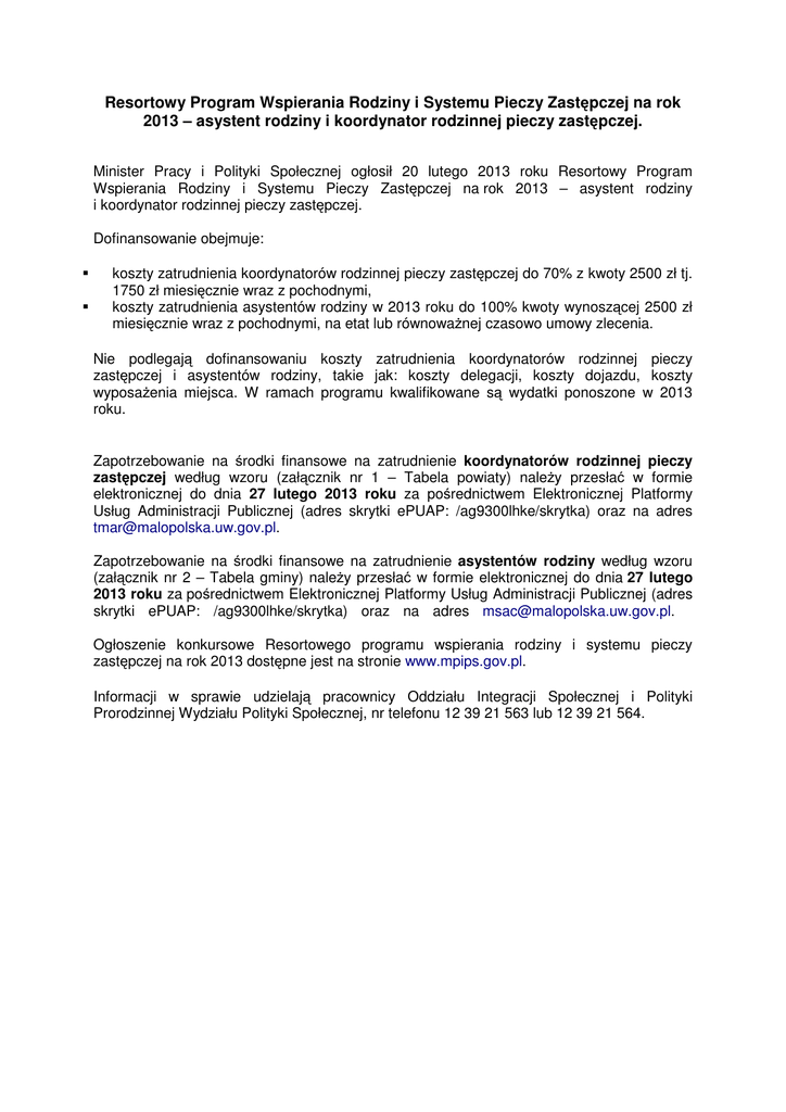 Resortowy Program Wspierania Rodziny i Systemu Pieczy Zastępczej na rok 2013 – asystent rodziny i koordynator rodzinnej pieczy zastępczej. Minister Pracy i Polityki Społecznej ogłosił 20 lutego 2013 roku Resortowy Program Wspierania Rodziny i Systemu Pieczy Zastępczej na rok 2013 – asystent rodziny i koordynator rodzinnej pieczy zastępczej. Dofinansowanie obejmuje: koszty zatrudnienia koordynatorów rodzinnej pieczy zastępczej do 70% z kwoty 2500 zł tj. 1750 zł miesięcznie wraz z pochodnymi, koszty zatrudnienia asystentów rodziny w 2013 roku do 100% kwoty wynoszącej 2500 zł miesięcznie wraz z pochodnymi, na etat lub równoważnej czasowo umowy zlecenia. Nie podlegają dofinansowaniu koszty zatrudnienia koordynatorów rodzinnej pieczy zastępczej i asystentów rodziny, takie jak: koszty delegacji, koszty dojazdu, koszty wyposażenia miejsca. W ramach programu kwalifikowane są wydatki ponoszone w 2013 roku. Zapotrzebowanie na środki finansowe na zatrudnienie koordynatorów rodzinnej pieczy zastępczej według wzoru (załącznik nr 1 – Tabela powiaty) należy przesłać w formie elektronicznej do dnia 27 lutego 2013 roku za pośrednictwem Elektronicznej Platformy Usług Administracji Publicznej (adres skrytki ePUAP: /ag9300lhke/skrytka) oraz na adres [email protected]. Zapotrzebowanie na środki finansowe na zatrudnienie asystentów rodziny według wzoru (załącznik nr 2 – Tabela gminy) należy przesłać w formie elektronicznej do dnia 27 lutego 2013 roku za pośrednictwem Elektronicznej Platformy Usług Administracji Publicznej (adres skrytki ePUAP: /ag9300lhke/skrytka) oraz na adres [email protected]. Ogłoszenie konkursowe Resortowego programu wspierania rodziny i systemu pieczy zastępczej na rok 2013 dostępne jest na stronie www.mpips.gov.pl. Informacji w sprawie udzielają pracownicy Oddziału Integracji Społecznej i Polityki Prorodzinnej Wydziału Polityki Społecznej, nr telefonu 12 39 21 563 lub 12 39 21 564.